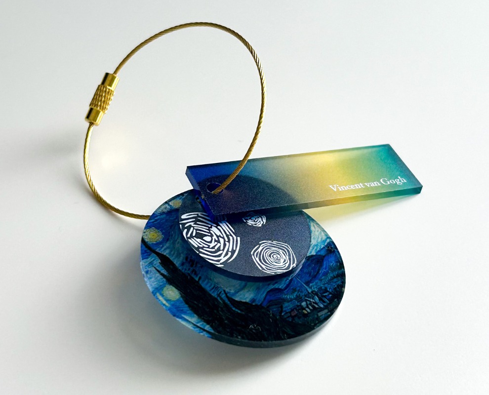 透明感のあるアクリルにゴッホの名画を閉じ込めたキーホルダー。光の角度で表情が変わり、バッグやポーチのアクセントに最適です。名画チャーム、丸型チャーム、色彩グラデーションの縦型チャームの3種類付きで、組み合わせても単体でも楽しめます。