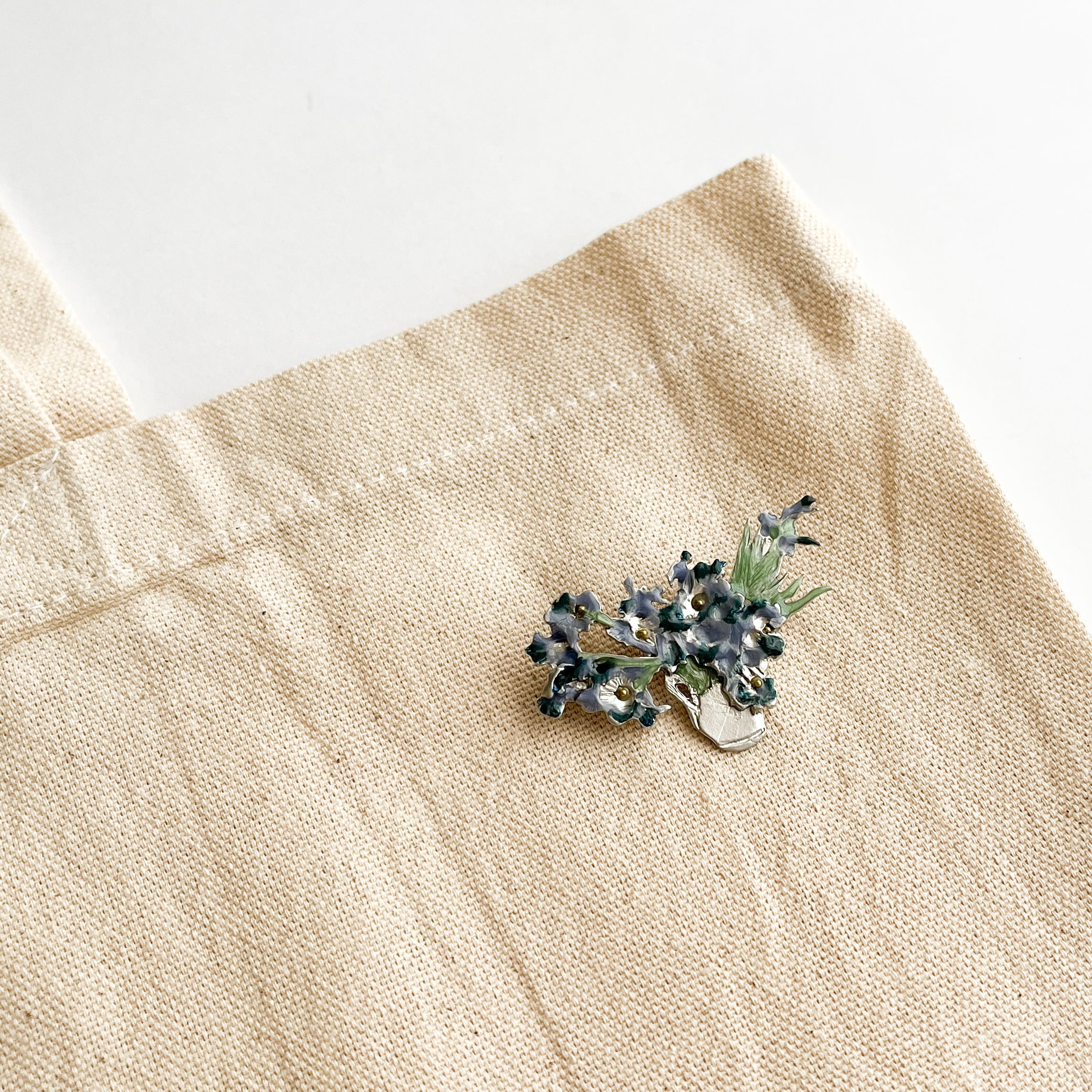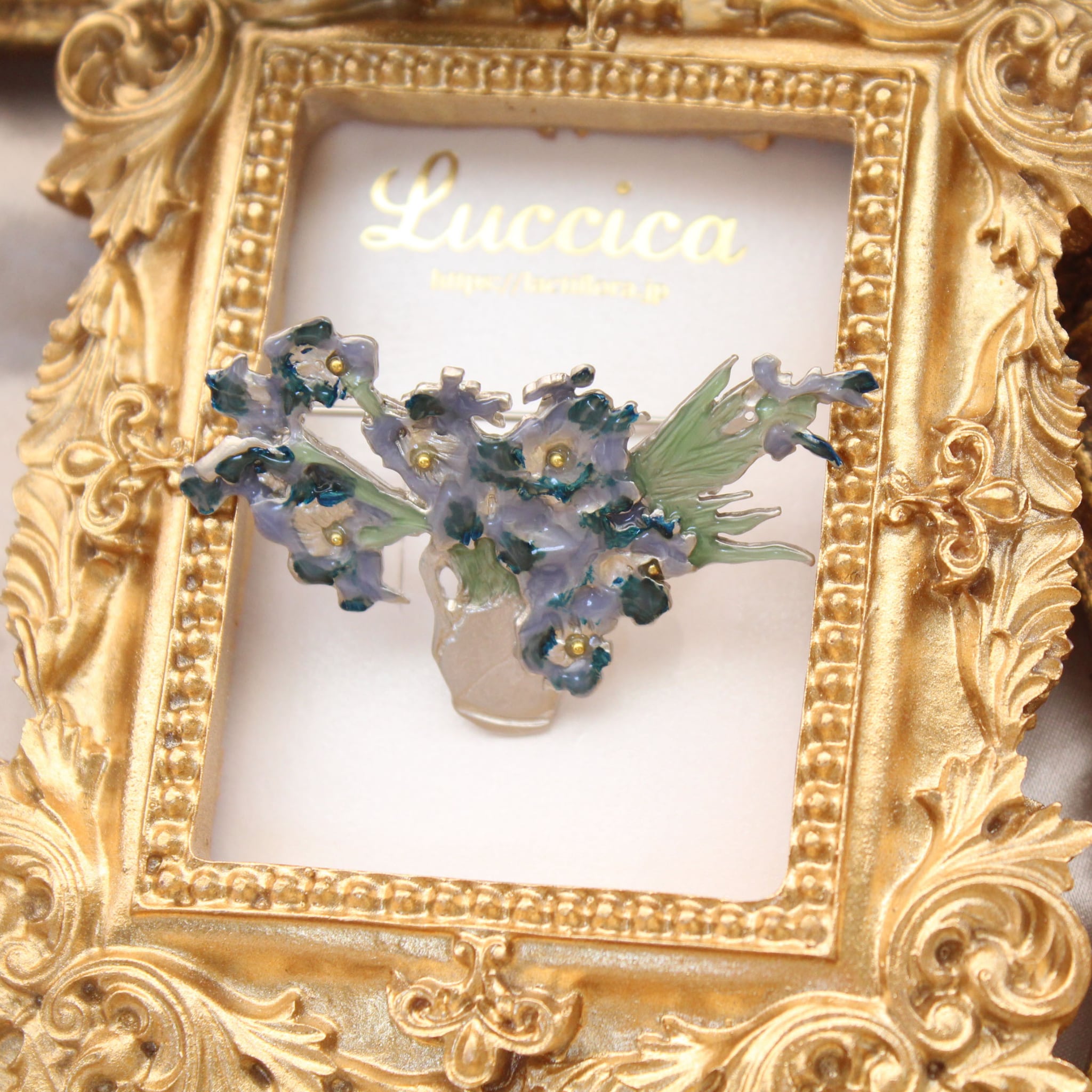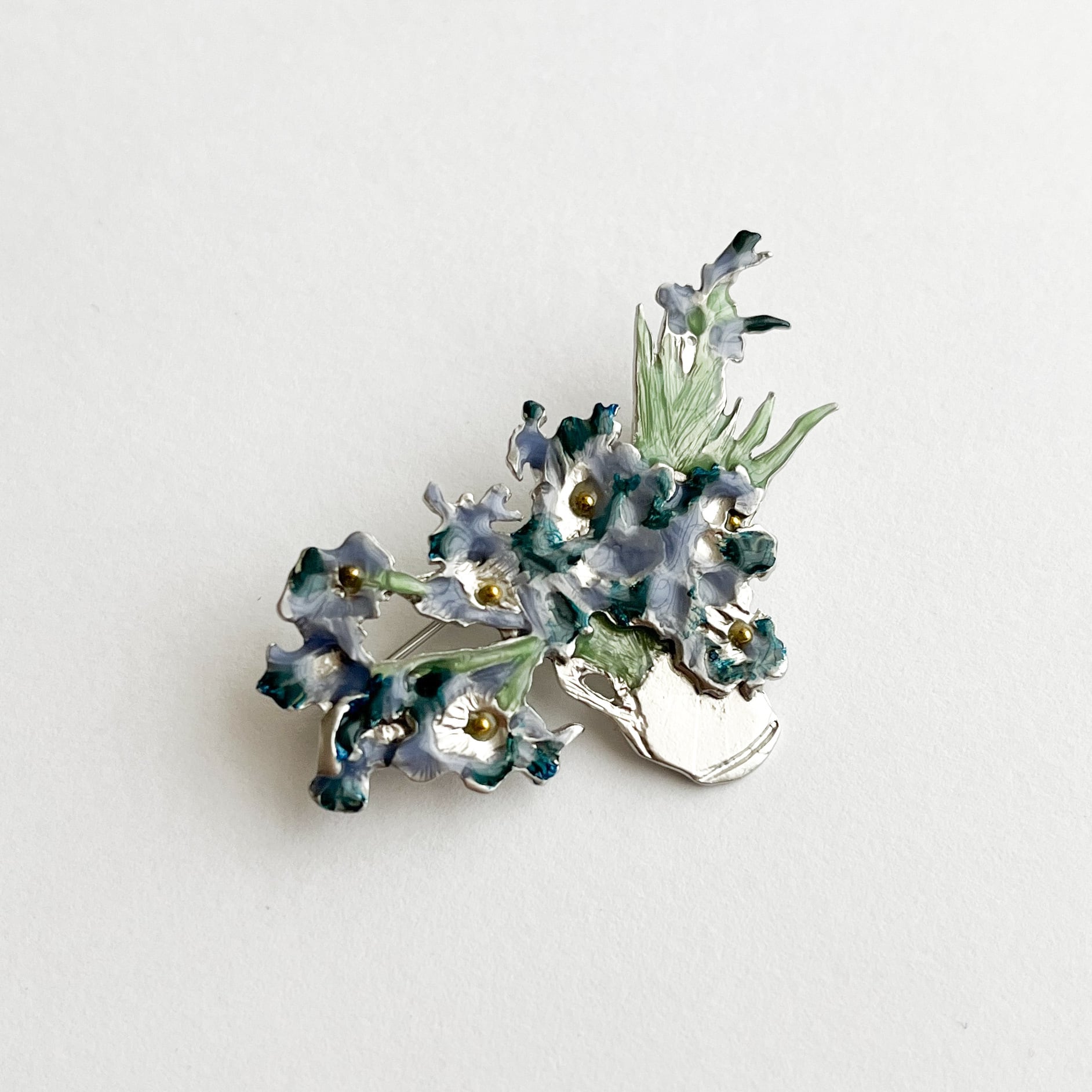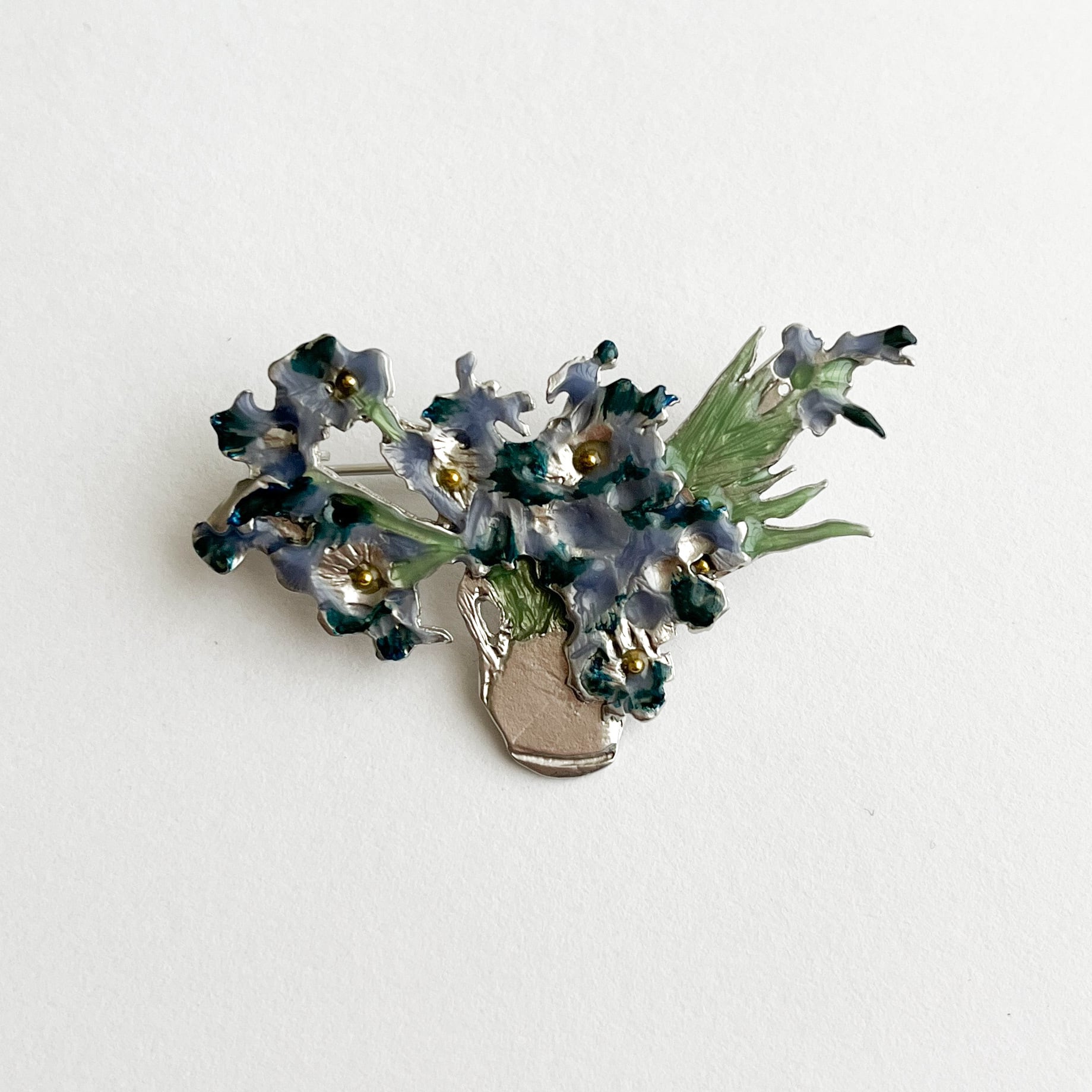 花瓶にたっぷりと生けられたアイリスは、ゴッホが母に送った名画の繊細な色遣いを見事に再現。そこだけゴールドになっている花の中央部分が、キラリと目を惹きます。