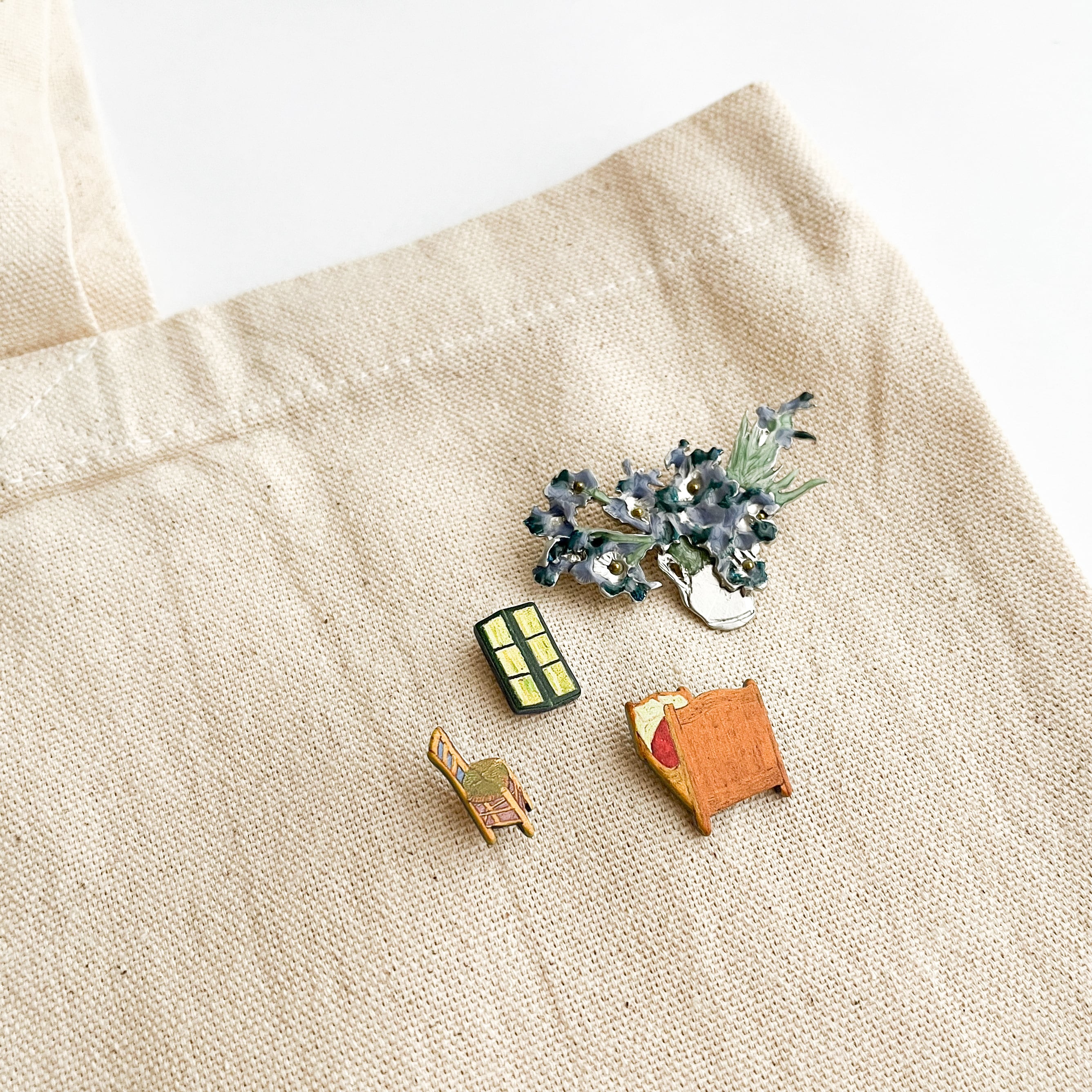 バッグや洋服に付けるだけでなく、ポーチなどの布小物にもさりげなく飾ることができるアイテムです。遠くから見たときのパッと目をひくインパクト、近くでじっくり見たときのユニークで繊細な表現が魅力です。美術館などの特別なおでかけのおともにも、アートを身近に感じる毎日のアイテムとしてもおすすめです。