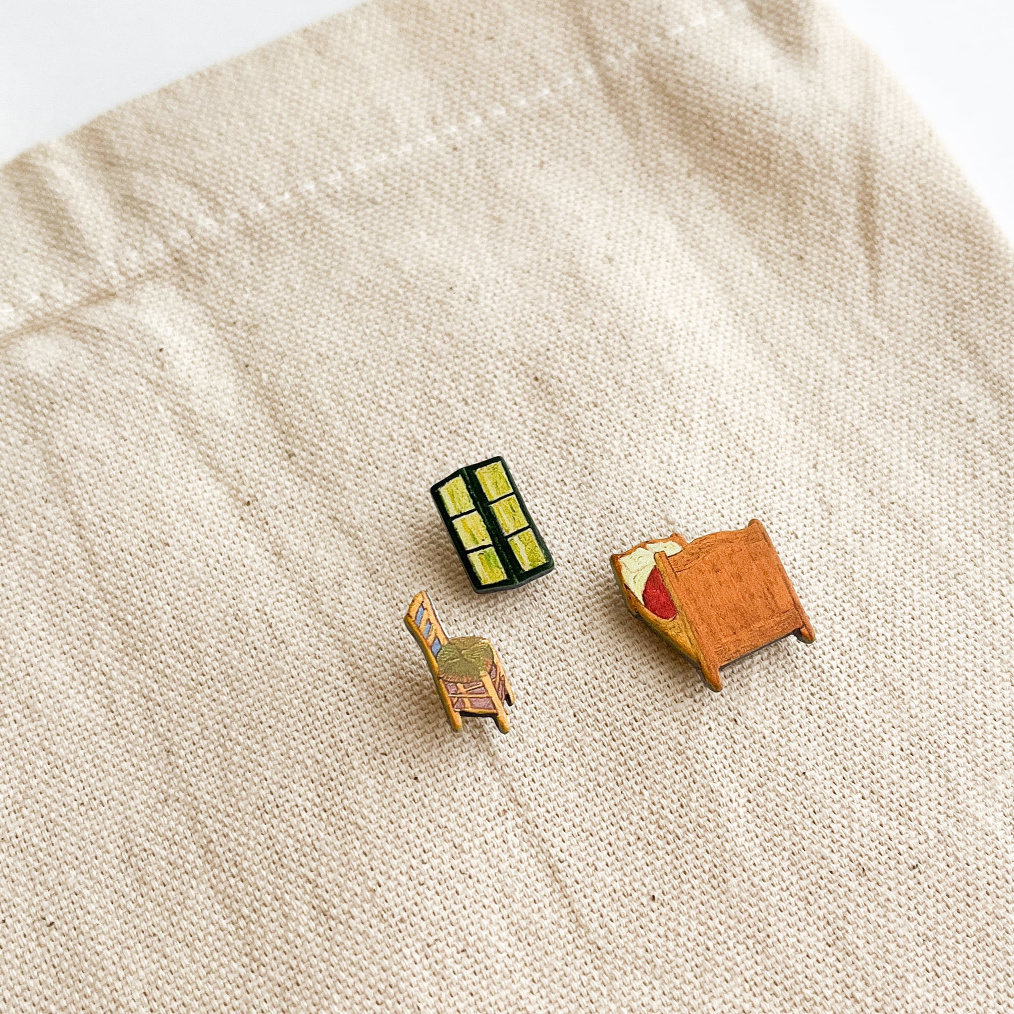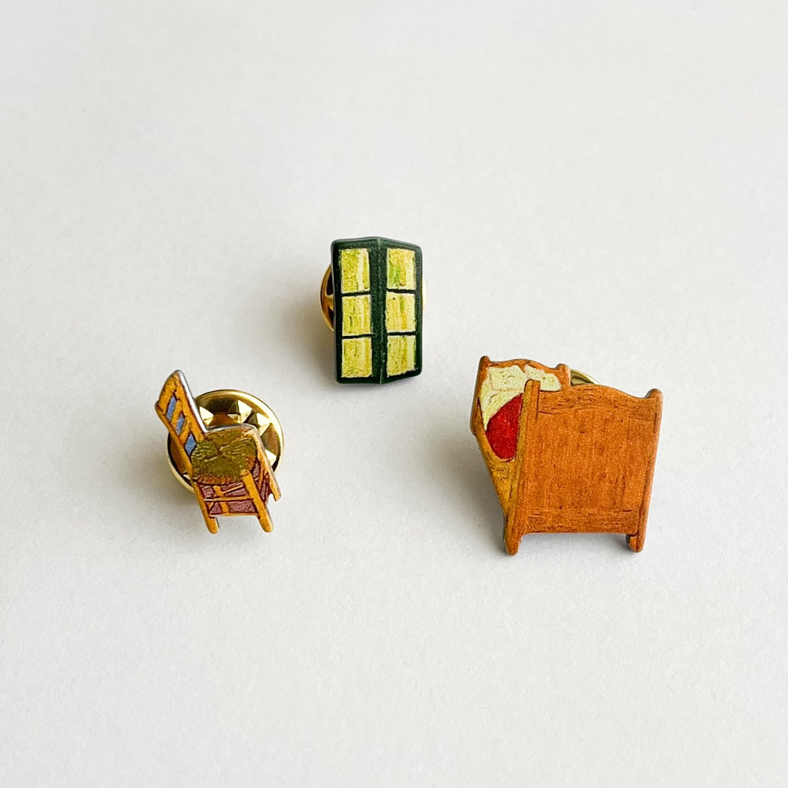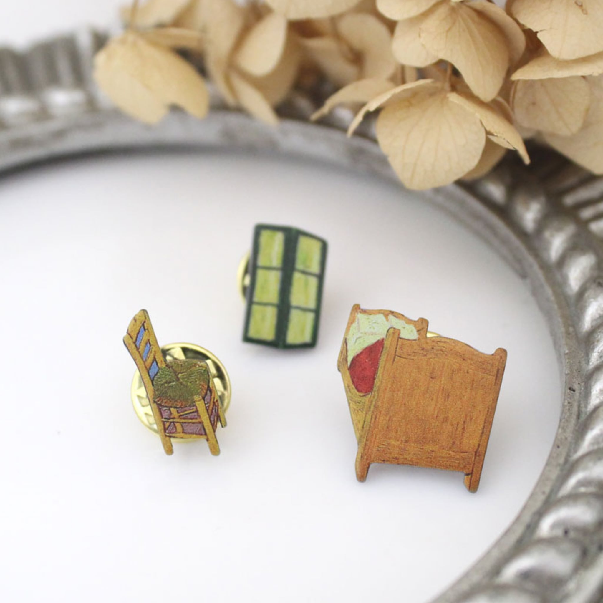 ゴッホの「アルルの寝室」の室内に描かれた家具や窓がブローチになりました。小さめサイズながら精緻なプリントで、ゴッホの筆遣いが感じられるアイテムです。