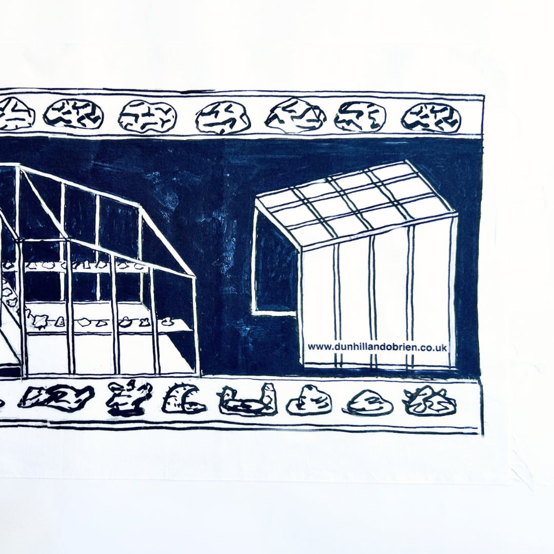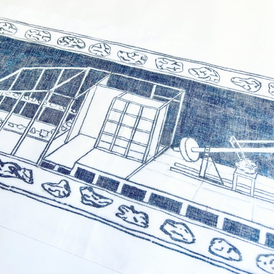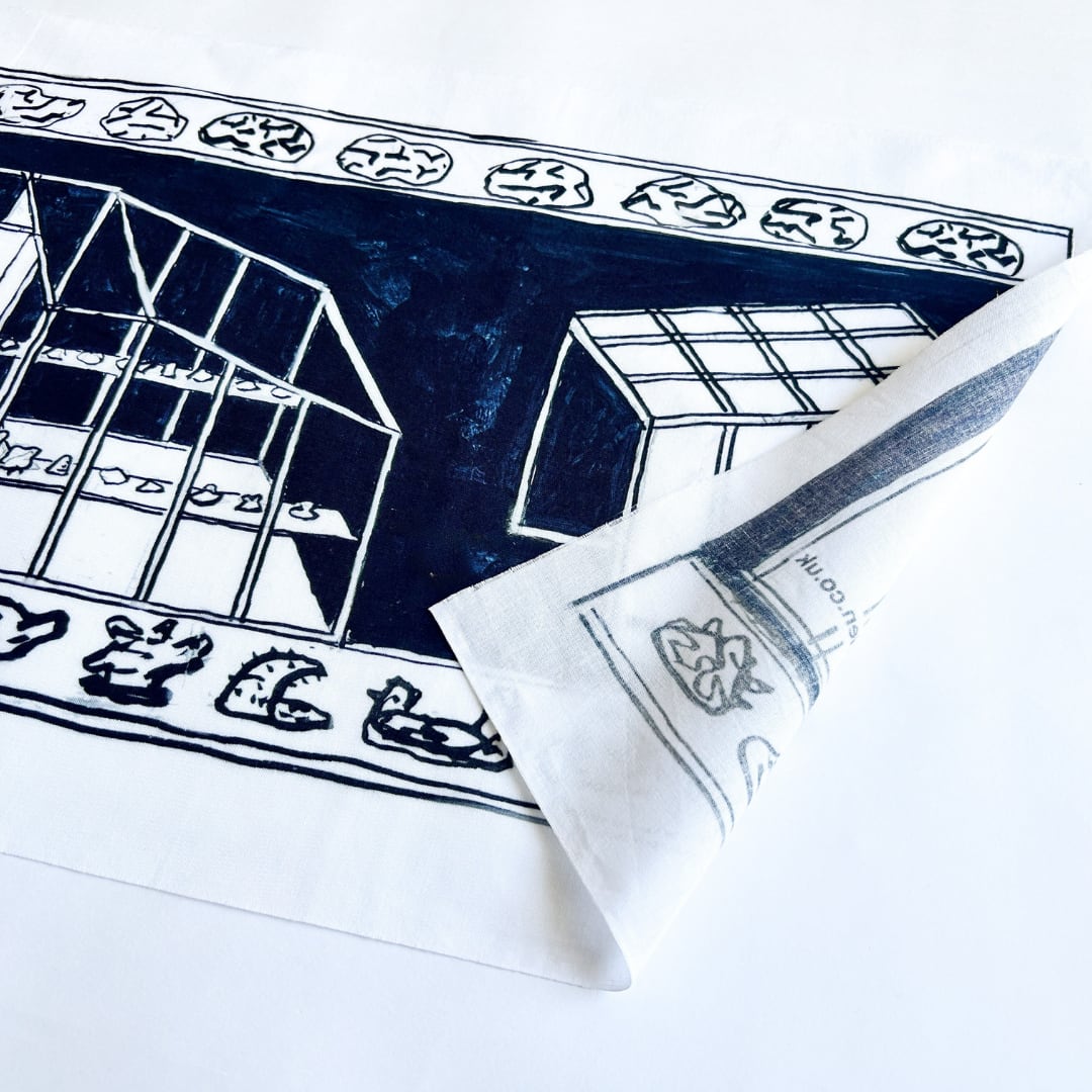 日本の夏といえば手ぬぐい。ハンカチにもタオルにもなる万能なアイテムです。この横長サイズを活かして、隅々まで作品の世界観を楽しめる、DIY展オリジナルのミュージアムグッズです。ダンヒル&オブライエンが本展覧会のために描き下ろしたイラストが、適度な厚みと温かな風合いを持つ綿布の上で生き生きと息づいています。