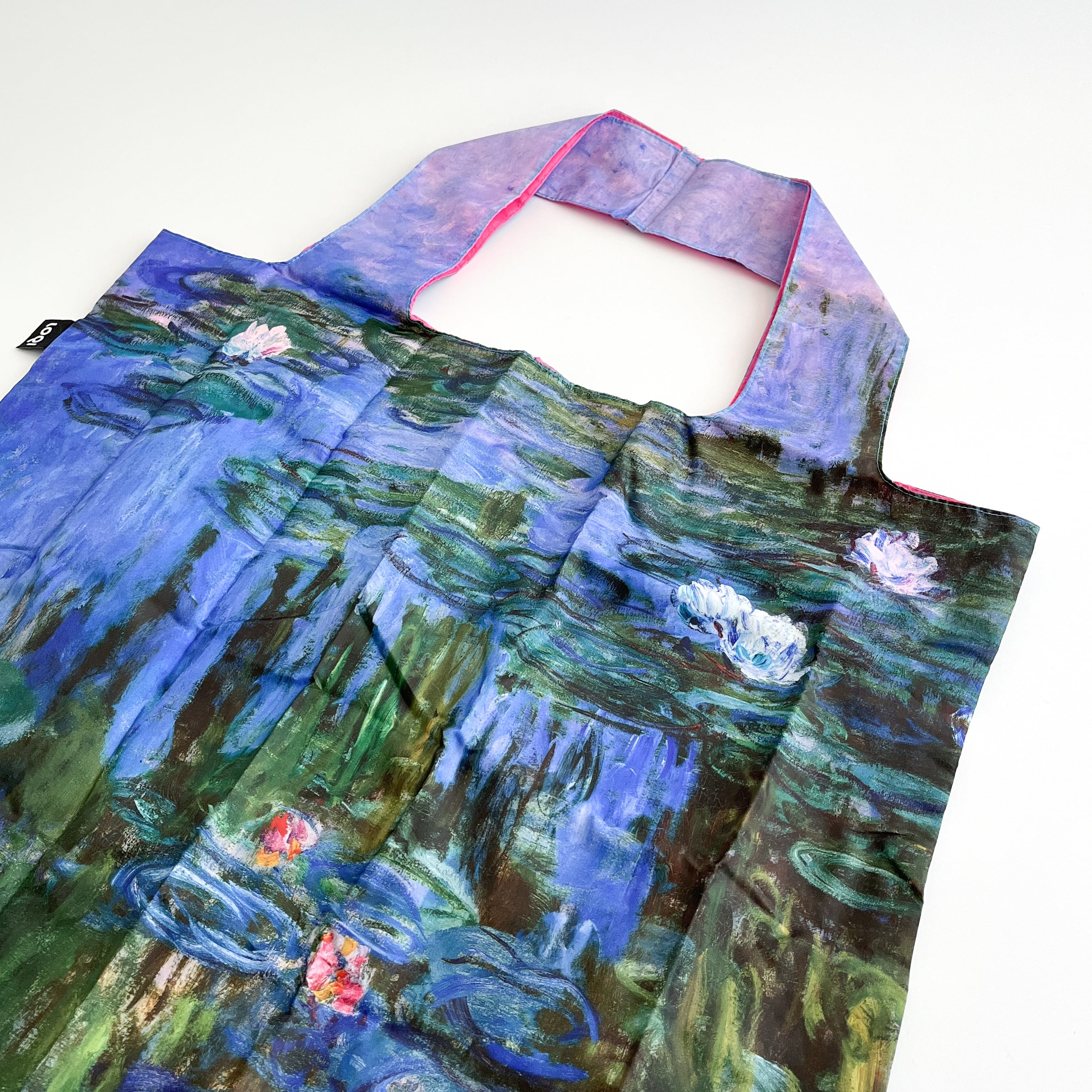 クロード・モネの「睡蓮」がデザインされたエコバッグです。ポリエステル素材なのでお手入れもしやすく、日常使いとして最適。また、買い物用のエコバッグとして常に持ち歩ける軽さで、お買い物にも便利です。A3ファイルもすっぽり入るほどの大きめサイズで、幅広くご利用いただけます。