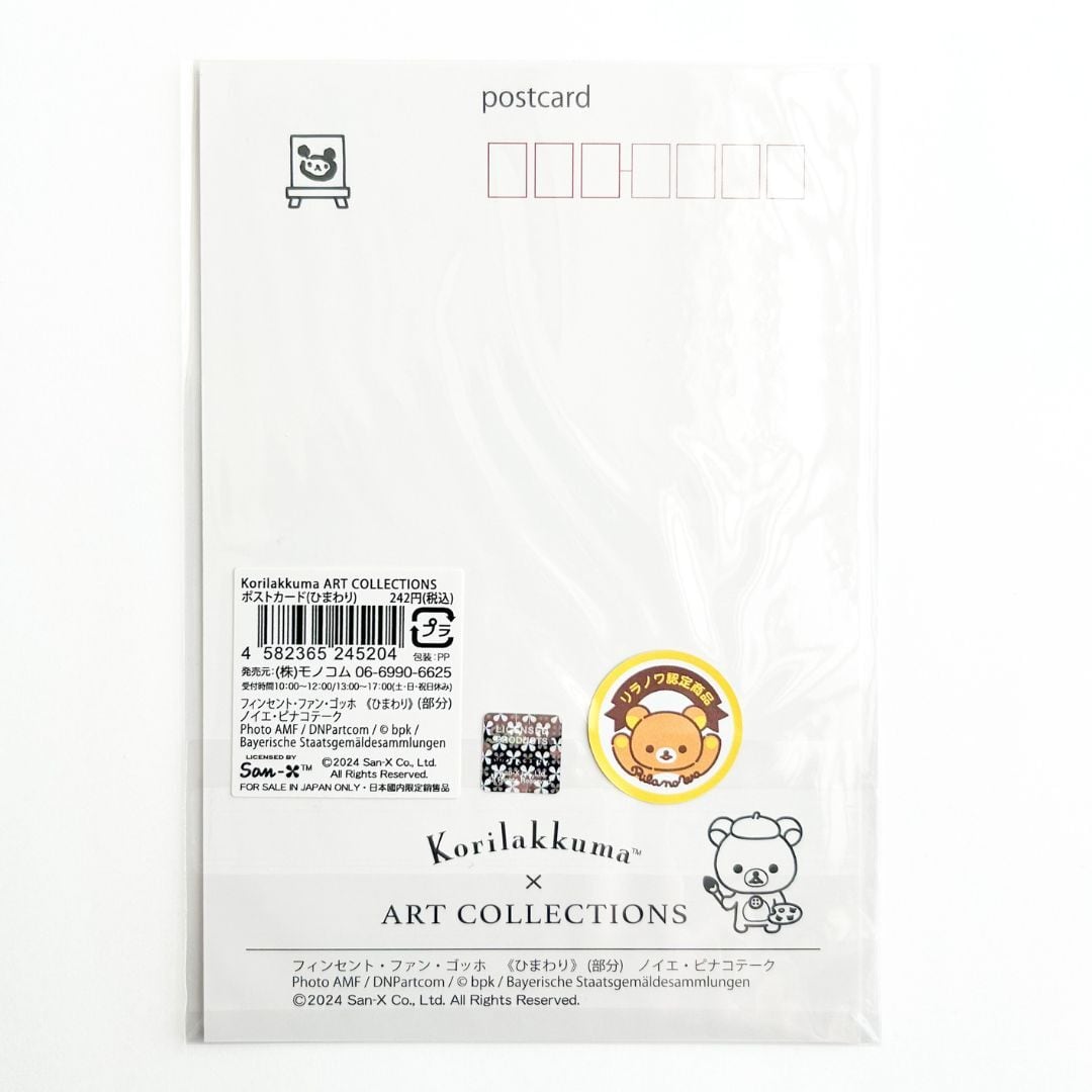 ひまわりの上で寝転ぶコリラックマとチャイロイコグマ、そしてキイロイトリ。よく見ると、くまんばちも飛んでいます。絵に合わせて、キャラクターが淡いタッチで描かれている、可愛らしいポストカードです。