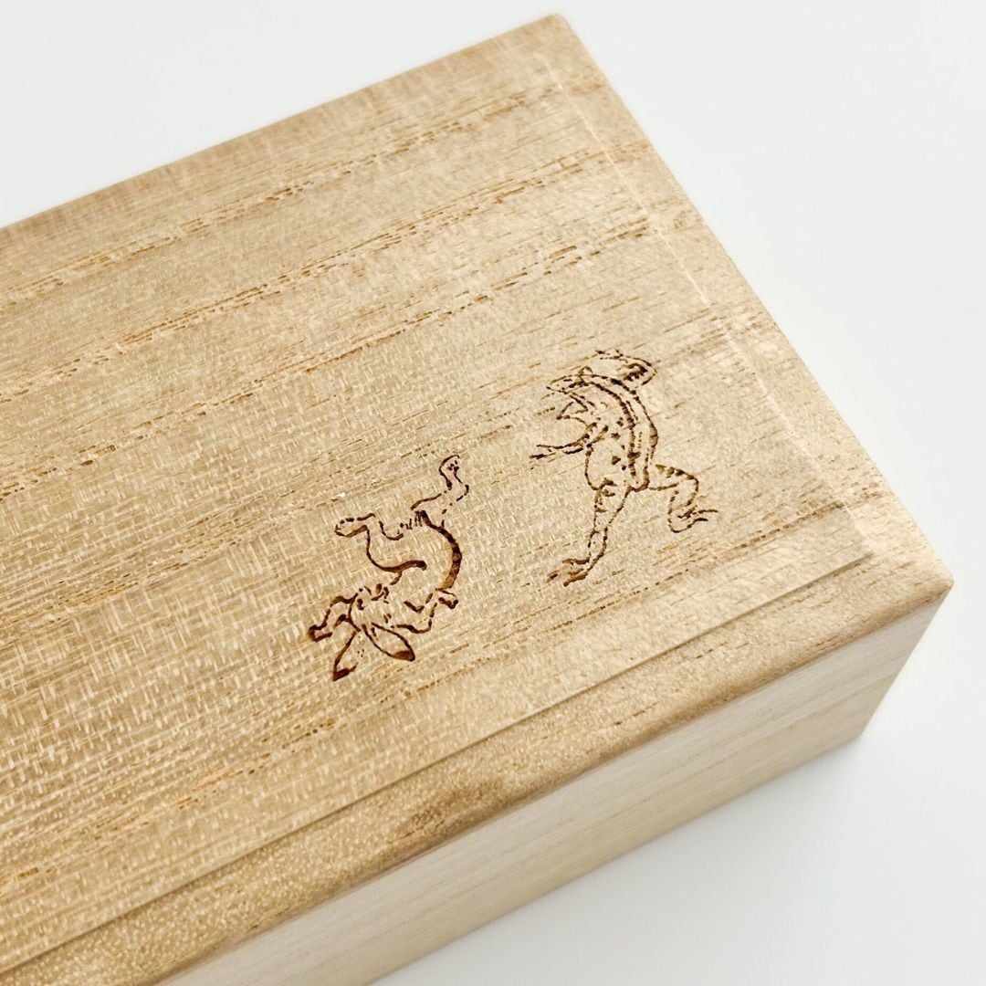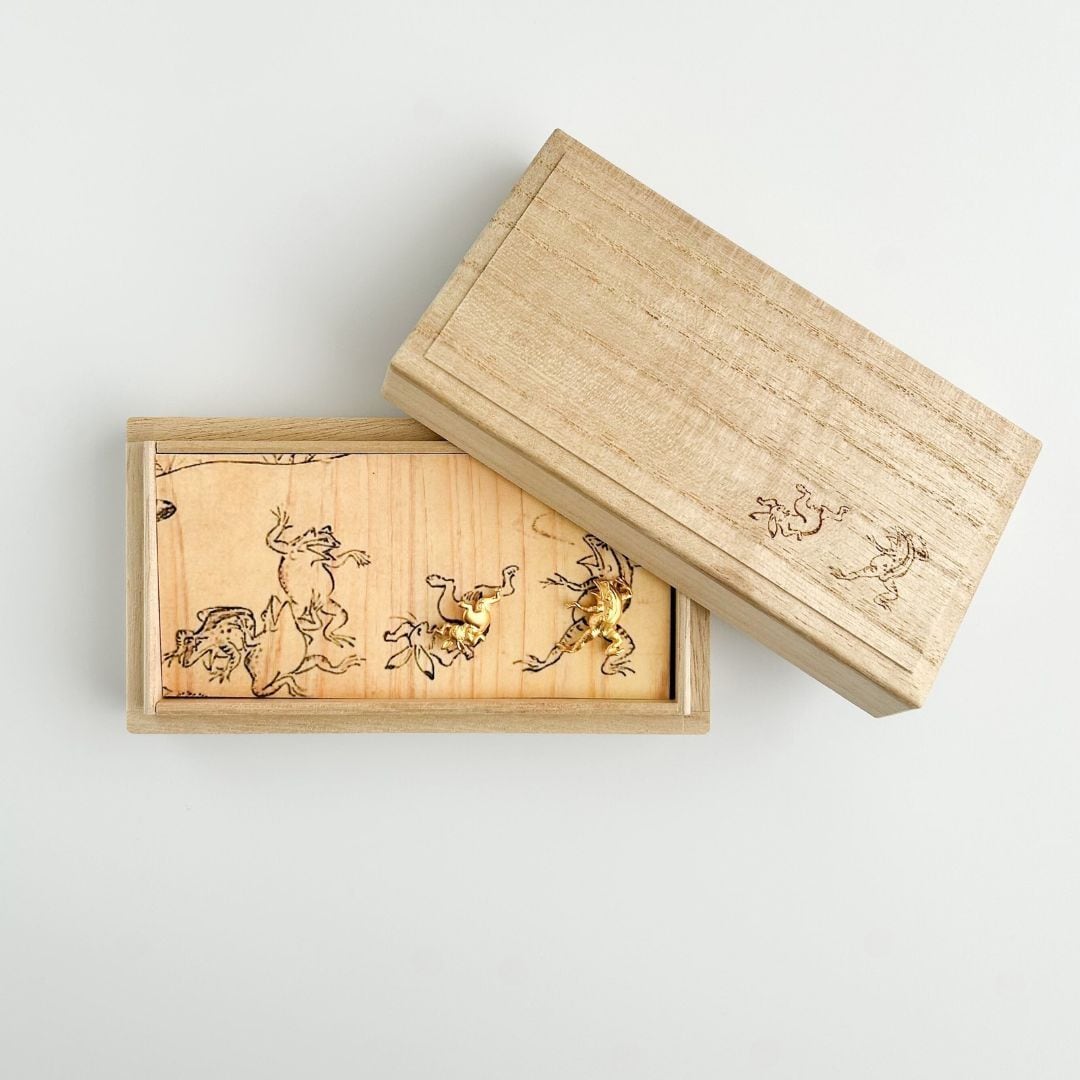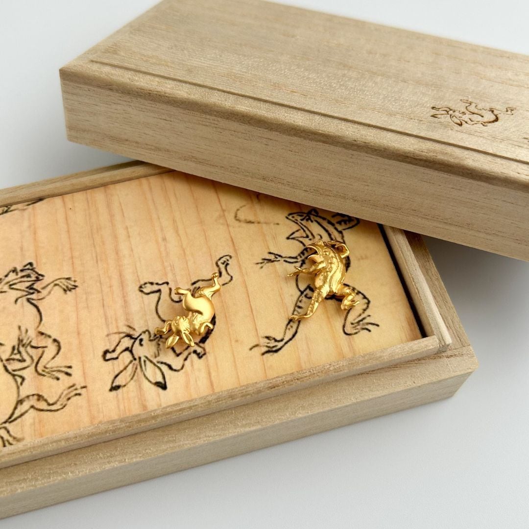 うさぎとかえるの2個セットになっているので、両方付けて名場面を再現したり、片方ずつ誰かとシェアしたり、別々の場所に付けたりして楽しむことも出来ます。贈答にも使える高級感ある化粧箱入りです。