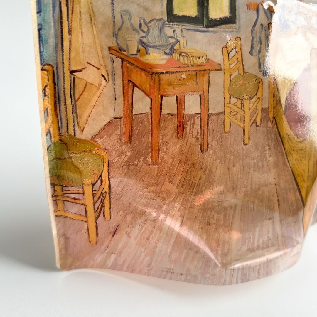 ゴッホの名作をプリントした、透け感のあるジッパーバッグです。開閉式で使い勝手がよく、ギフトや日常の保管に便利です。 表面は透明素材、裏面にはクラフト紙を貼り合わせた異素材の組み合わせがおしゃれ。マチ付きで自立し、ディスプレイにも映えます。繊細な色合いは、中身によって表情が変わるのが魅力です。お菓子や小物の保管はもちろん、贈り物のラッピングとしてもおすすめです。