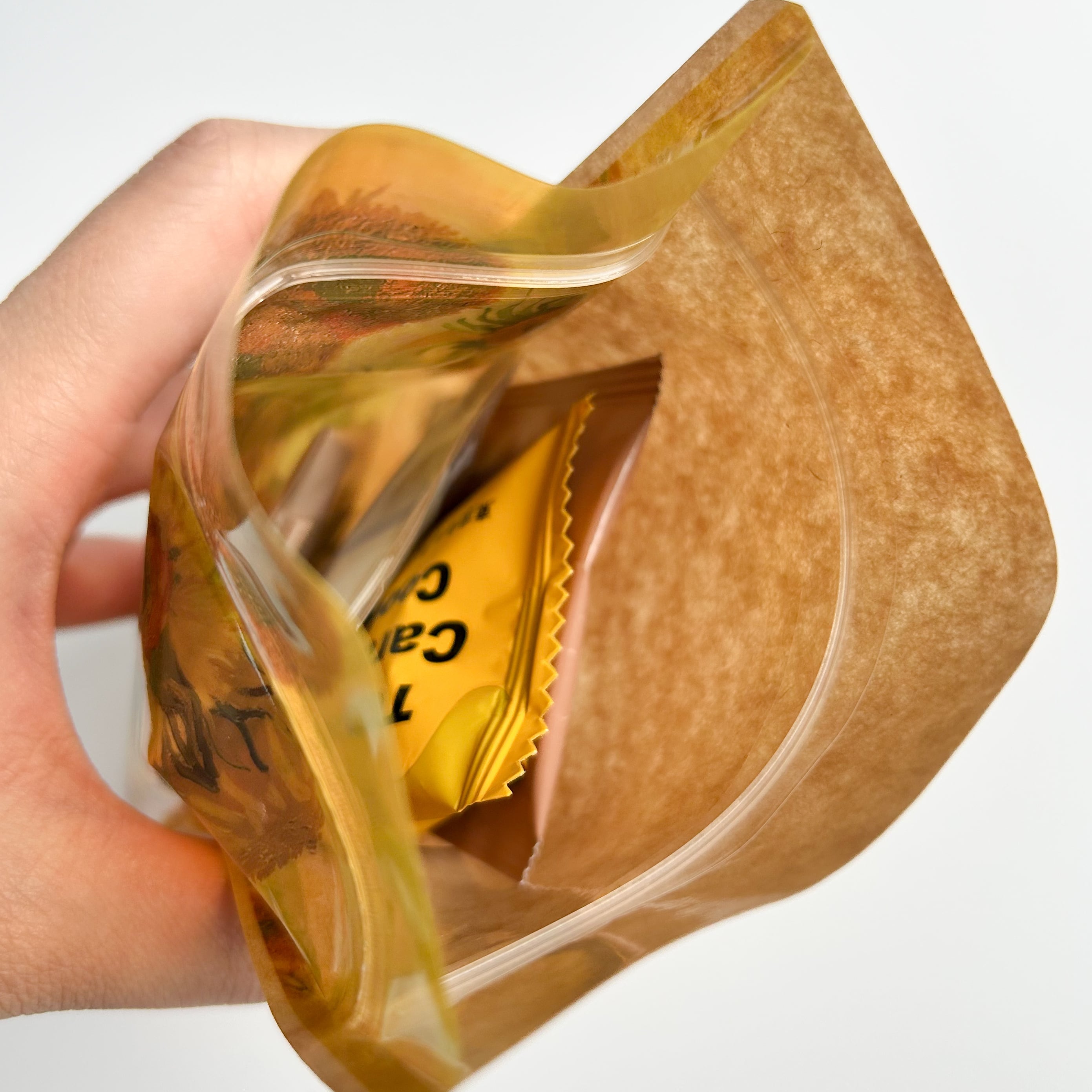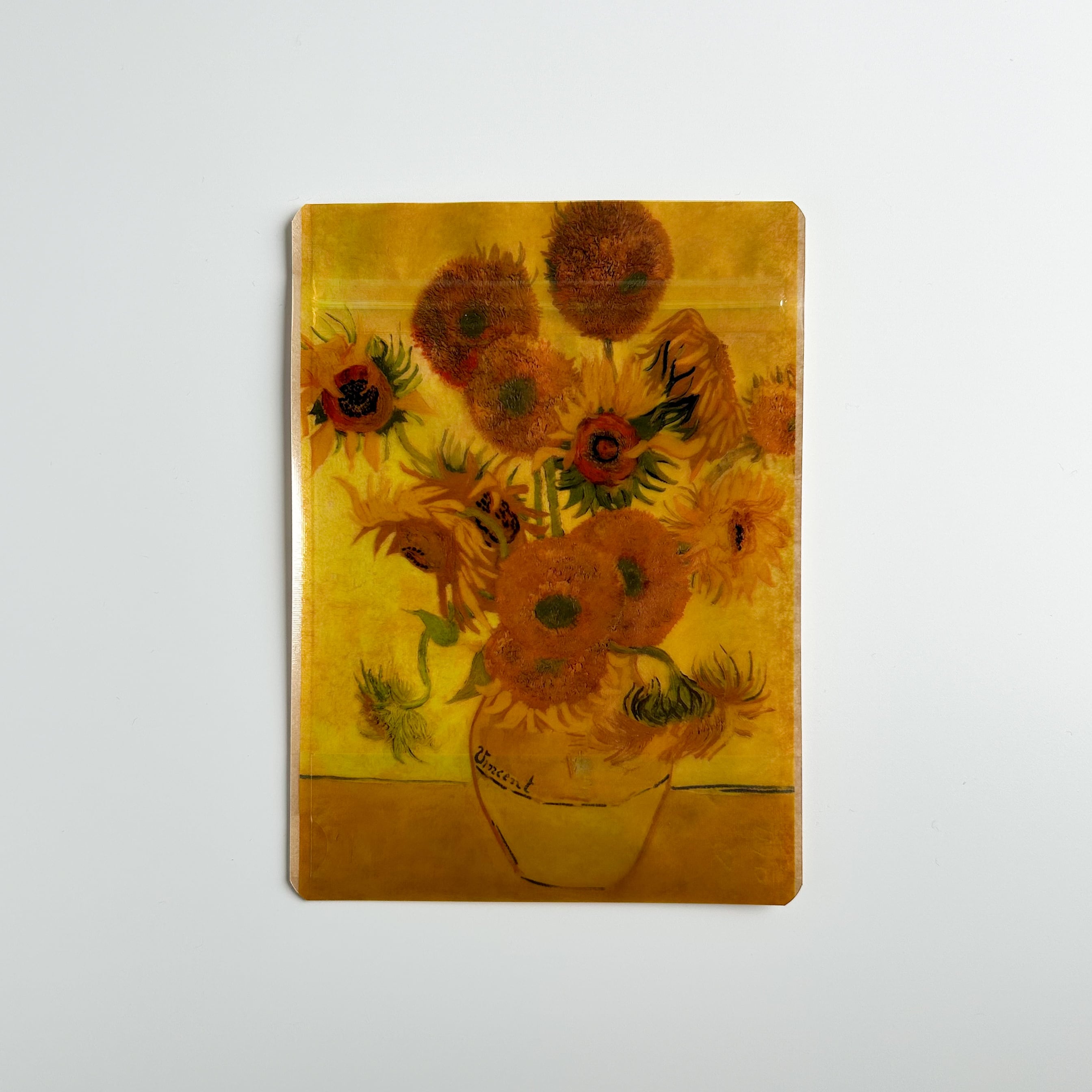 ゴッホの名作をプリントした、透け感のあるジッパーバッグです。開閉式で使い勝手がよく、ギフトや日常の保管に便利です。 表面は透明素材、裏面にはクラフト紙を貼り合わせた異素材の組み合わせがおしゃれ。マチ付きで自立し、ディスプレイにも映えます。繊細な色合いは、中身によって表情が変わるのが魅力です。お菓子や小物の保管はもちろん、贈り物のラッピングとしてもおすすめです。