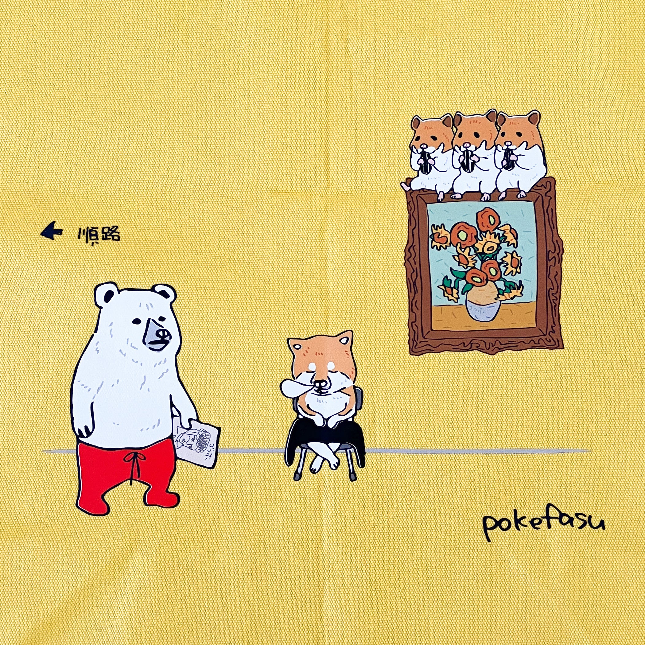 おとぼけ動物キャラクターブランドのpokefasu(ポケファス)から、ゴッホの作品をイメージしたイラストがトートバッグになって登場。サイドにはマチが無く、底のみに船底タイプのマチがあり、A4ファイルもすっぽり。重みや厚みのある図録の持ち帰りにも適している、実用的なミュージアムグッズです。