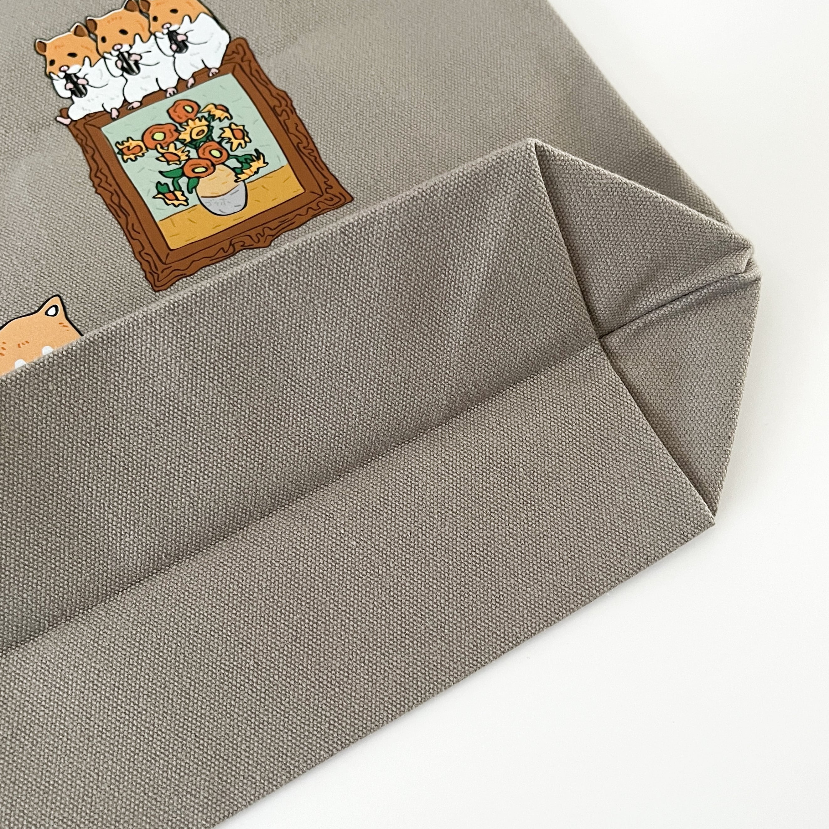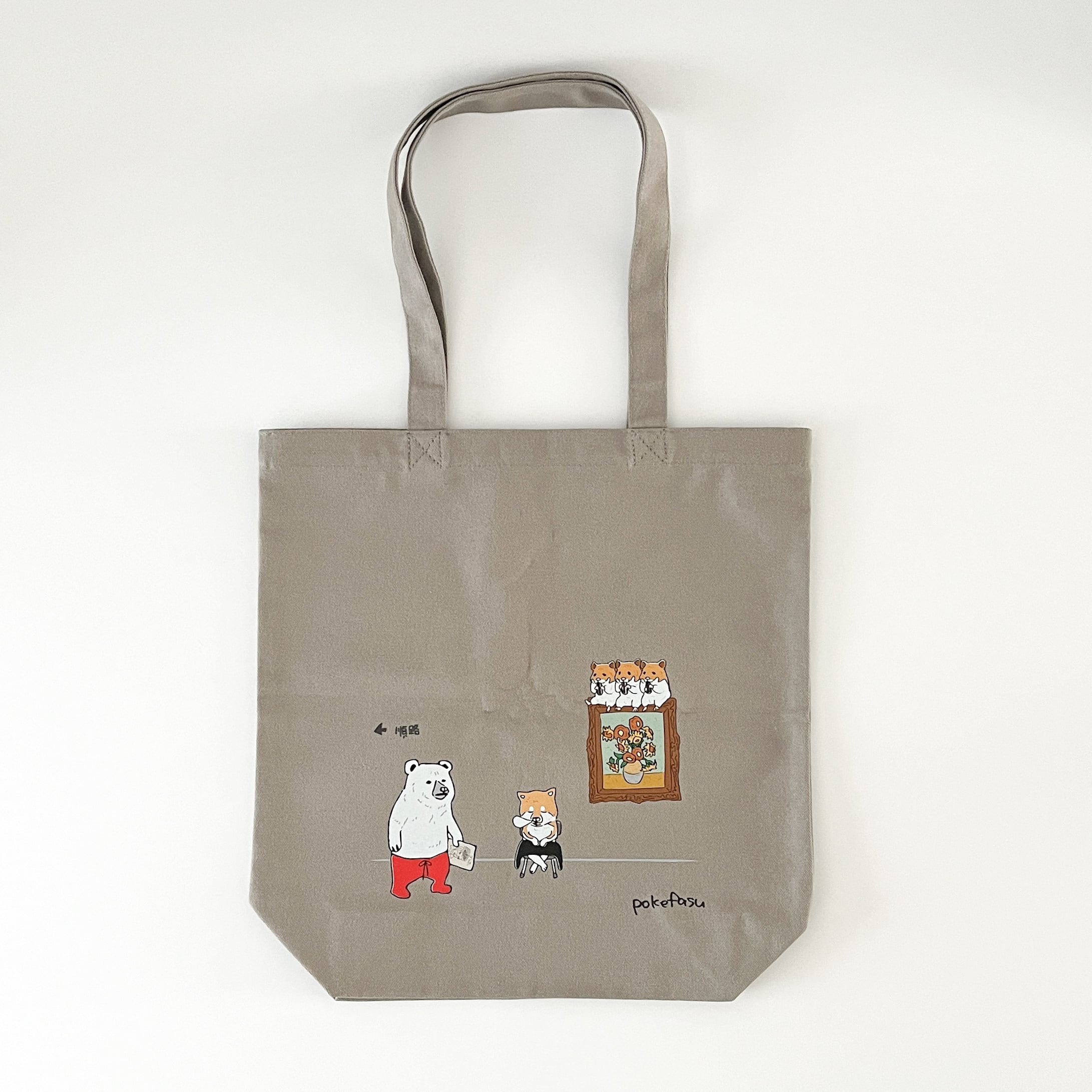 おとぼけ動物キャラクターブランドのpokefasu(ポケファス)から、ゴッホの作品をイメージしたイラストがトートバッグになって登場。サイドにはマチが無く、底のみに船底タイプのマチがあり、A4ファイルもすっぽり。重みや厚みのある図録の持ち帰りにも適している、実用的なミュージアムグッズです。
