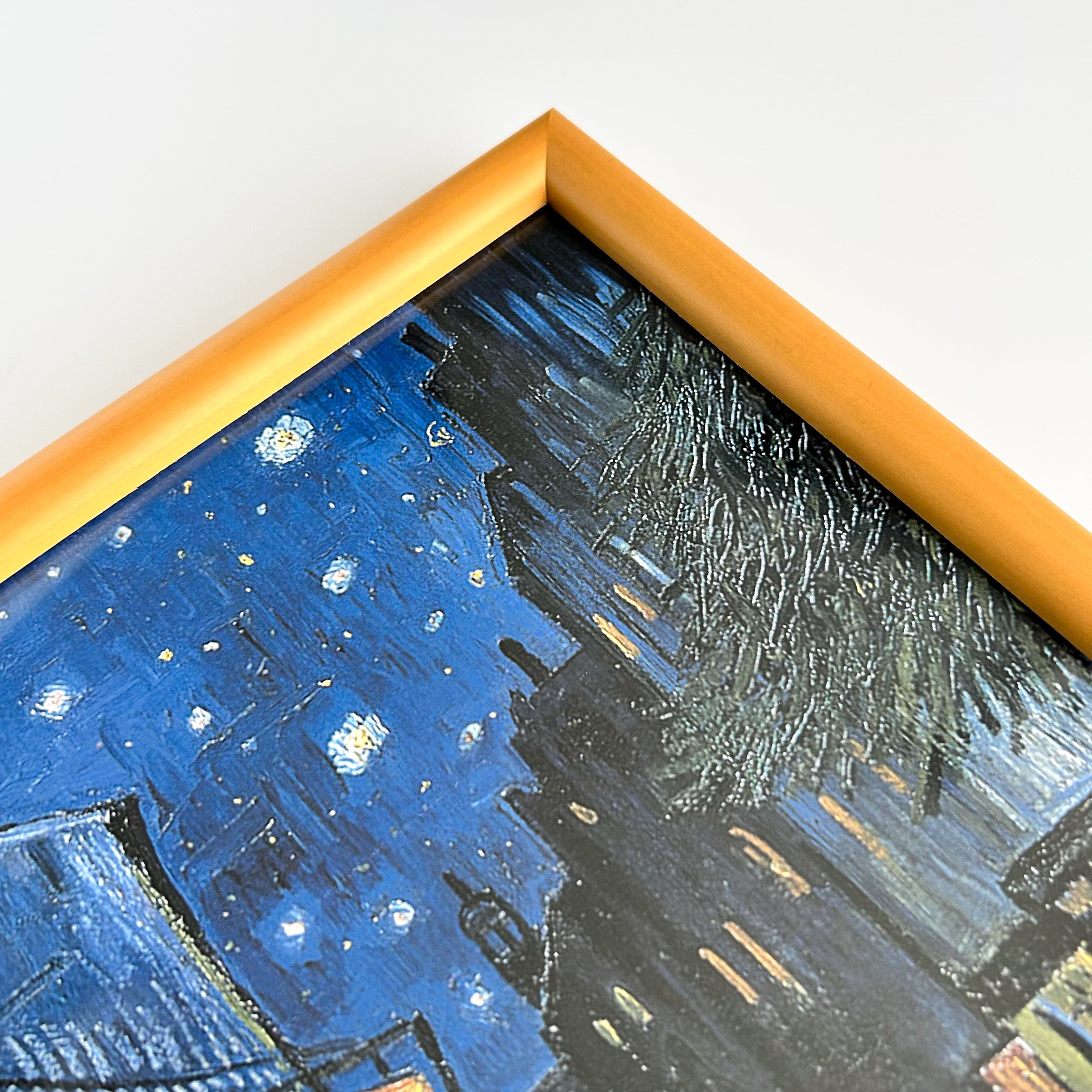 ゴッホの作品「夜のカフェテラス」に合わせてミュージアムショップがセレクトした木製フレームをセットしました。ゴッホの描いた夜空が、お部屋を落ち着いた雰囲気にしてくれます。