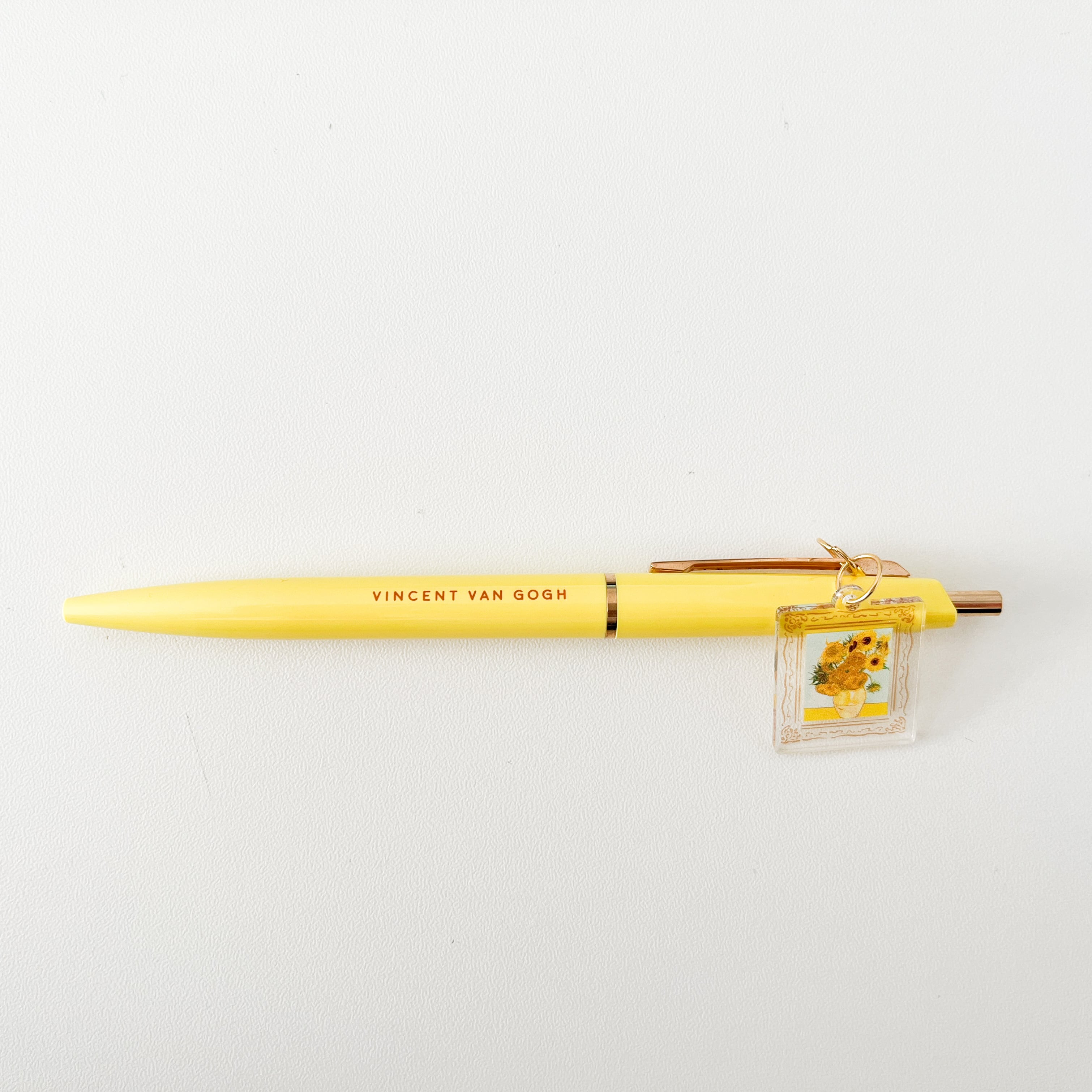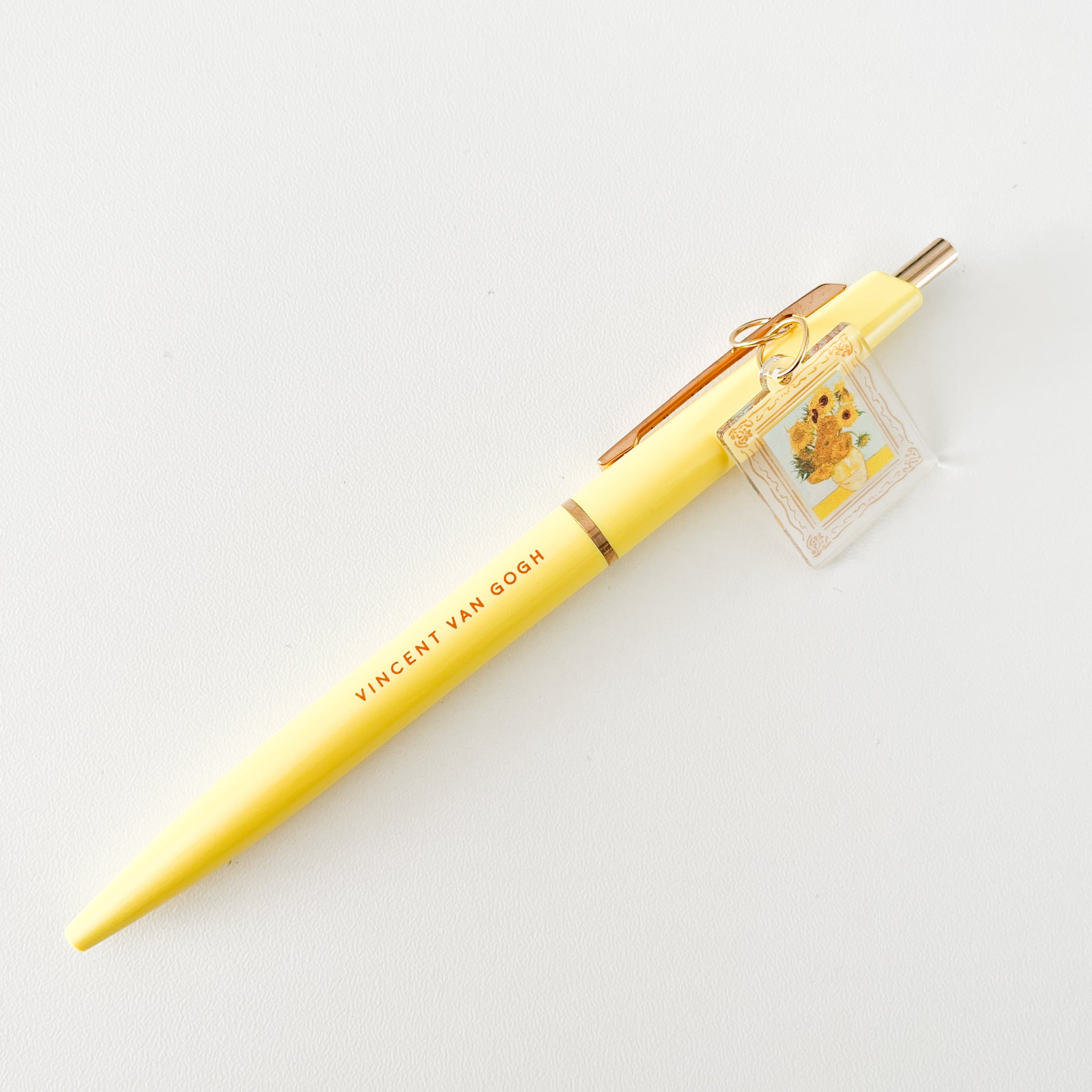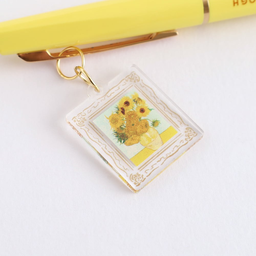 ゆらゆら揺れる「ひまわり」のアクリルチャームのついたボールペン。超低粘度油性インクを搭載した軽やかでなめらかな書き心地。書き物をしている手元、ペンケースの中や胸ポケットなど、何気ないシチュエーションの中で、心が弾む名画のペンです。