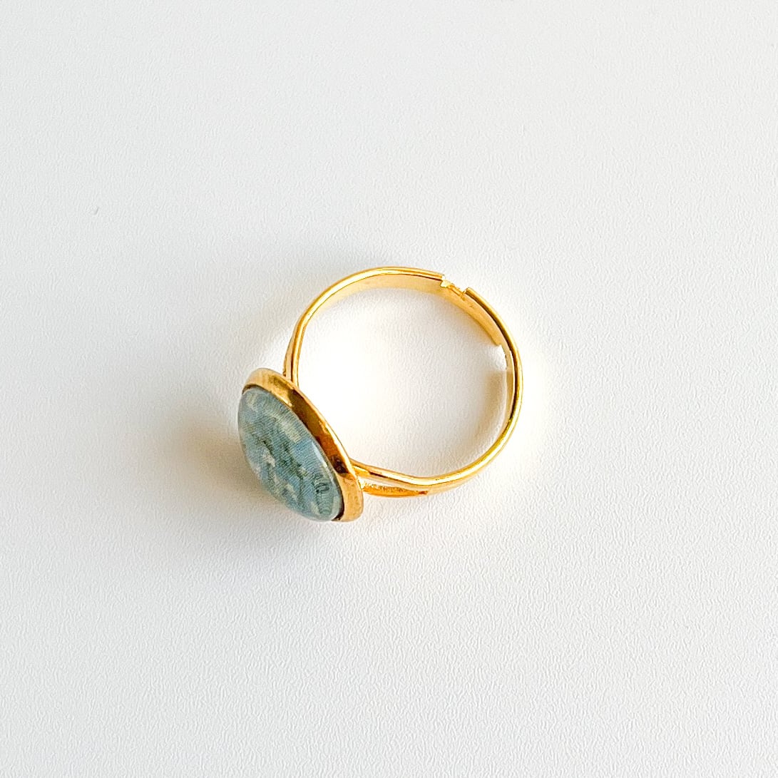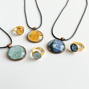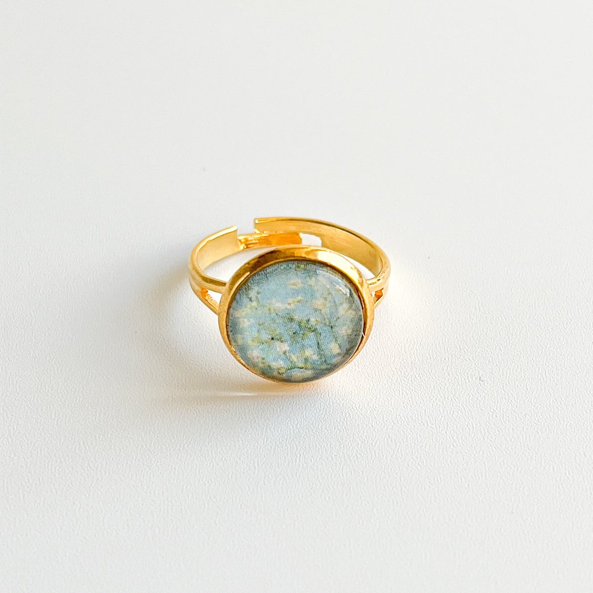 いつでもアートを身に付けられるファッションアイテム。コロンとした飾りの部分が可愛らしい、名画リングです。その丸くて透明な飾りに、ゴッホの「花咲くアーモンドの木の枝」が収まっています。