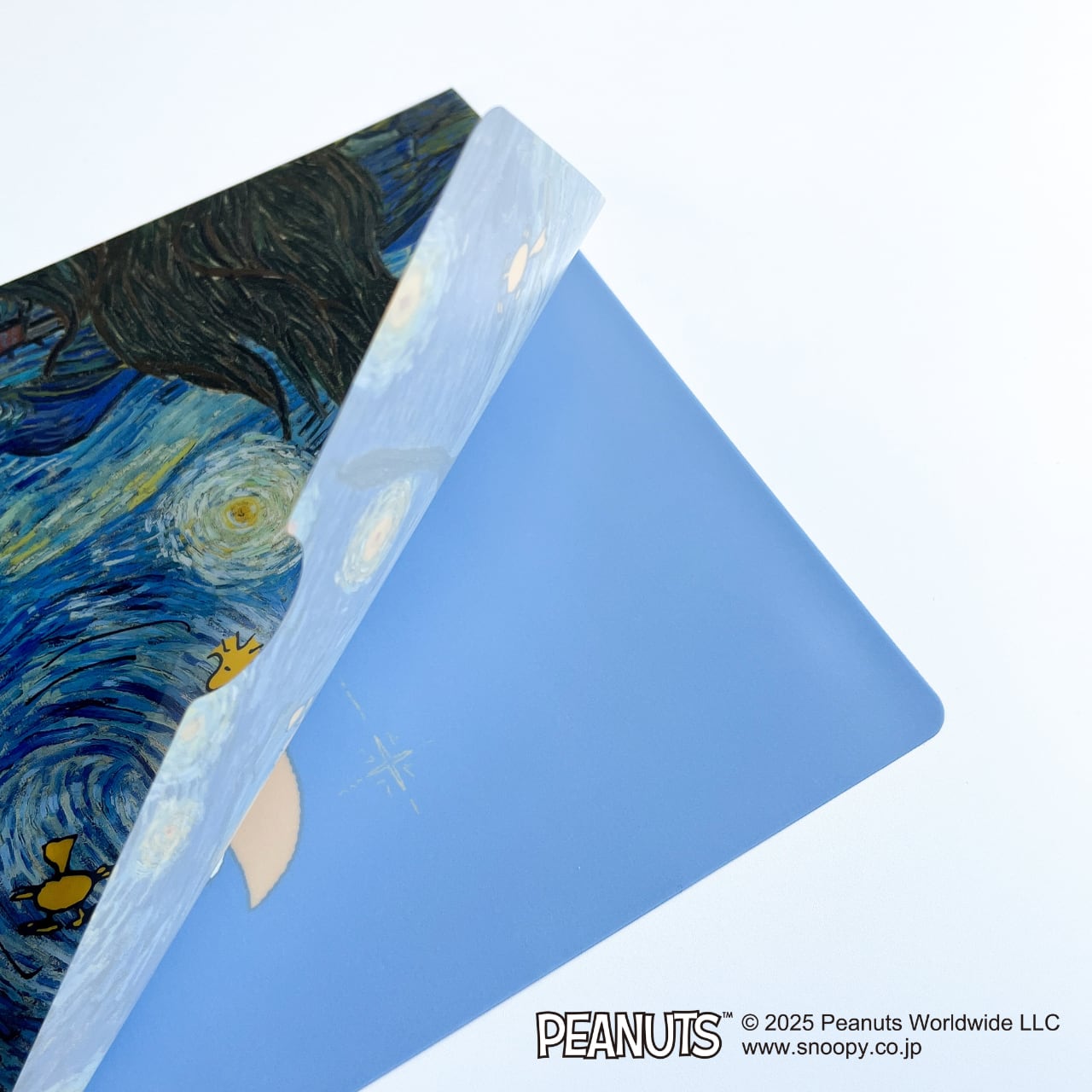 フィンセント・ファン・ゴッホの名画の中にさりげなくSNOOPYがいる。オフィスや学校でも使えるおとな可愛いファイルです。単色のクリアファイルは何を挟んだのかを忘れがちです。そんな時にも絵画作品のクリアファイルを選ぶことで、どの作品のクリアファイルに何を入れたのか見つけやすくなりそうです。アートなクリアファイルコレクションの一枚としてご利用ください。