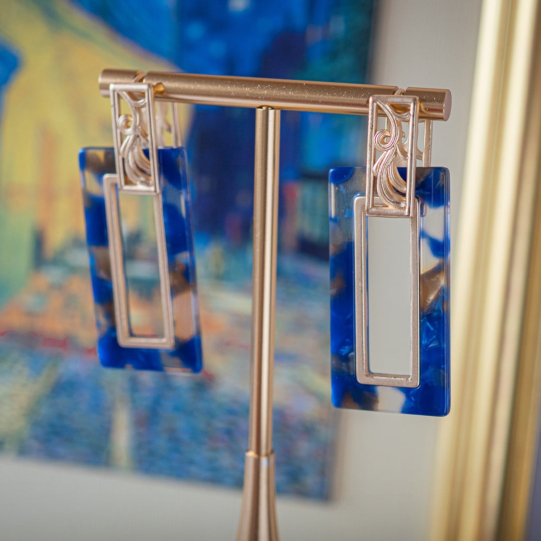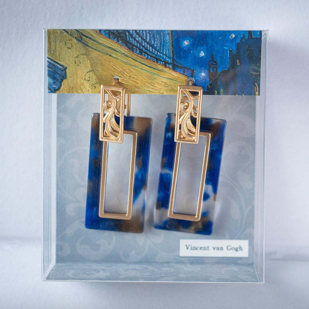 額縁のようなフォルムに、それぞれの名画からインスパイアされた、色彩のゆらめきを閉じ込めた2WAYピアス。アートパーツは着脱可能で、シーンに応じて雰囲気を変えられるデザインです。