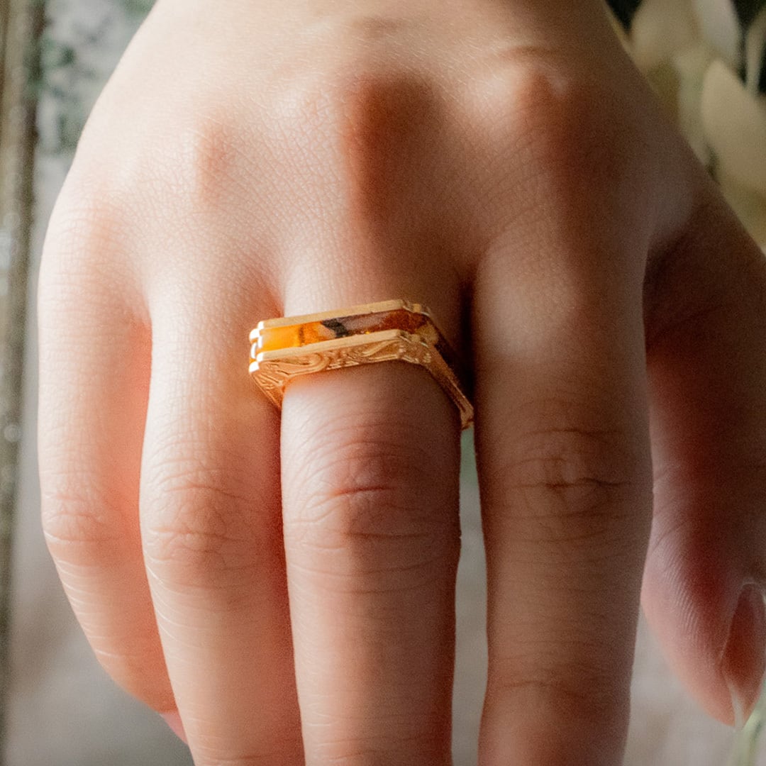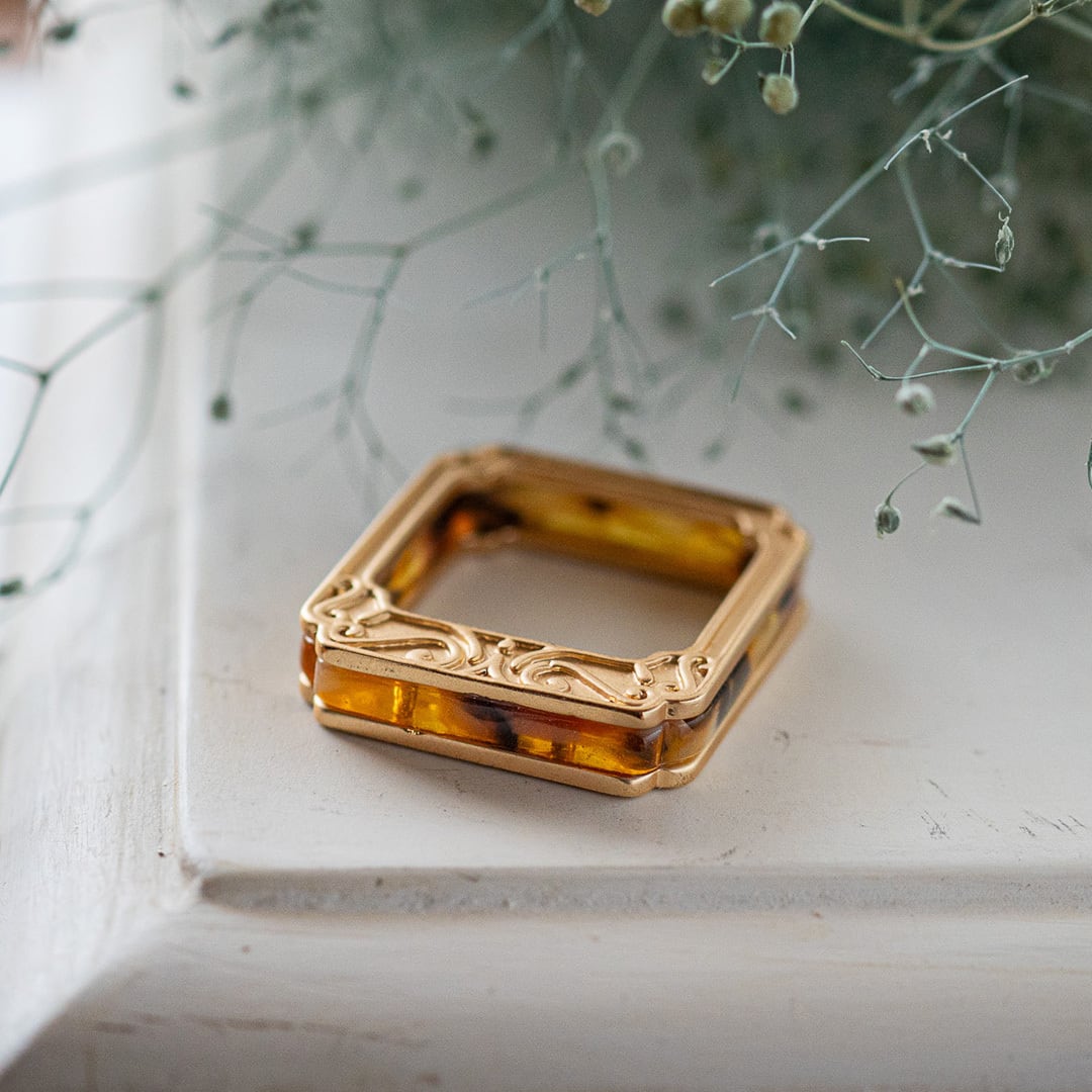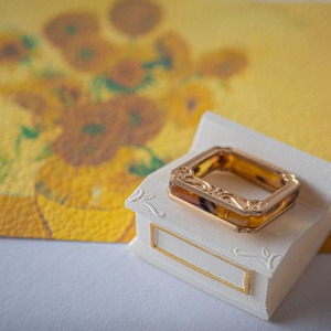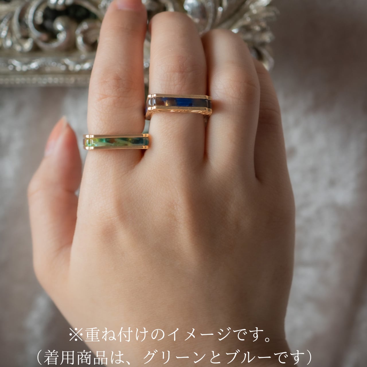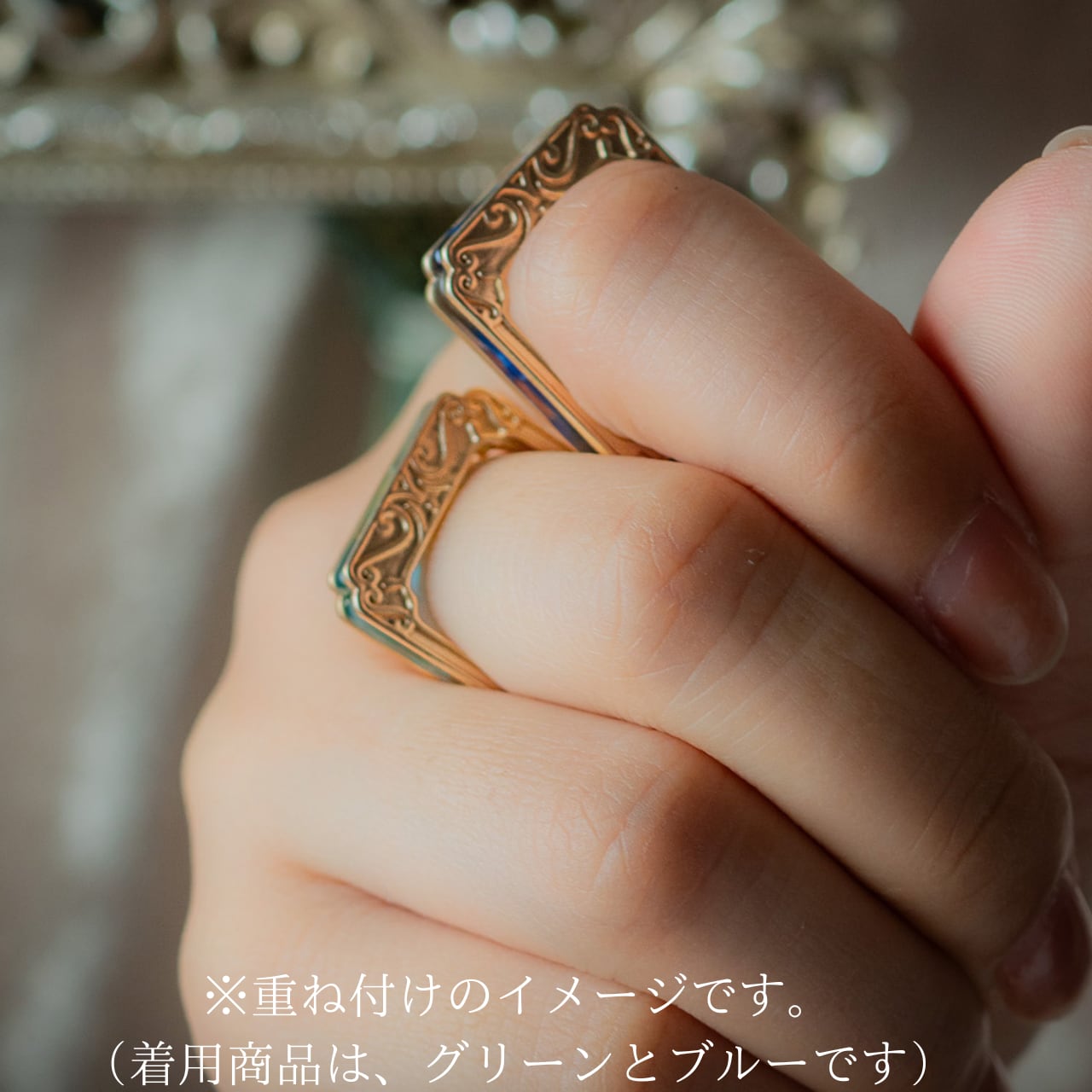 額縁のようなフォルムに、それぞれの名画からインスパイアされた色のゆらめきを閉じ込めたリング。美しい透明感の中で、ひとつひとつ異なる表情を魅せてくれるアセチパーツが、あなたにだけの“光”を宿します。