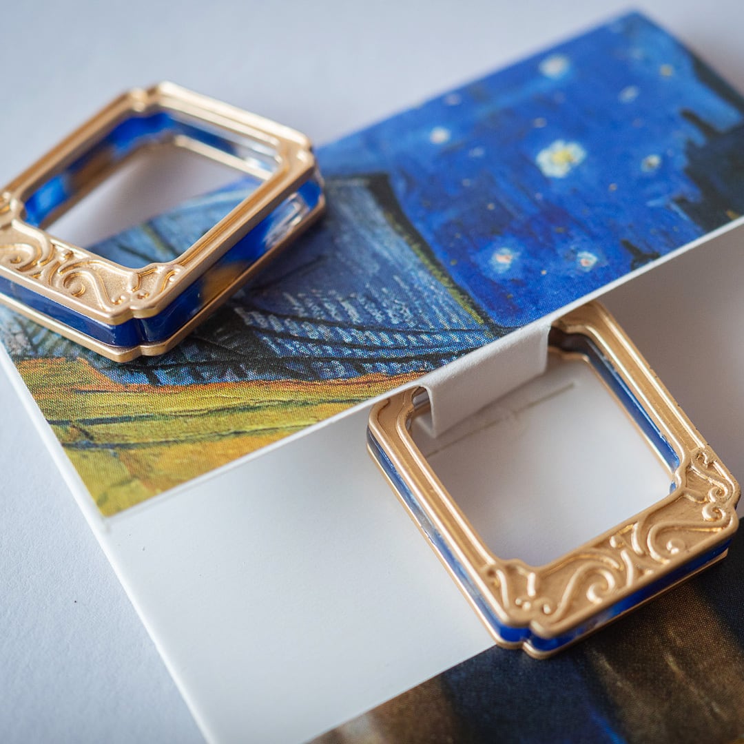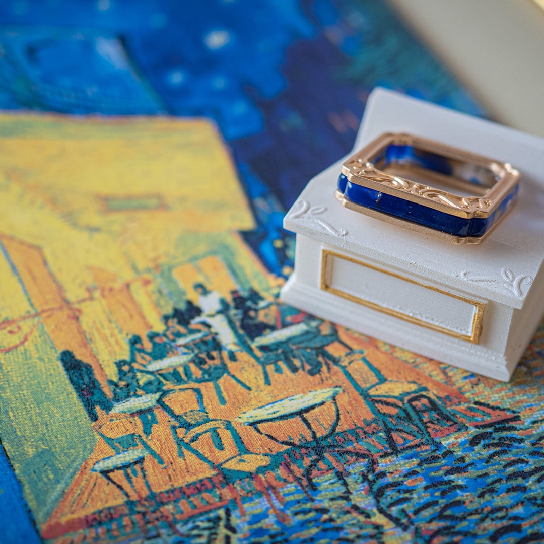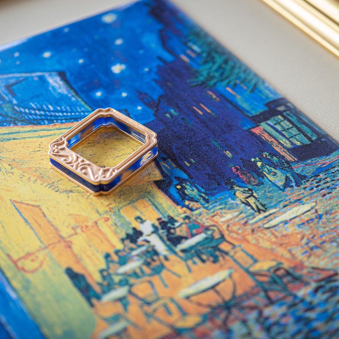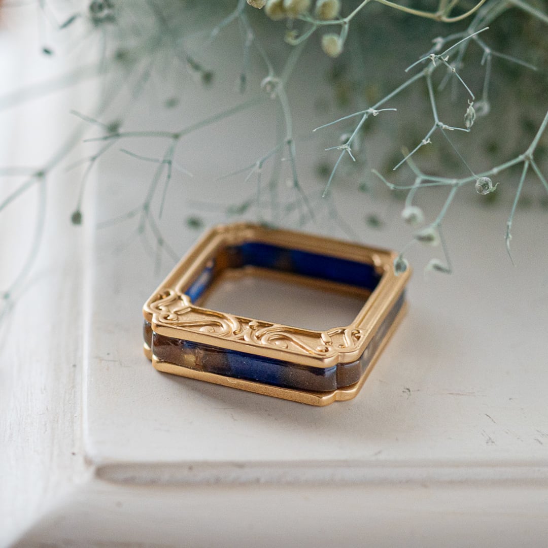 額縁のようなフォルムに、それぞれの名画からインスパイアされた色のゆらめきを閉じ込めたリング。美しい透明感の中で、ひとつひとつ異なる表情を魅せてくれるアセチパーツが、あなたにだけの“光”を宿します。