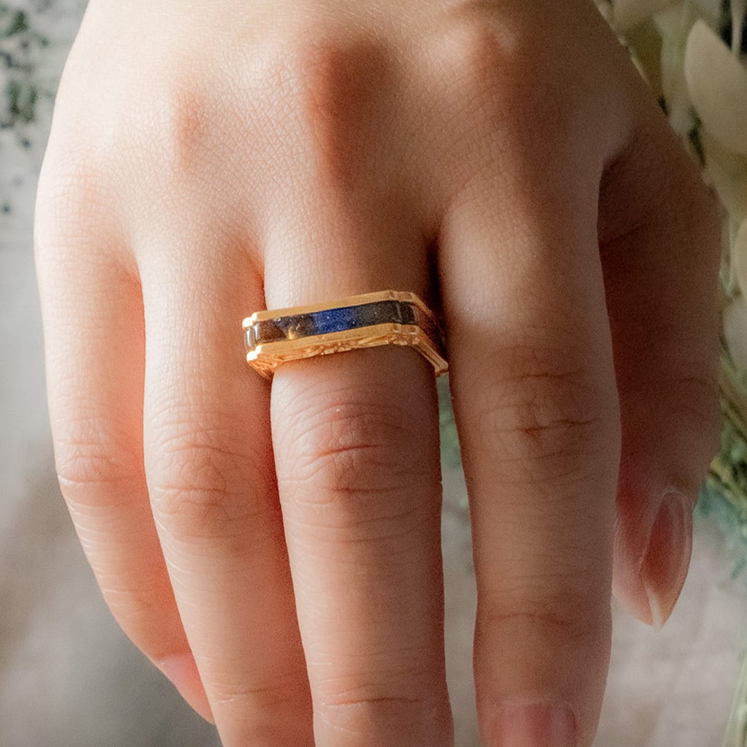 四角いフォルムのリングは、多くの方にご利用いただきやすい仕様に。同じシリーズで重ね付けをし、指先のおしゃれを楽しむのもおすすめです。