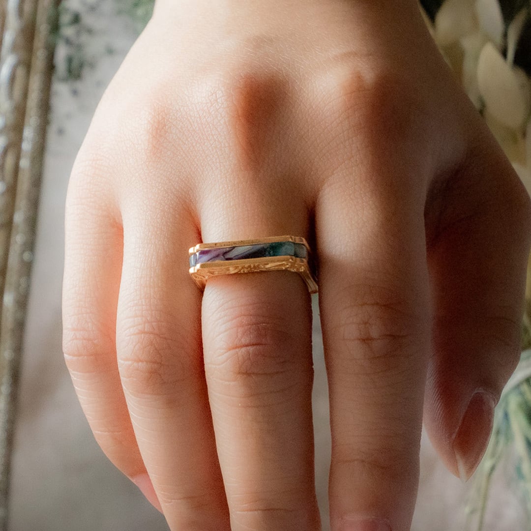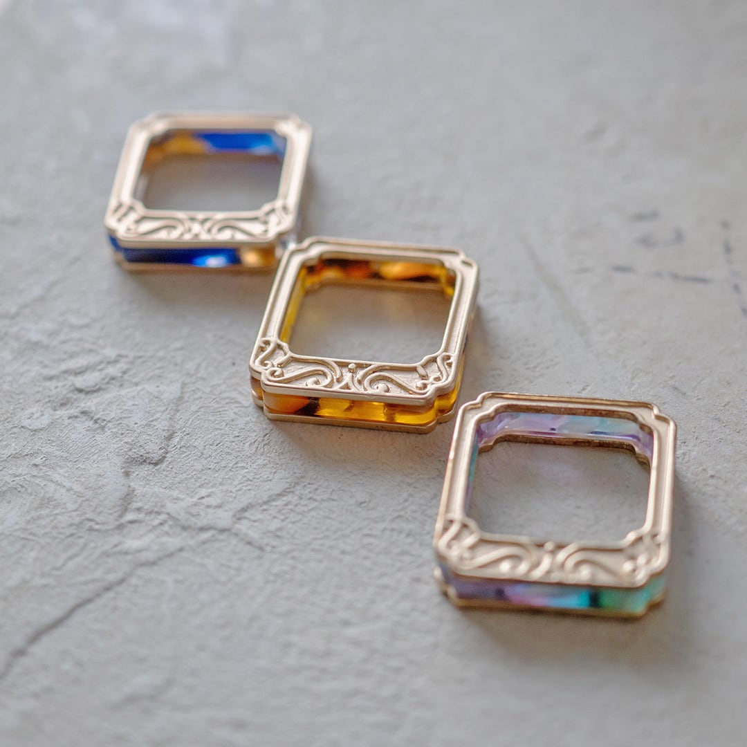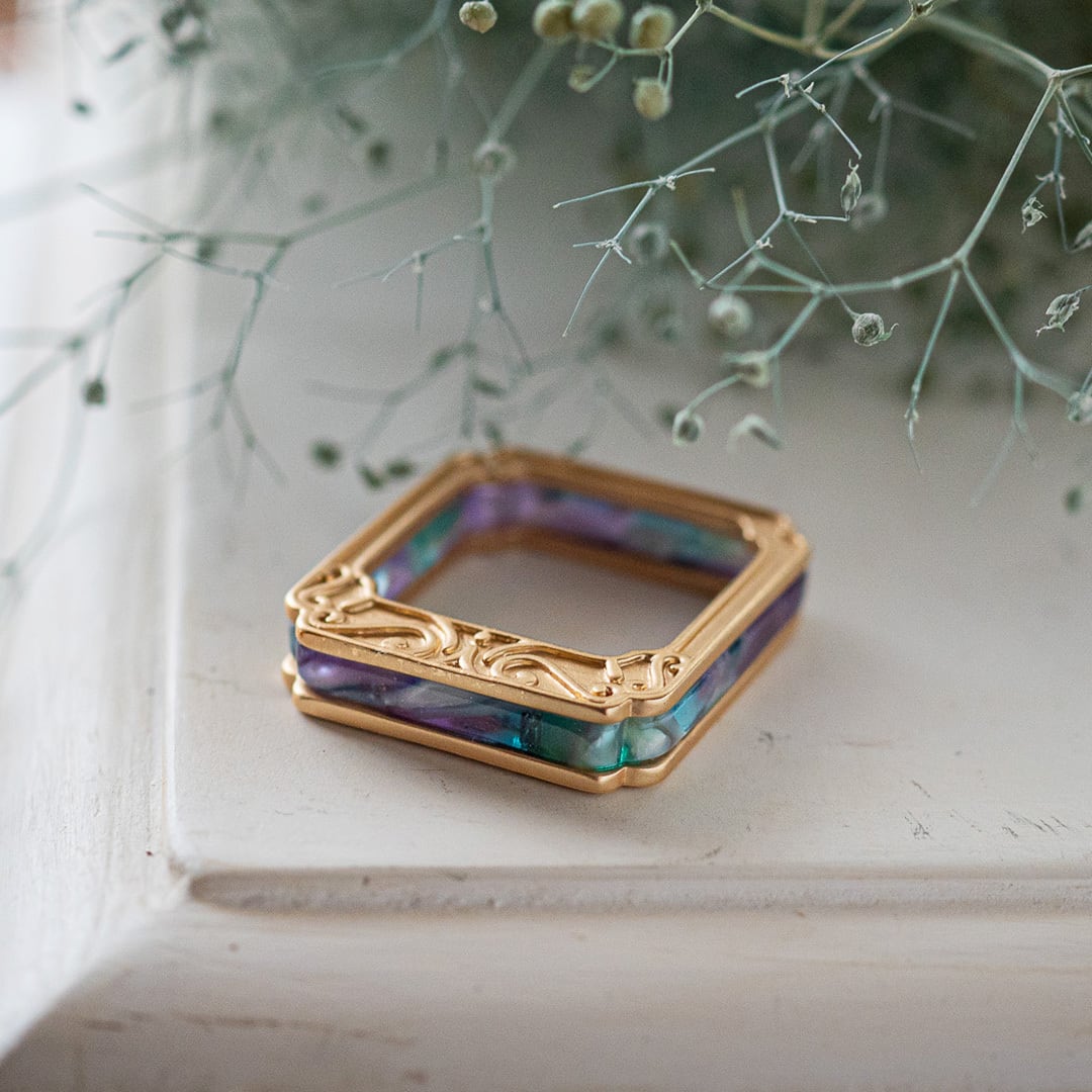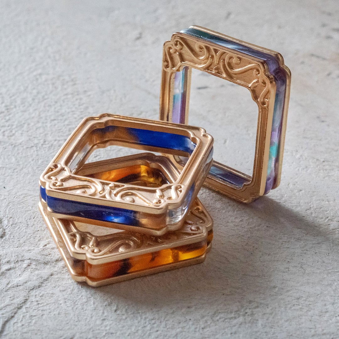 額縁のようなフォルムに、それぞれの名画からインスパイアされた色のゆらめきを閉じ込めたリング。美しい透明感の中で、ひとつひとつ異なる表情を魅せてくれるアセチパーツが、あなたにだけの“光”を宿します。