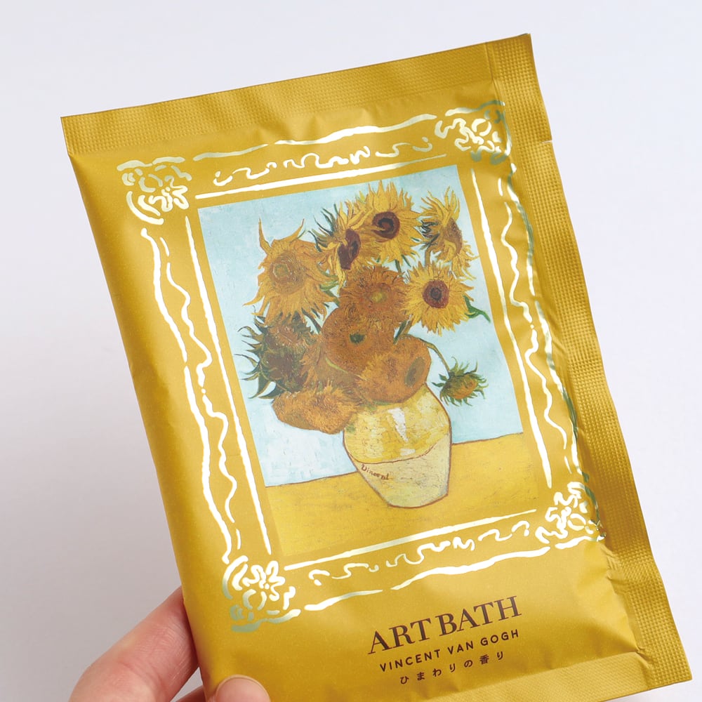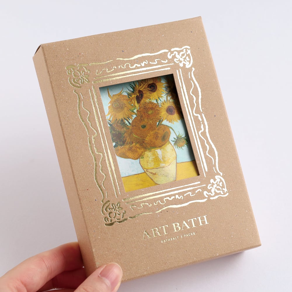 両手いっぱいに花束をかかえているような、ひまわりの香り漂うバスソルトです。保湿成分としてフラワーエキスを配合しております。湯色もひまわりを彷彿させるクリアイエロー。同じ種類のバスソルトが3包入ったセット商品です。箱の窓から絵画がのぞく仕掛けが楽しいクラフトボックスに入っているので、ギフトにも最適です。