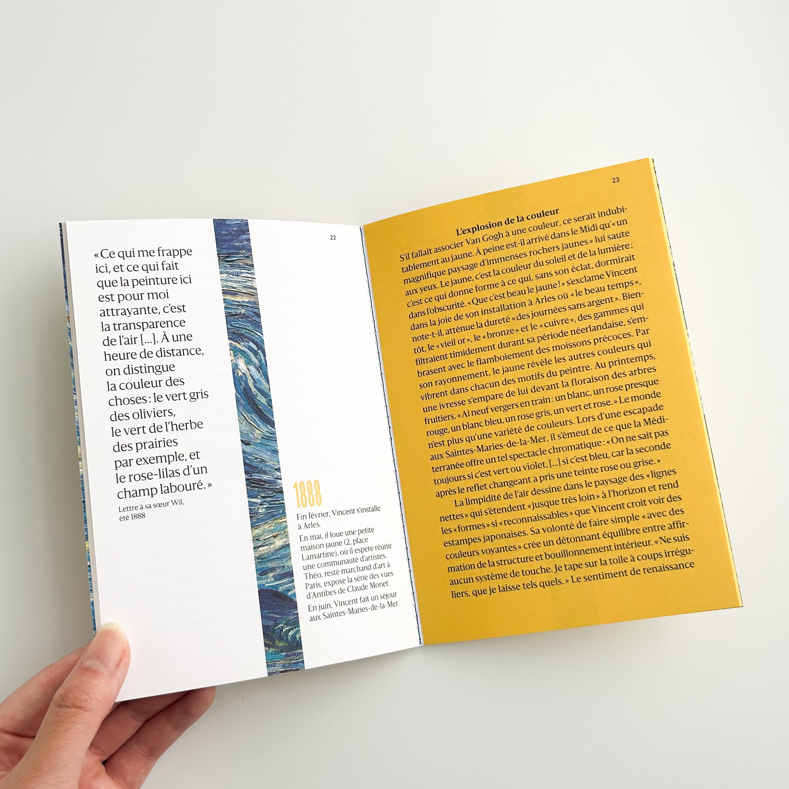 フランス語の折りたたみ式アートブックです。「ポップアート」シリーズの一冊で、ゴッホの生涯と画業を再検証し、筆者が本書のために新たに書き下ろしたエッセイです。文章を読み終えたあと本のページを折り込むと、飛び出す「星月夜」が完成するユニークな構成となっています。オブジェのように飾って、インテリアとしてお楽しみいただけます。