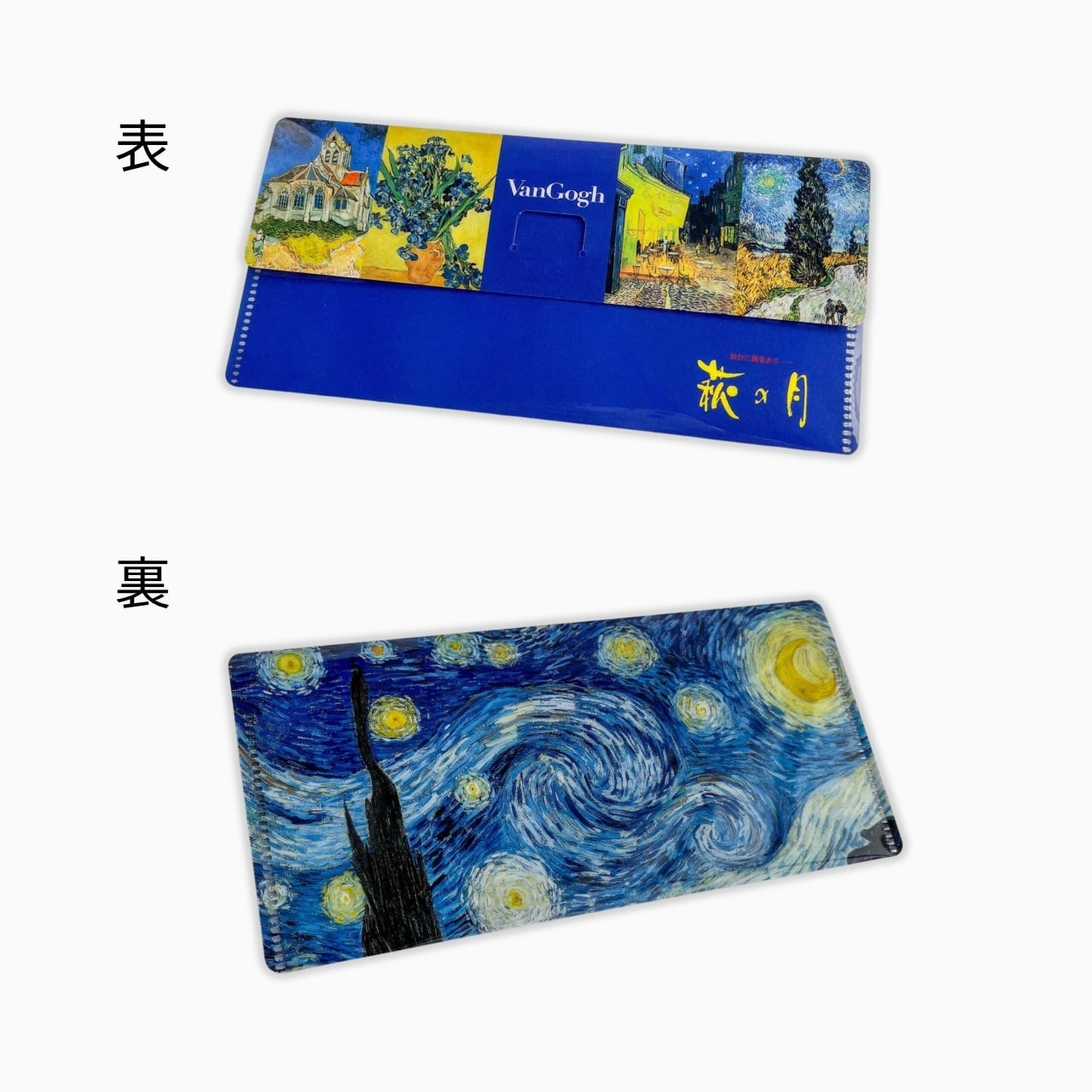 今回のセットを包むパッケージとして登場する、ゴッホ「星月夜」の巾着は、この企画で初お披露目の新作グッズ。やわらかな布地に夜空の渦が美しく映え、ちょっとした小物を入れるだけで気持ちが華やぎます。A4サイズが入る、少し大きめのシンプルな袋で、バッグインバッグとして、旅行時の収納などに活躍!使うほど愛着のわく巾着です。