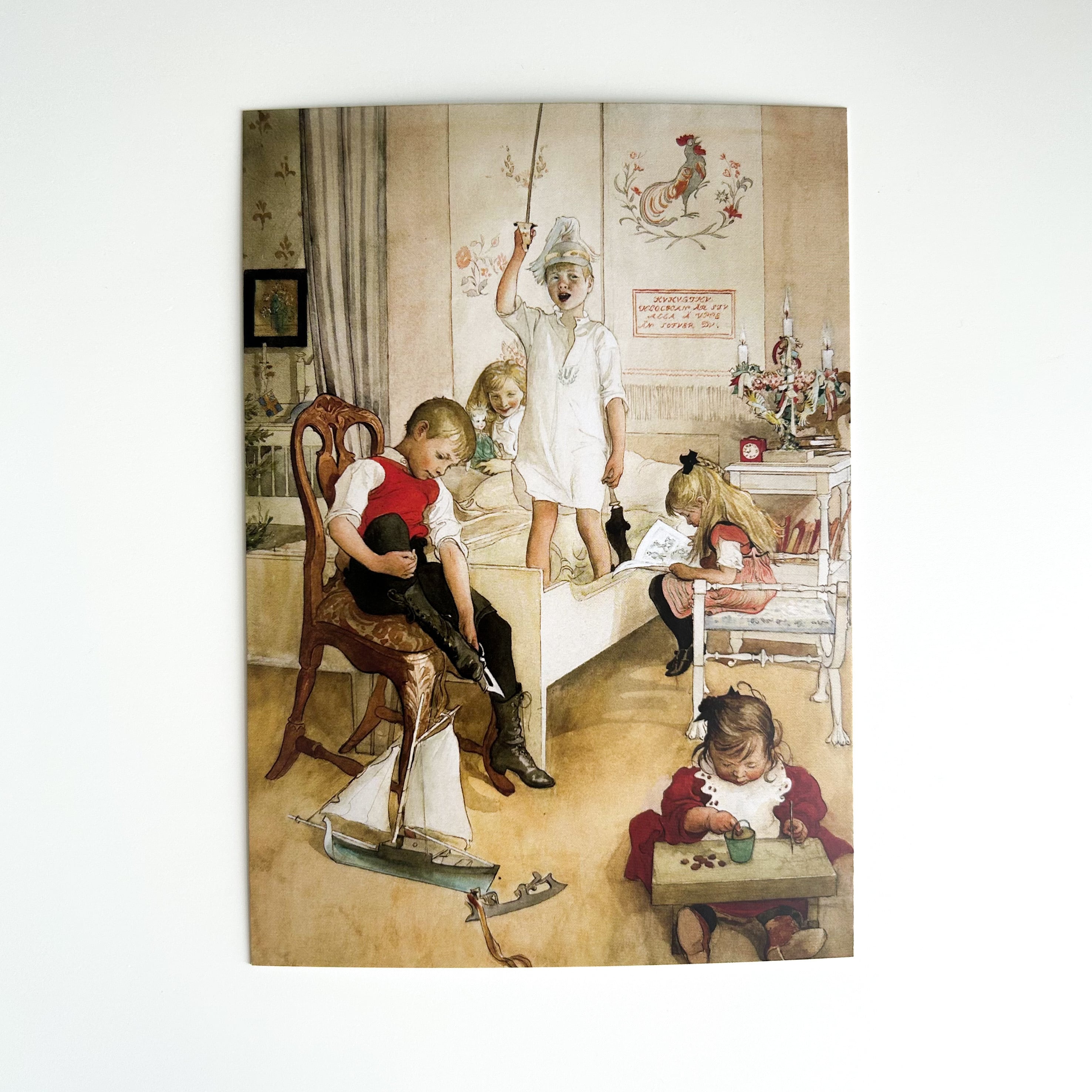 カール・ラーションは、19世紀後半から20世紀初頭にかけて活動したスウェーデンの画家です。特に水彩画で高い評価を受けています。若い頃は経済的に苦しい時期もありましたが、フランス滞在を通して外光主義的なレアリスムを取り入れ、自然光を生かした水彩表現を確立。また、日本美術から浮世絵の構図や線描の影響を受けたことにより、作品の画面構成に生かされ、後にアール・ヌーヴォーの先駆的表現として評価されています。帰国後は自宅を制作の場とし、妻や子どもたち、住まいの内部や庭など、スウェーデン中流家庭の日常を主な題材として描きました。1899年刊行の画集『わたしの家』は各国で翻訳出版され、温かみのある画風とともに、作品に描かれた住まいと暮らし方は、スウェーデンの住文化を象徴する一つの理想像として受け取られています。