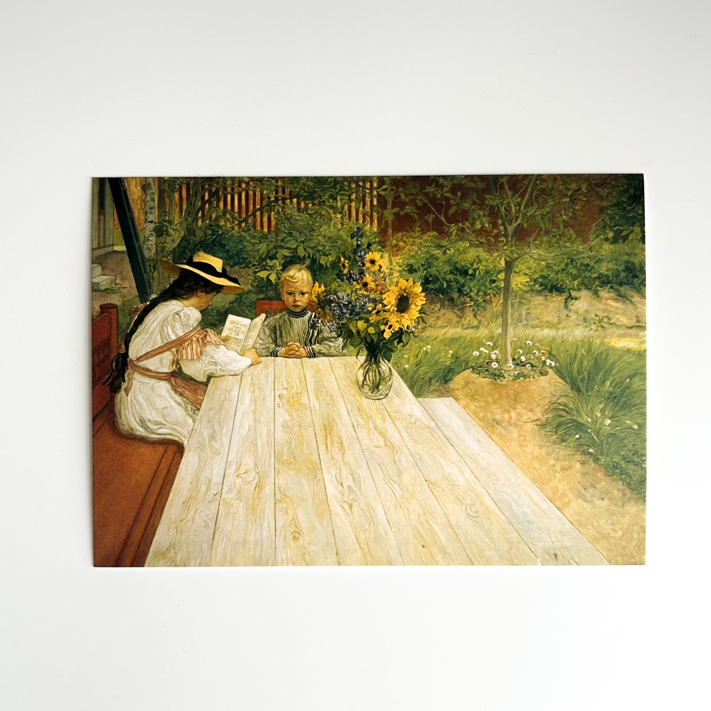 カール・ラーションは、19世紀後半から20世紀初頭にかけて活動したスウェーデンの画家です。特に水彩画で高い評価を受けています。若い頃は経済的に苦しい時期もありましたが、フランス滞在を通して外光主義的なレアリスムを取り入れ、自然光を生かした水彩表現を確立。また、日本美術から浮世絵の構図や線描の影響を受けたことにより、作品の画面構成に生かされ、後にアール・ヌーヴォーの先駆的表現として評価されています。帰国後は自宅を制作の場とし、妻や子どもたち、住まいの内部や庭など、スウェーデン中流家庭の日常を主な題材として描きました。1899年刊行の画集『わたしの家』は各国で翻訳出版され、温かみのある画風とともに、作品に描かれた住まいと暮らし方は、スウェーデンの住文化を象徴する一つの理想像として受け取られています。