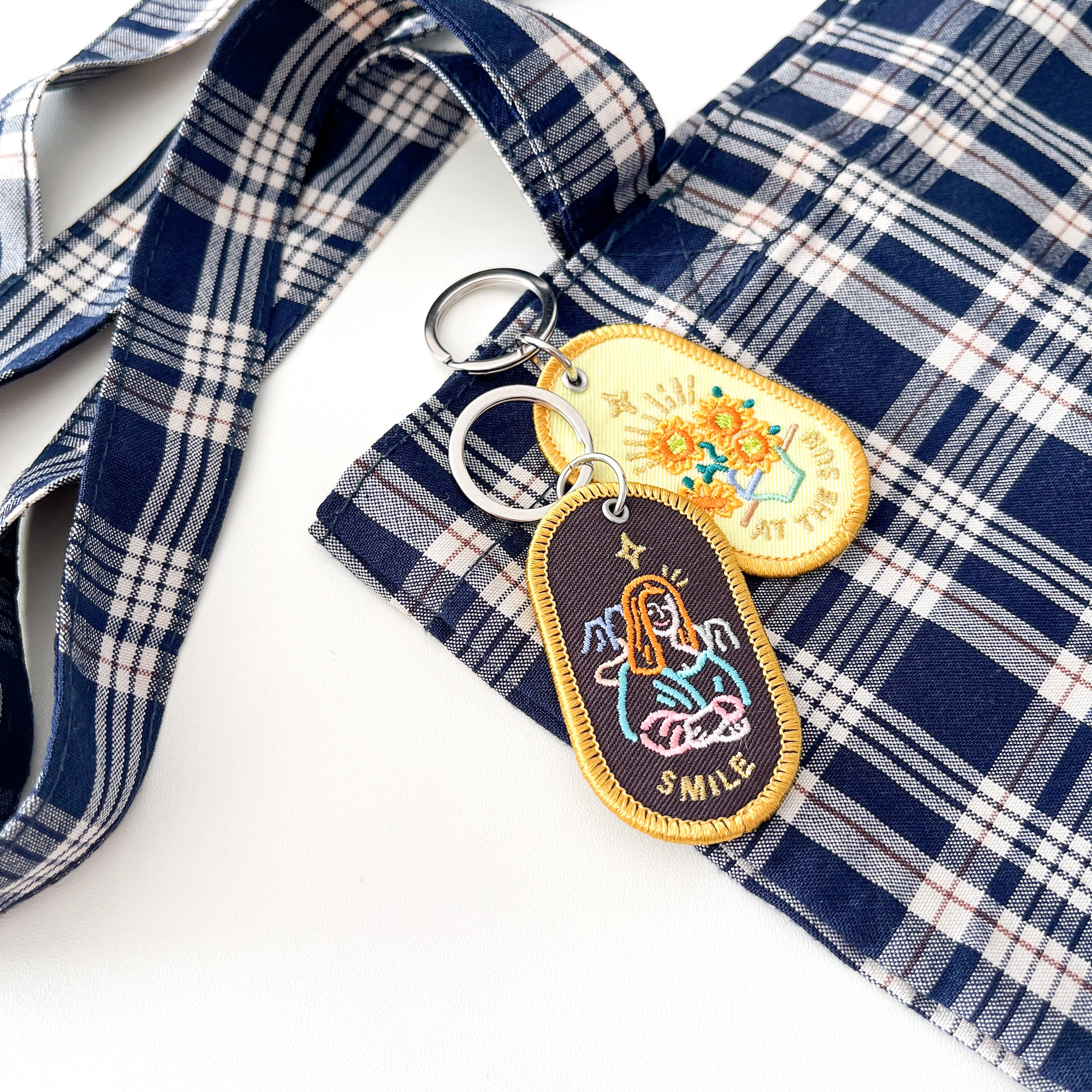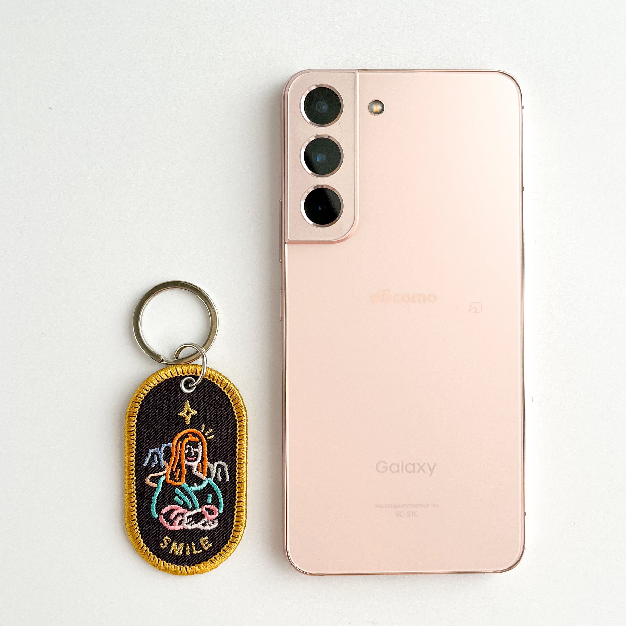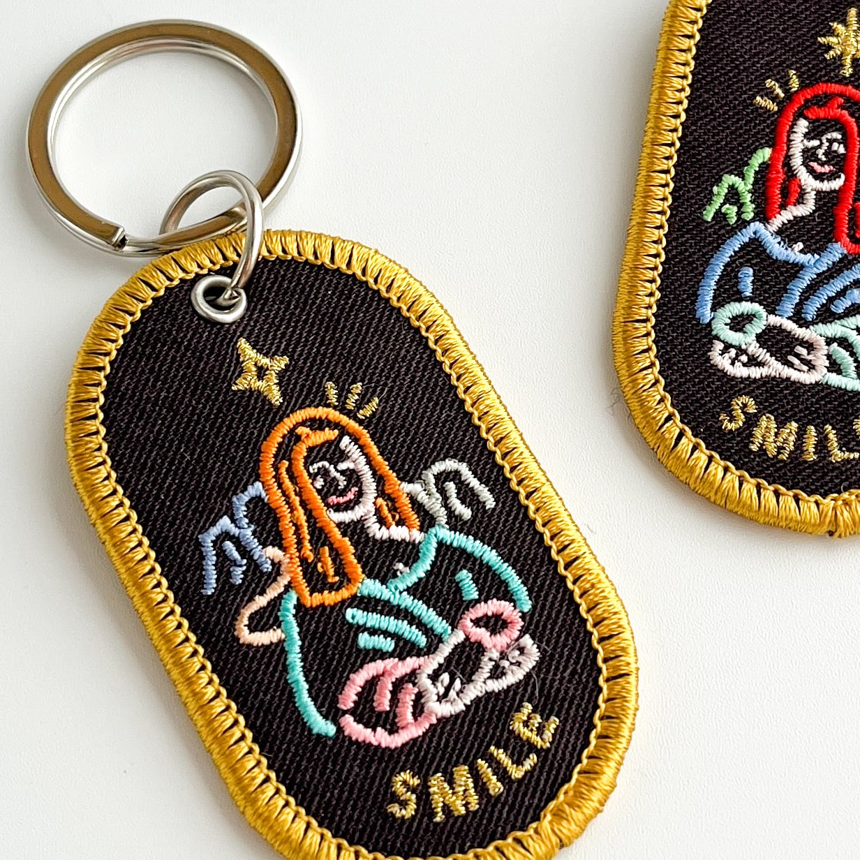 ワッペン素材の風合いと、刺繍ならではのやわらかなタッチで描かれた、抜け感のあるイラストが可愛いデザイン。額縁のような金色の縁取り刺繍がさりげないアクセントになっています。