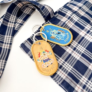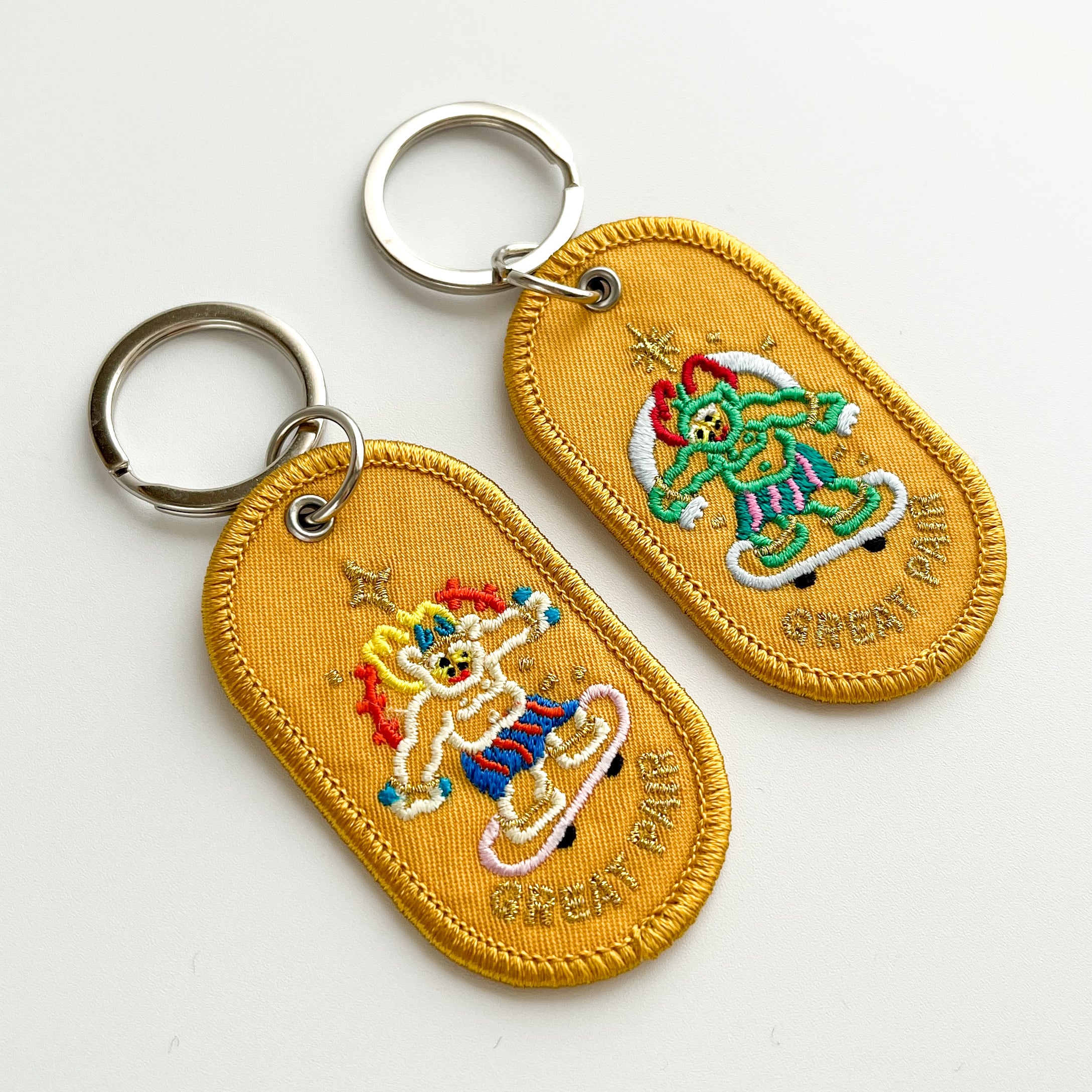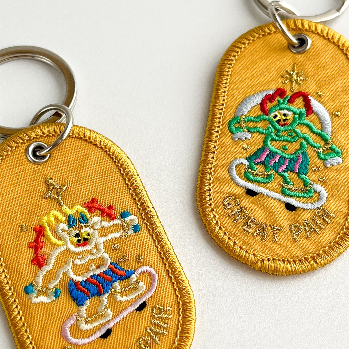 ワッペン素材の風合いと、刺繍ならではのやわらかなタッチで描かれた、抜け感のあるイラストが可愛いデザイン。額縁のような金色の縁取り刺繍がさりげないアクセントになっています。