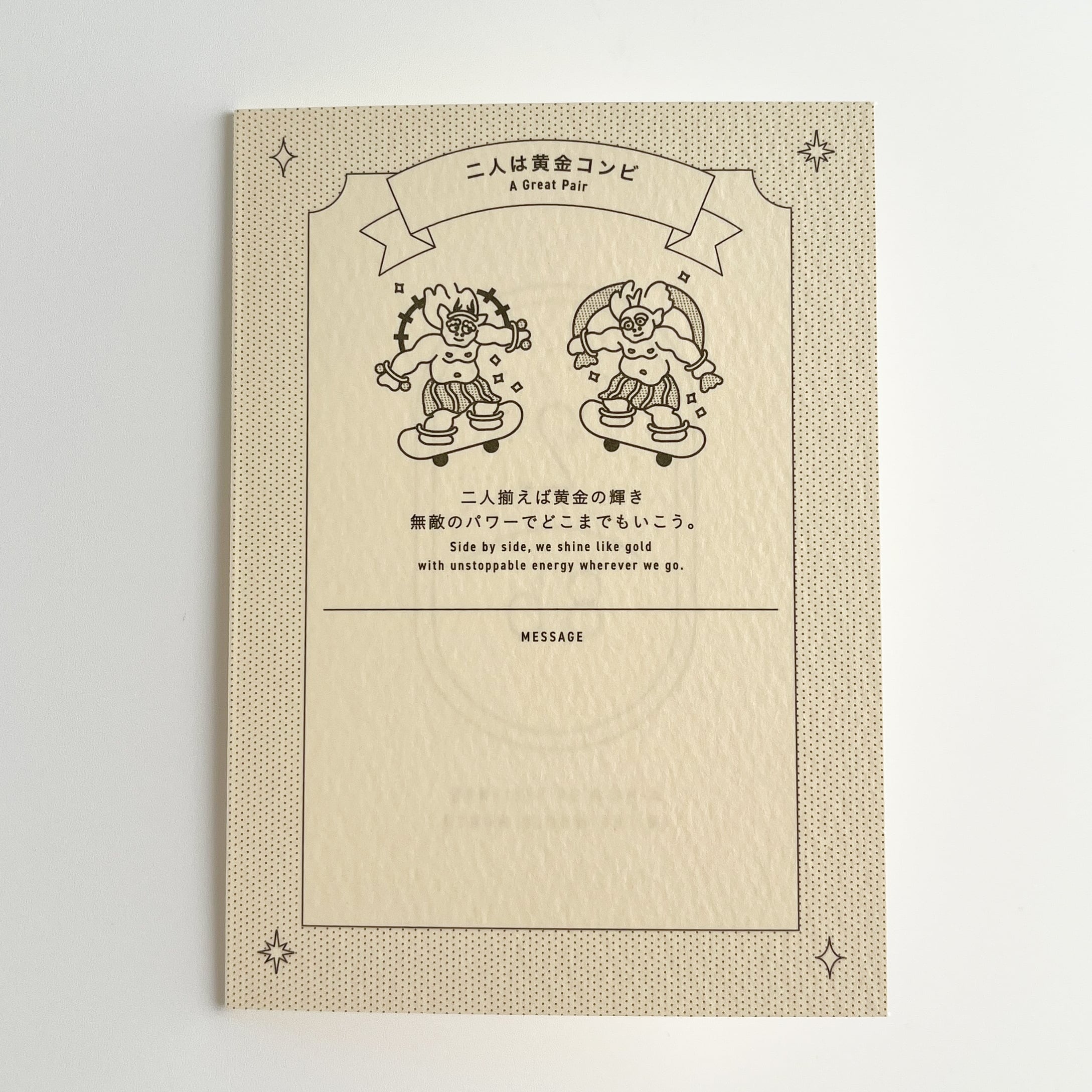 お揃いにする相手に渡す際にピッタリな、ギフトラッピングになるパッケージ台紙付き。二つ折り台紙の封を閉じると、そのまま贈れる金箔ロゴ入りラッピングになります。メッセージスペースもあるので、心を込めたちょっとしたギフトにおすすめです。