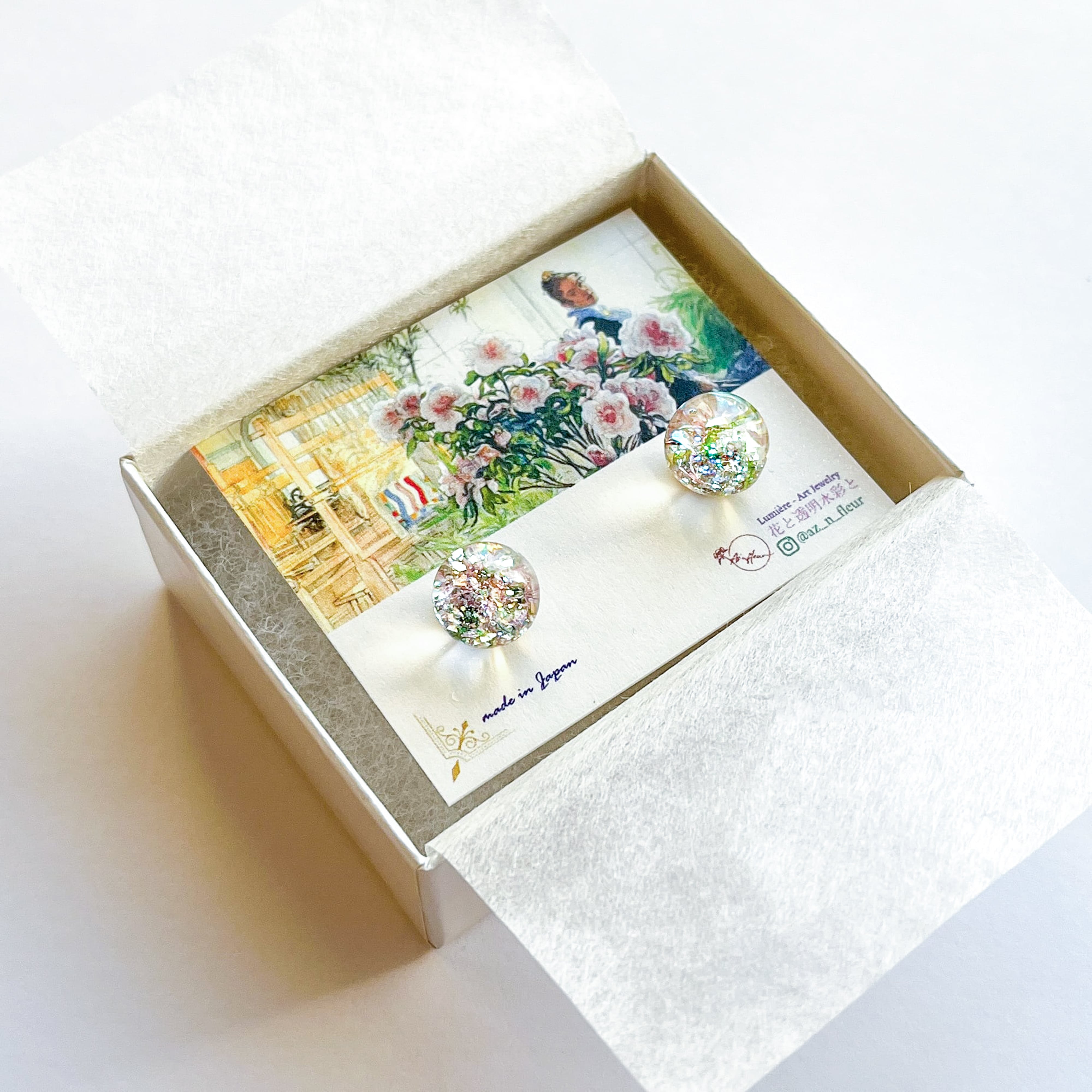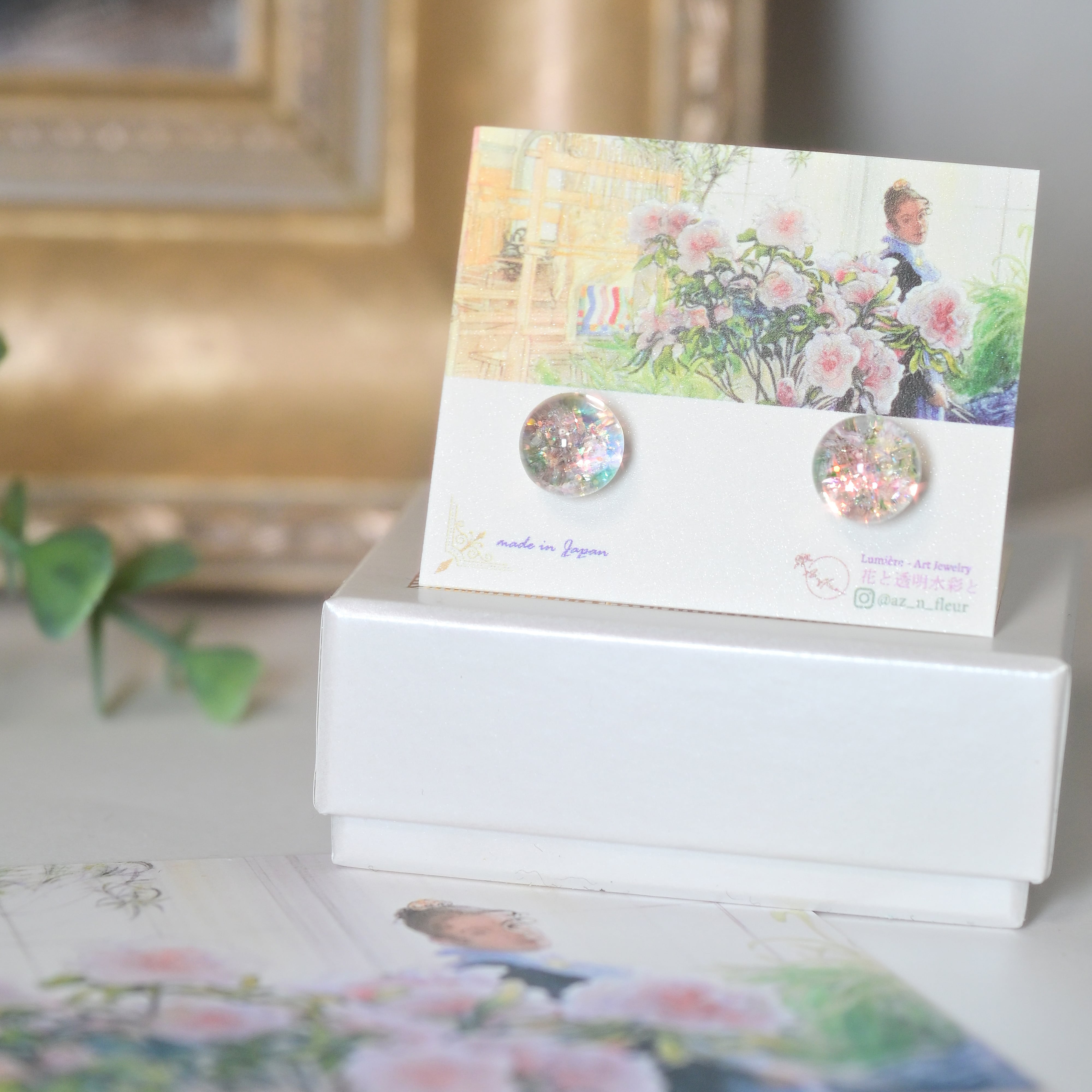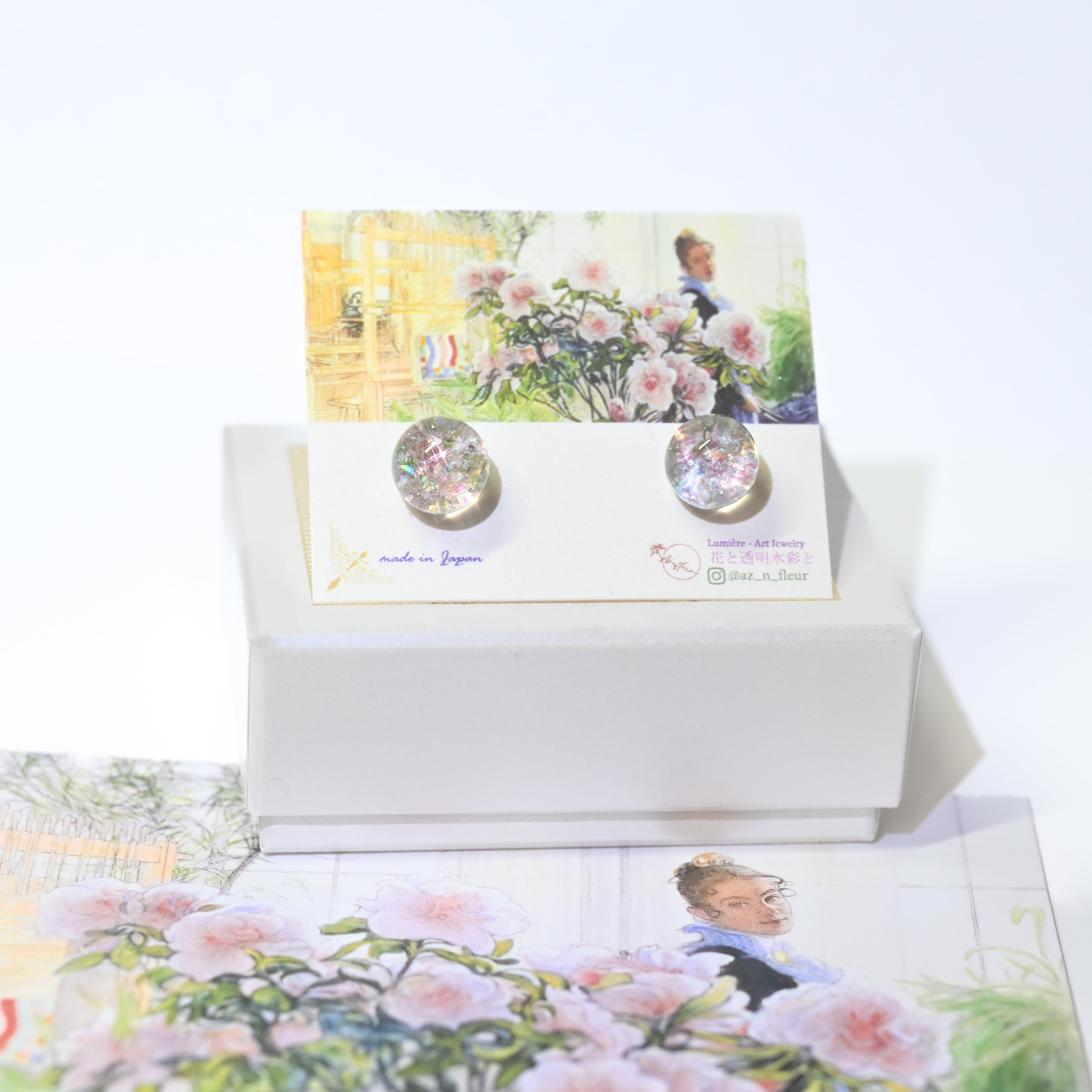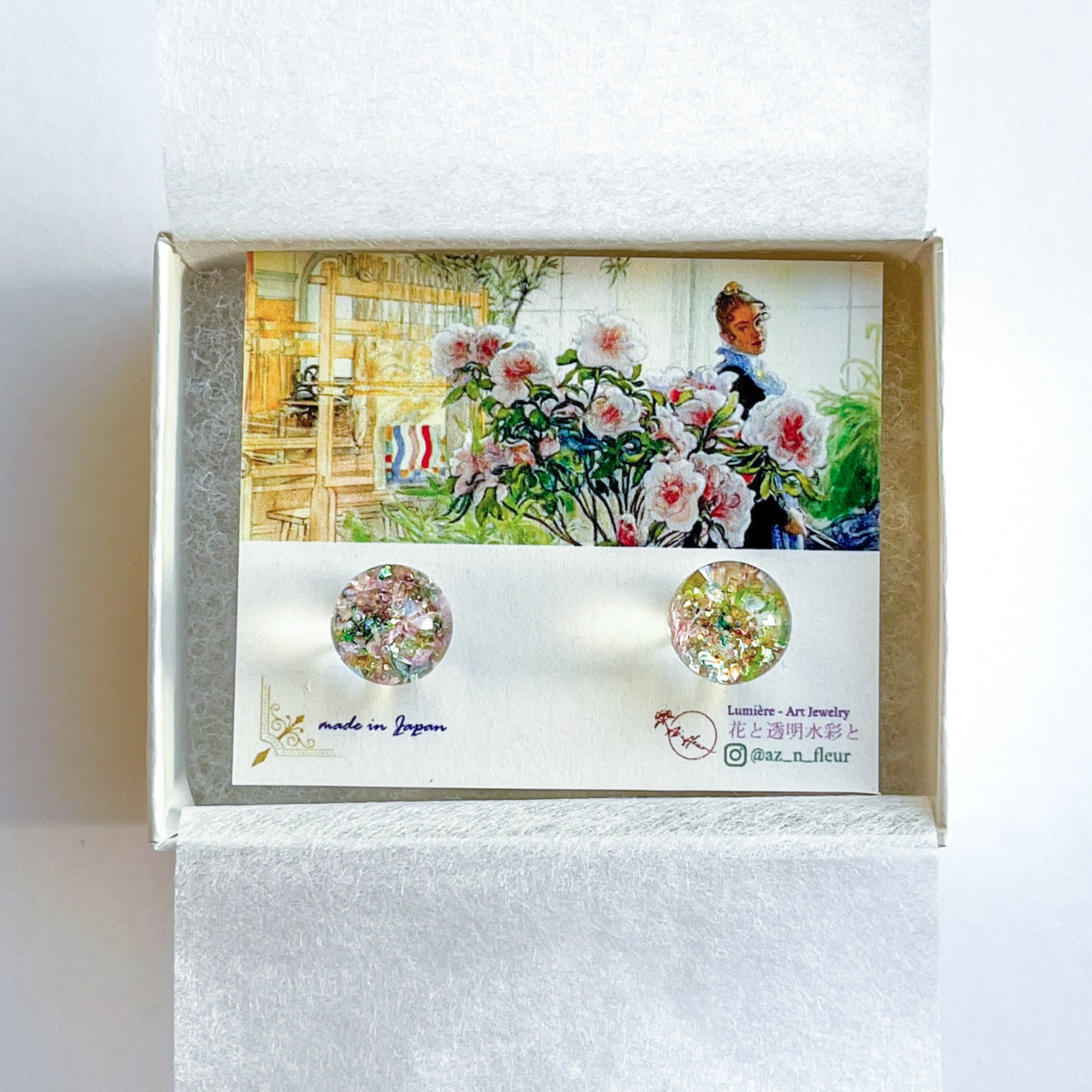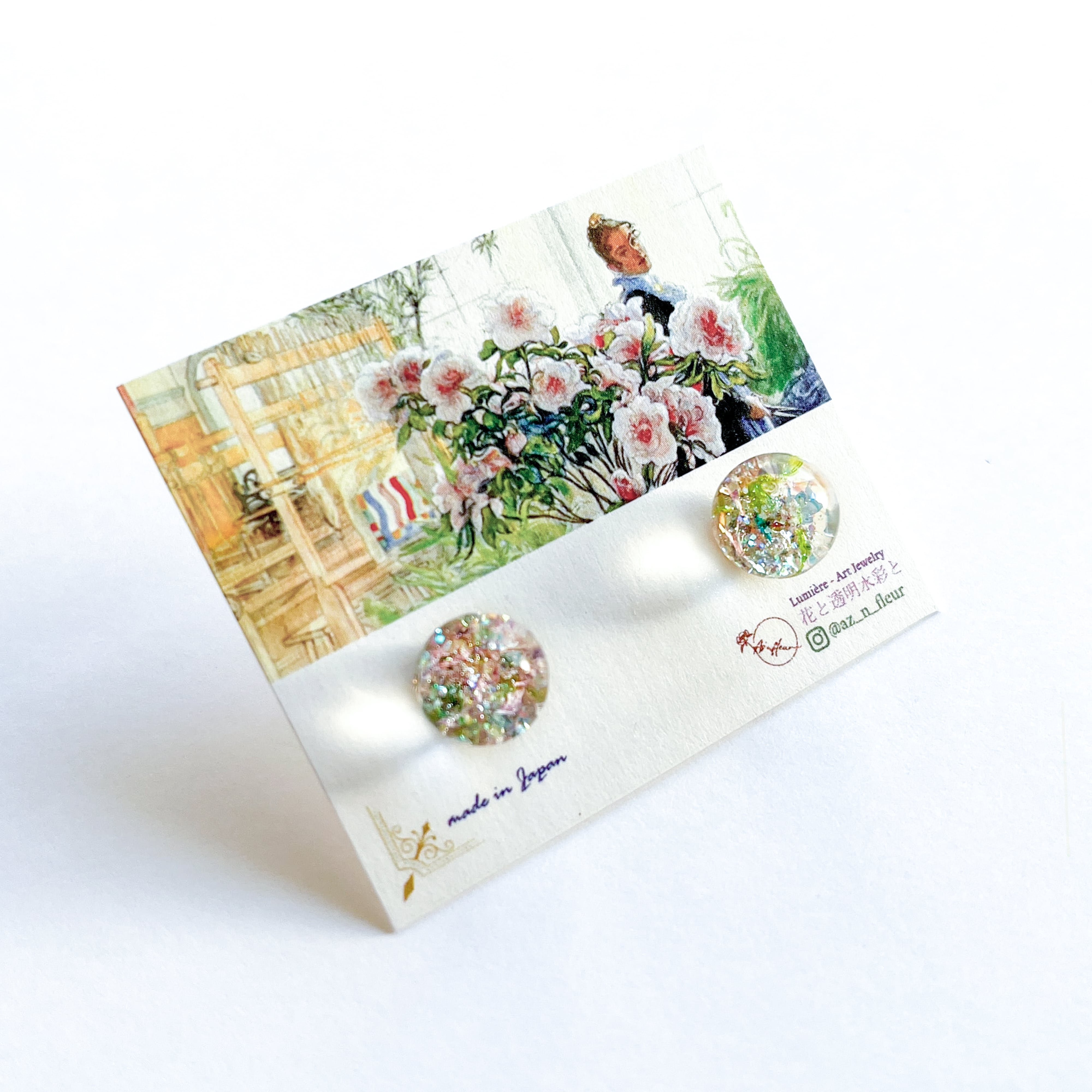 フランス印象派の画家たちに影響を与えた、スウェーデンの画家カール・ラーションの作品をイメージし、ジュエリーブランド「Az'n fleur(アズアンフルール)」が手仕事で制作したアートジュエリー。煌めきと色彩を閉じ込めた一点物のピアスです。