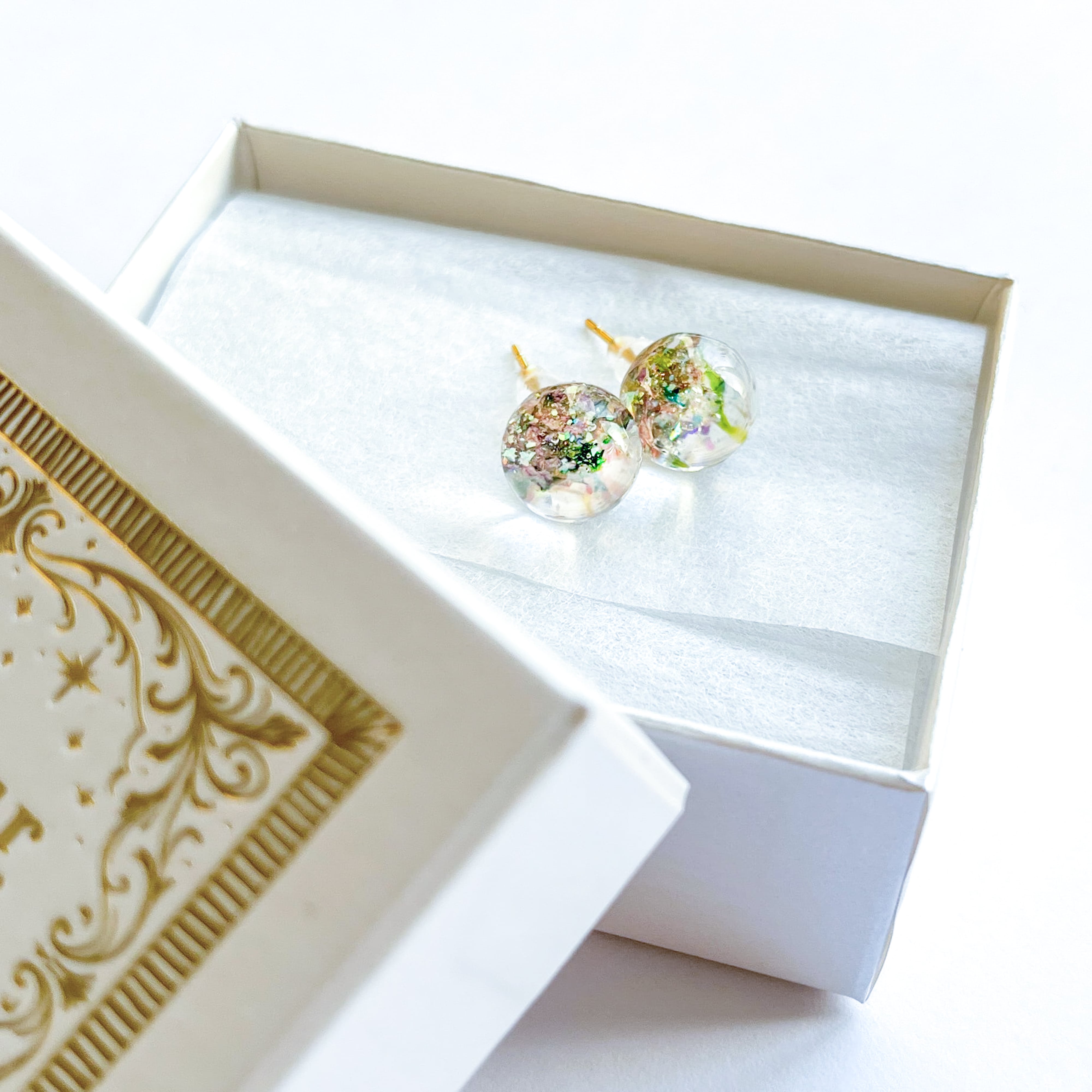 手作りのため、樹脂内部に閉じ込められた花弁の配置や色の濃淡、気泡の入り方には個体差があります。ひとつひとつ表情が異なるため、お選びいただくことはできません。あらかじめご了承ください。