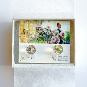 本作『Lumière』シリーズは、ドライフラワーを繊細な色味で染め、花弁を透明樹脂に閉じ込めて描写し、透明感と色彩の美しさを実現しています。