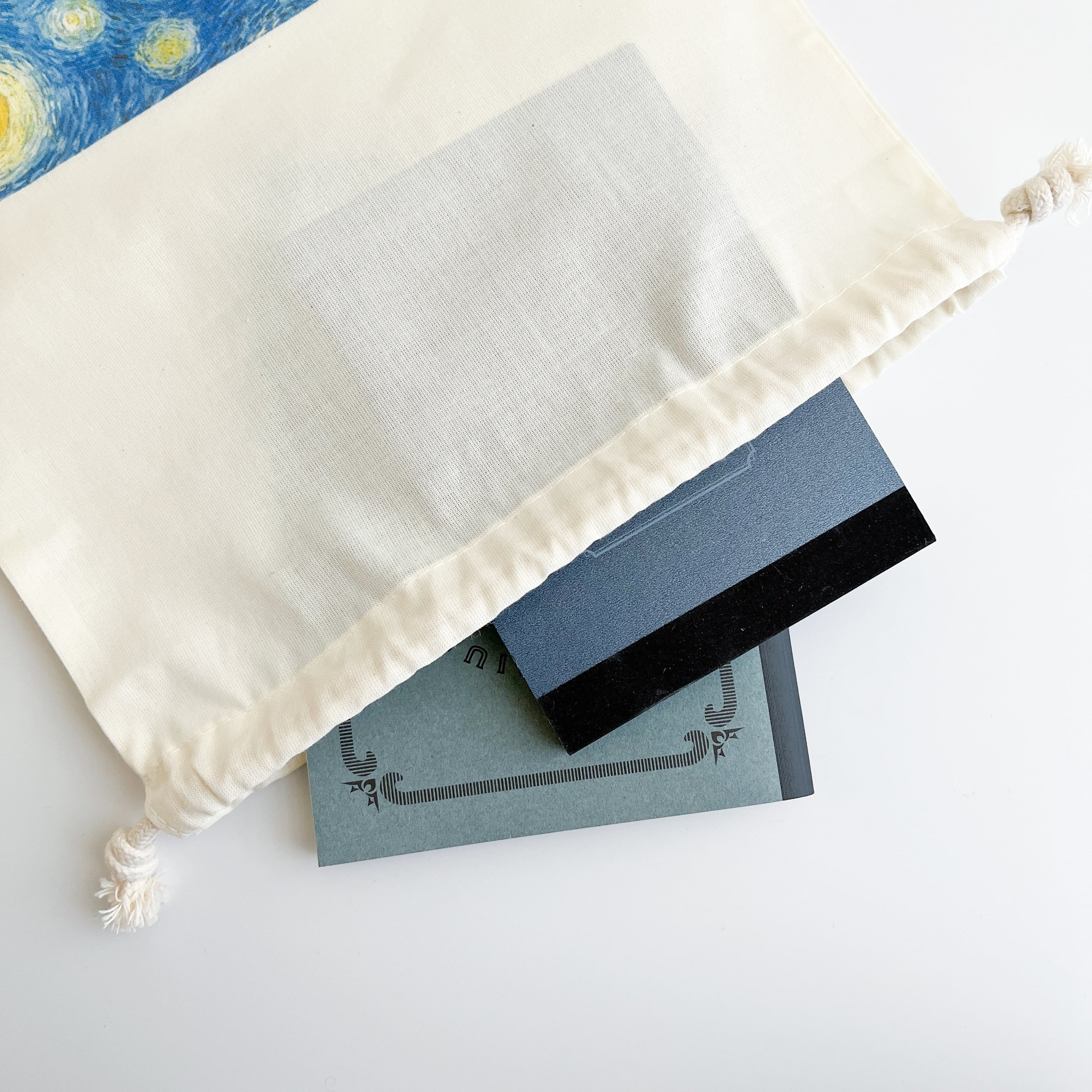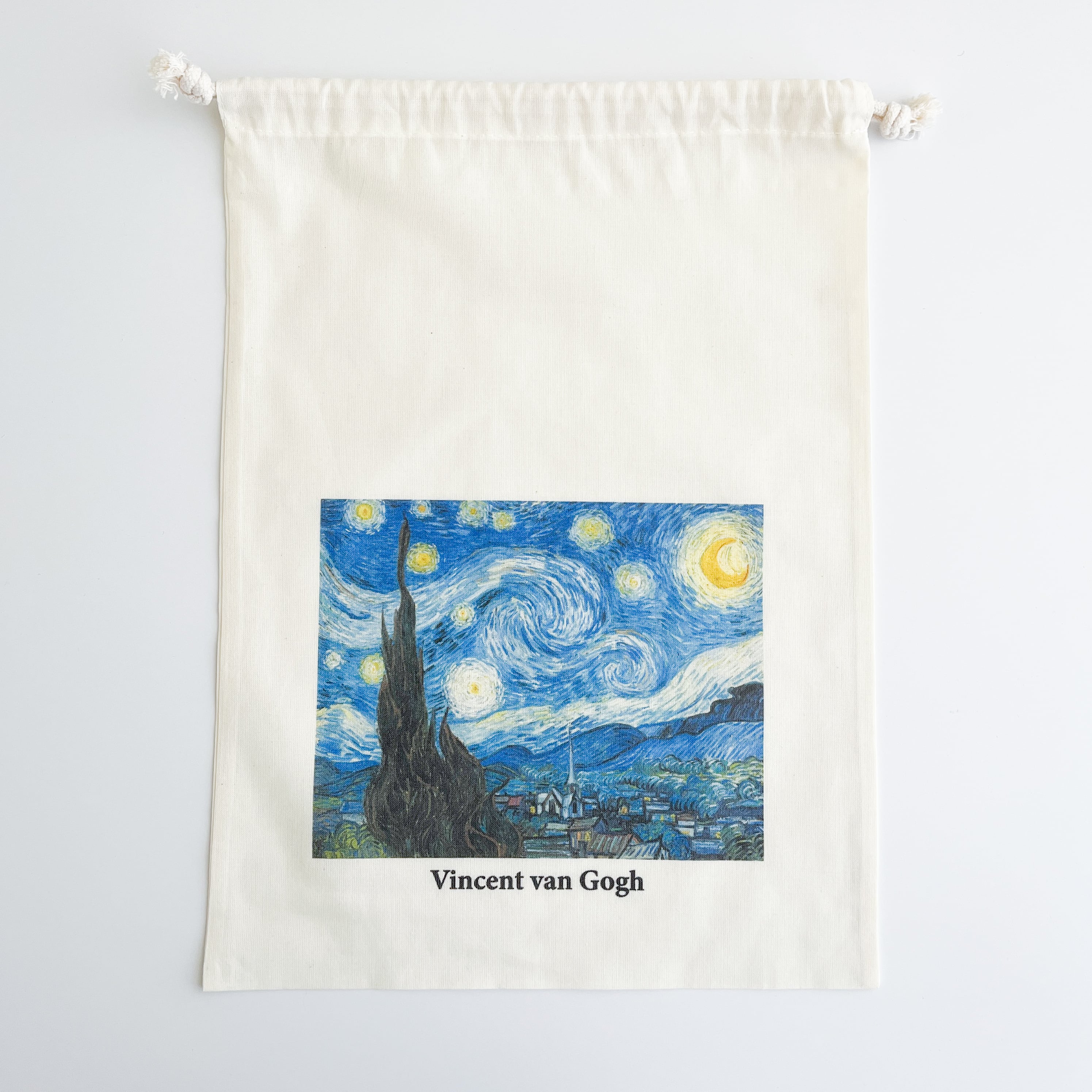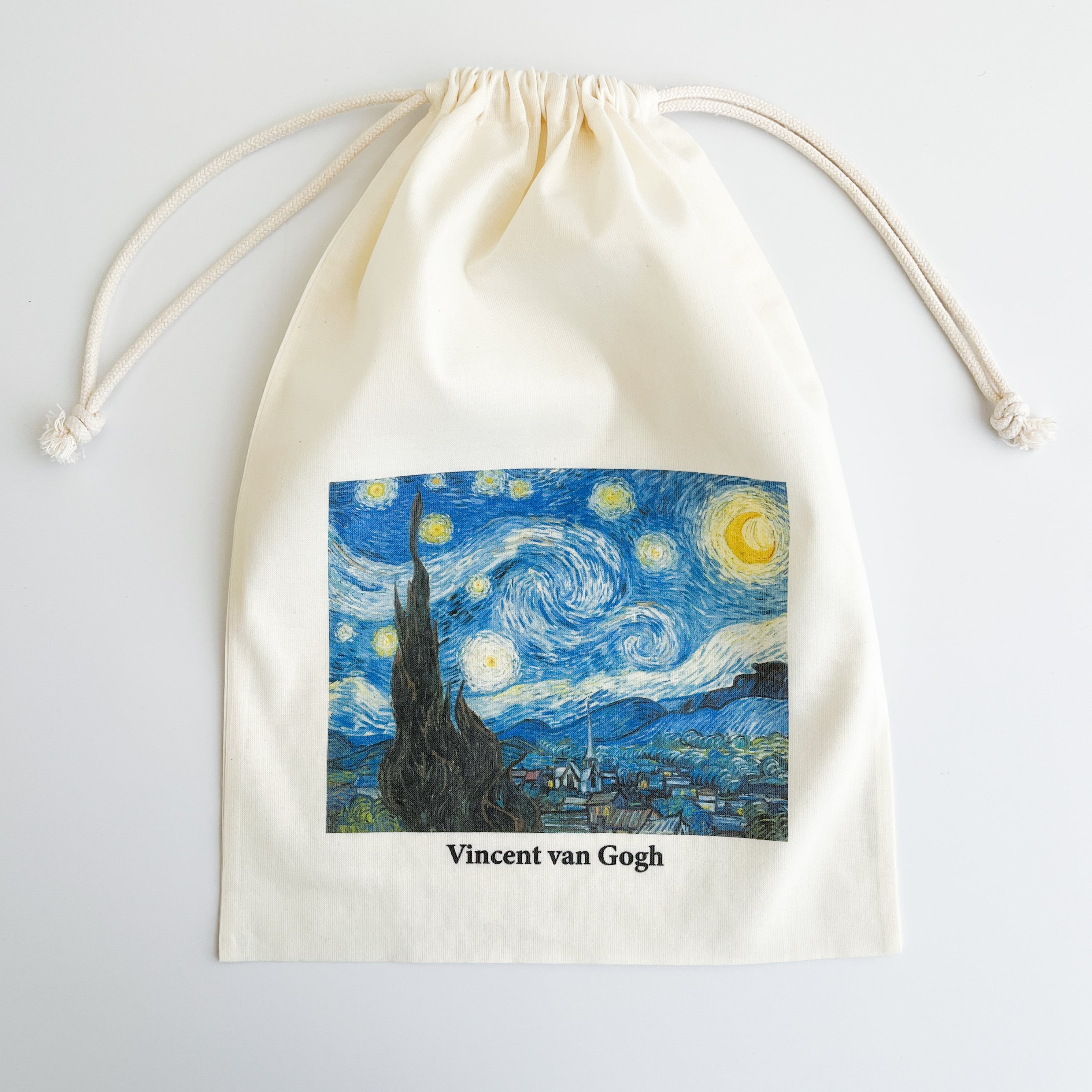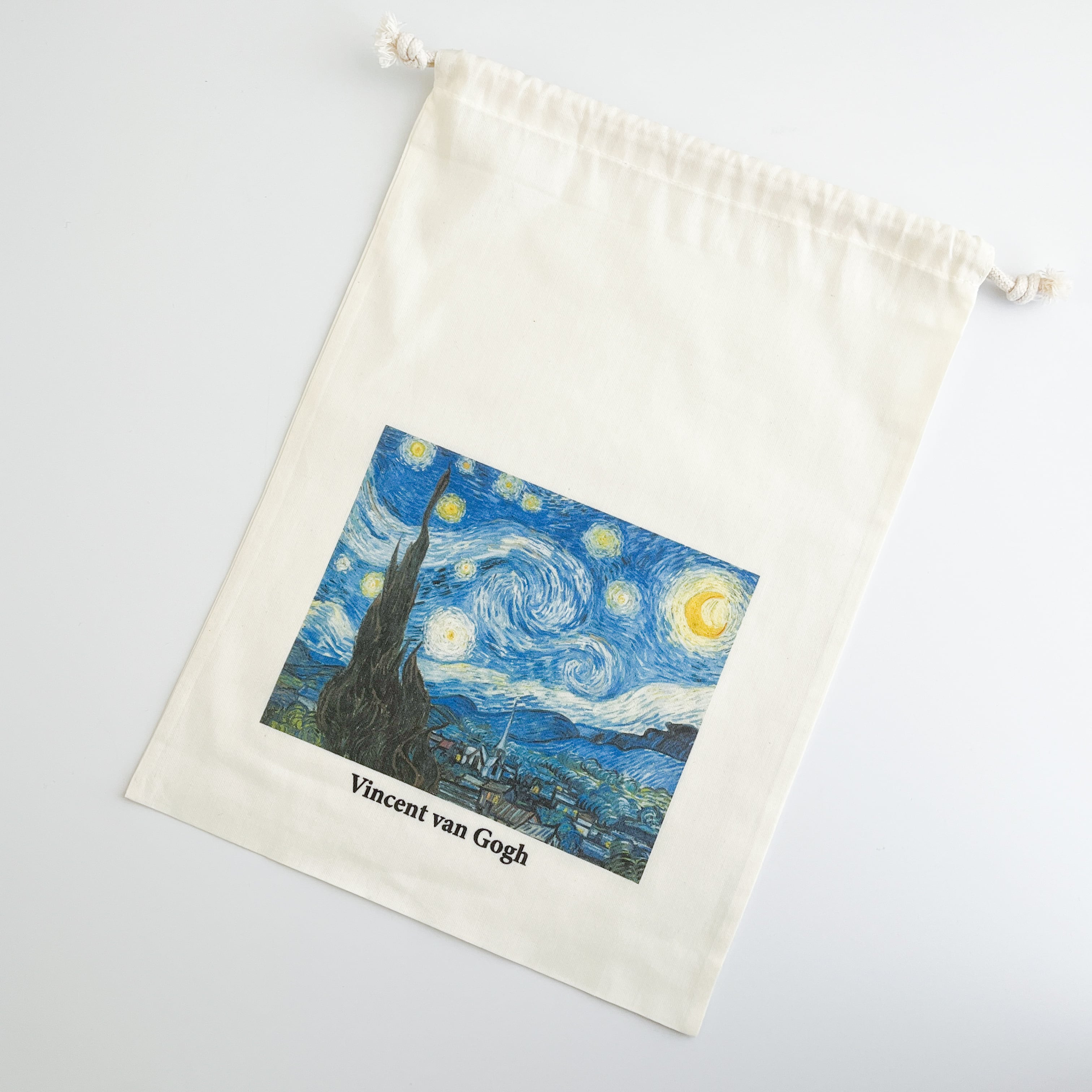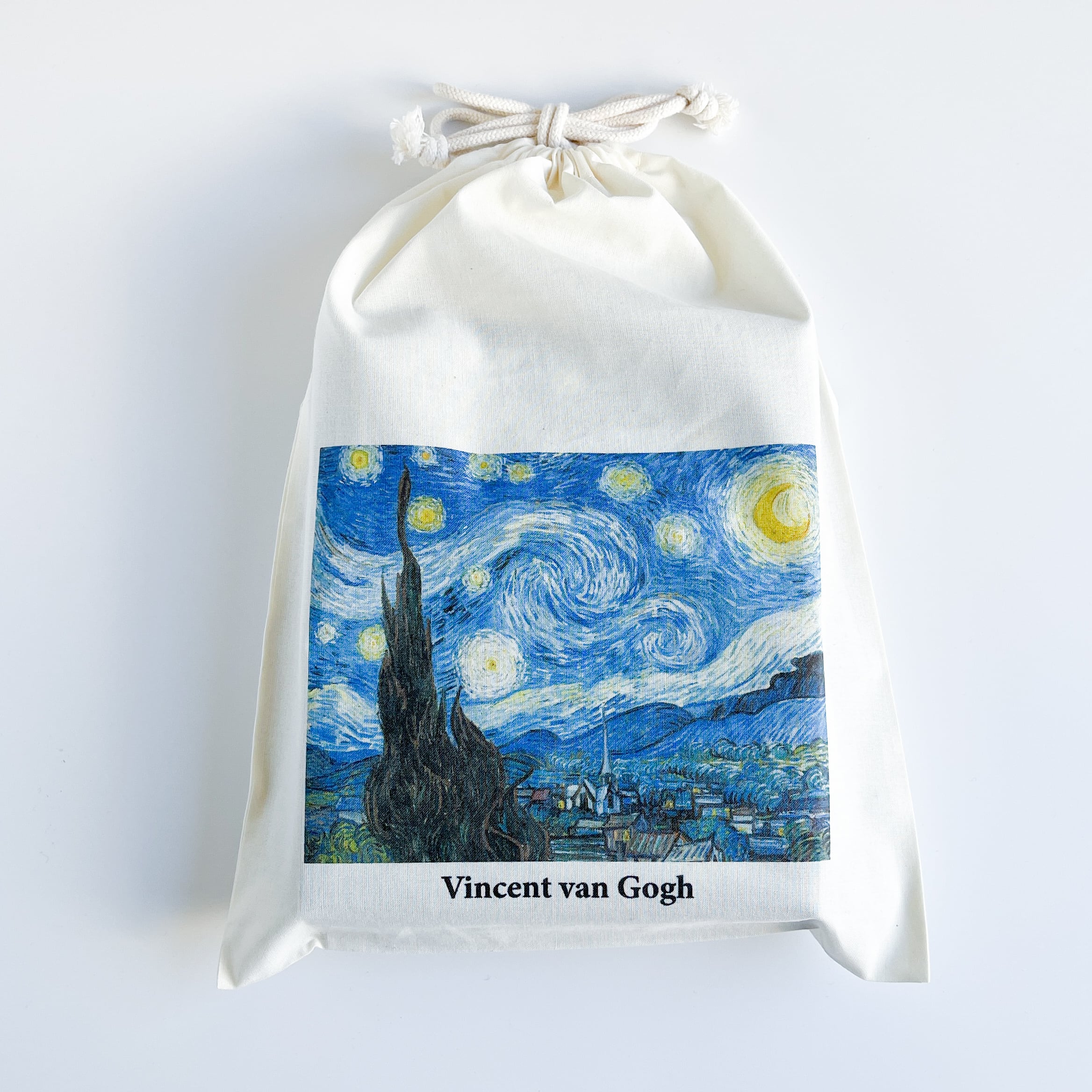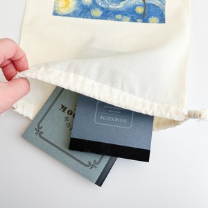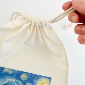 やわらかな布地に夜空の渦が美しく映え、ちょっとした小物を入れるだけで気持ちが華やぎます。A4サイズが入る、少し大きめのシンプルな袋で、バッグインバッグとして、旅行時の収納などに活躍!使うほど愛着のわく巾着です。