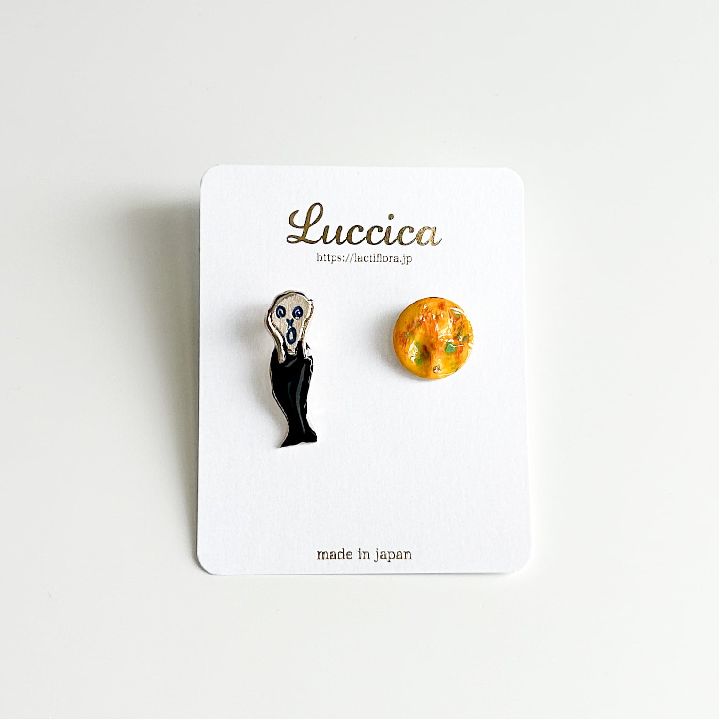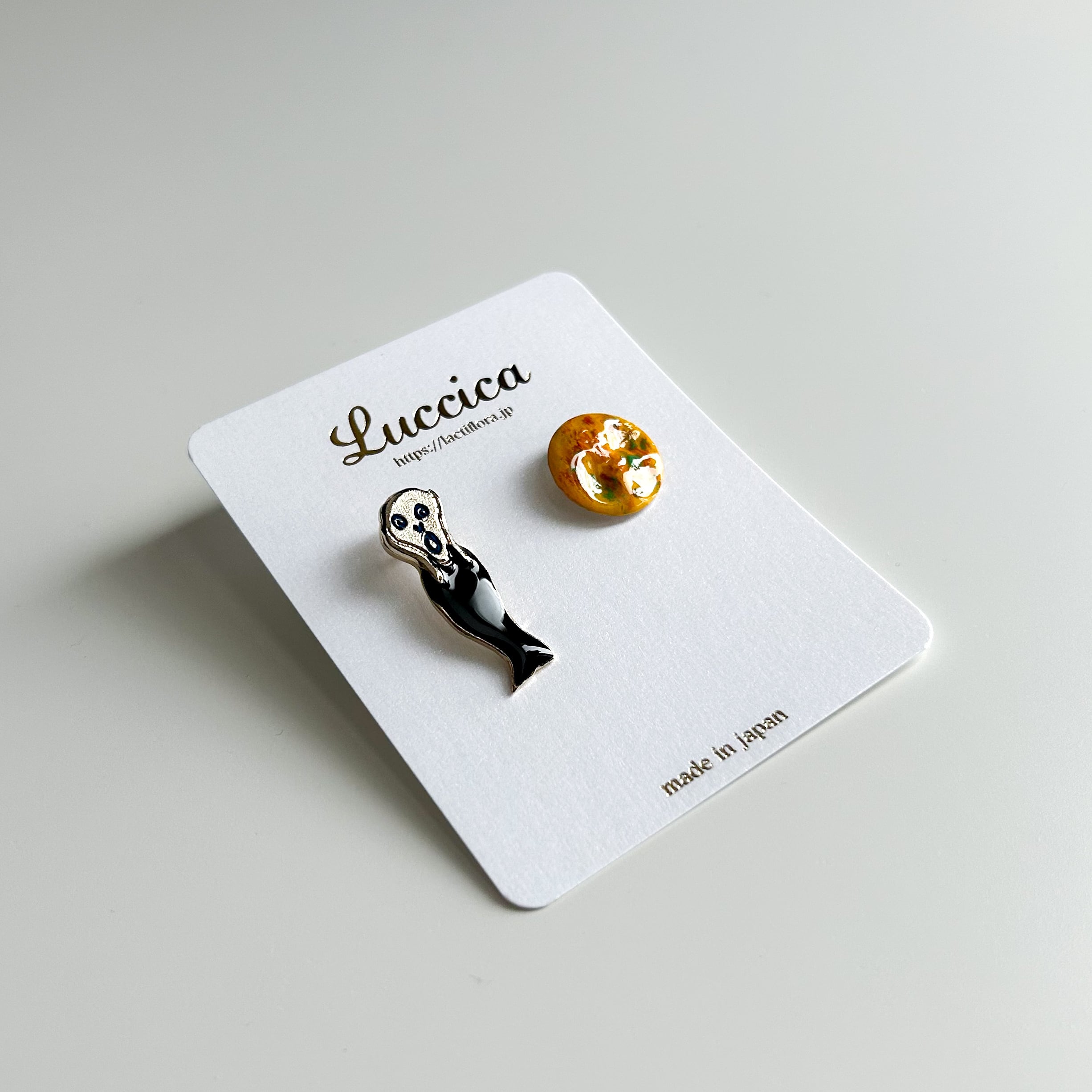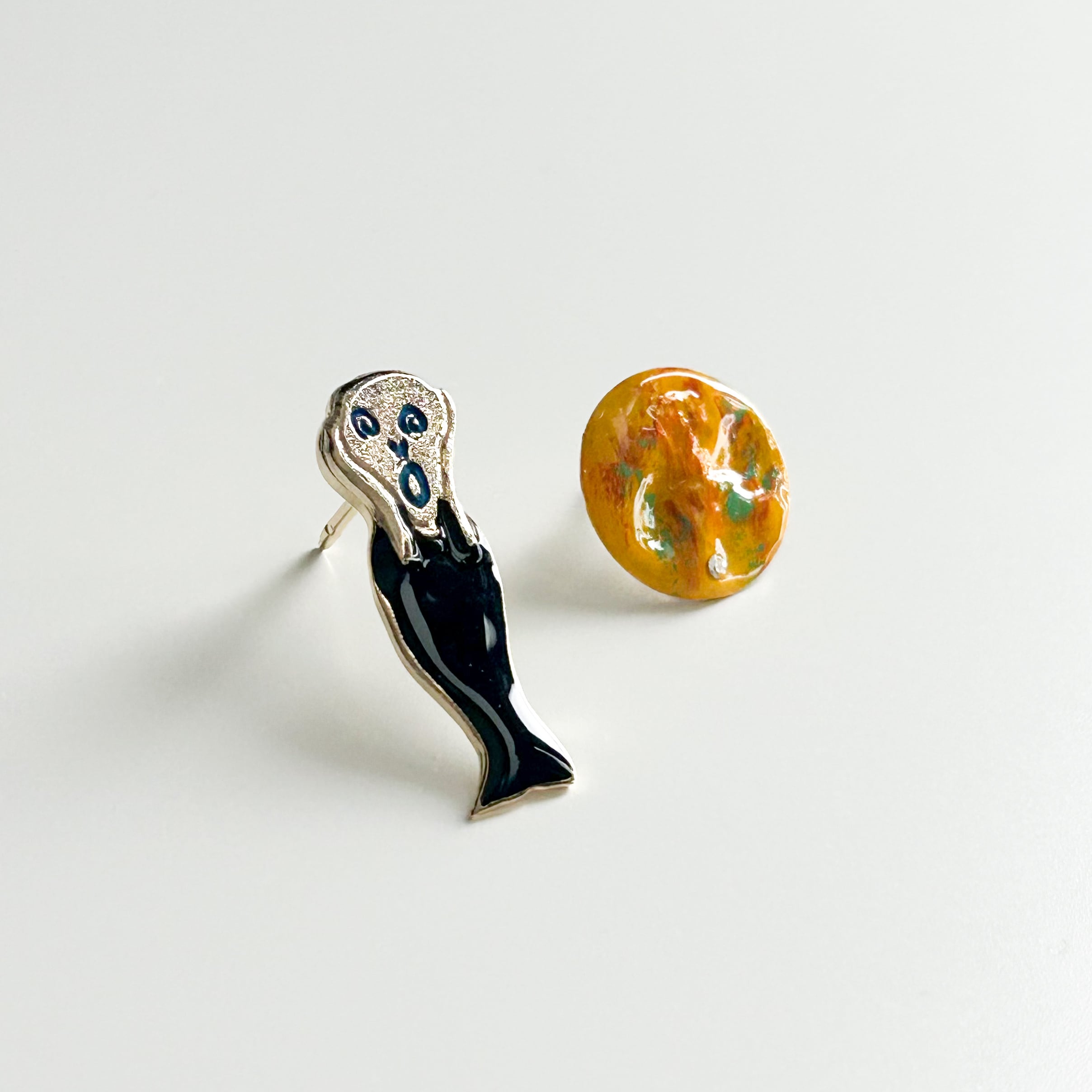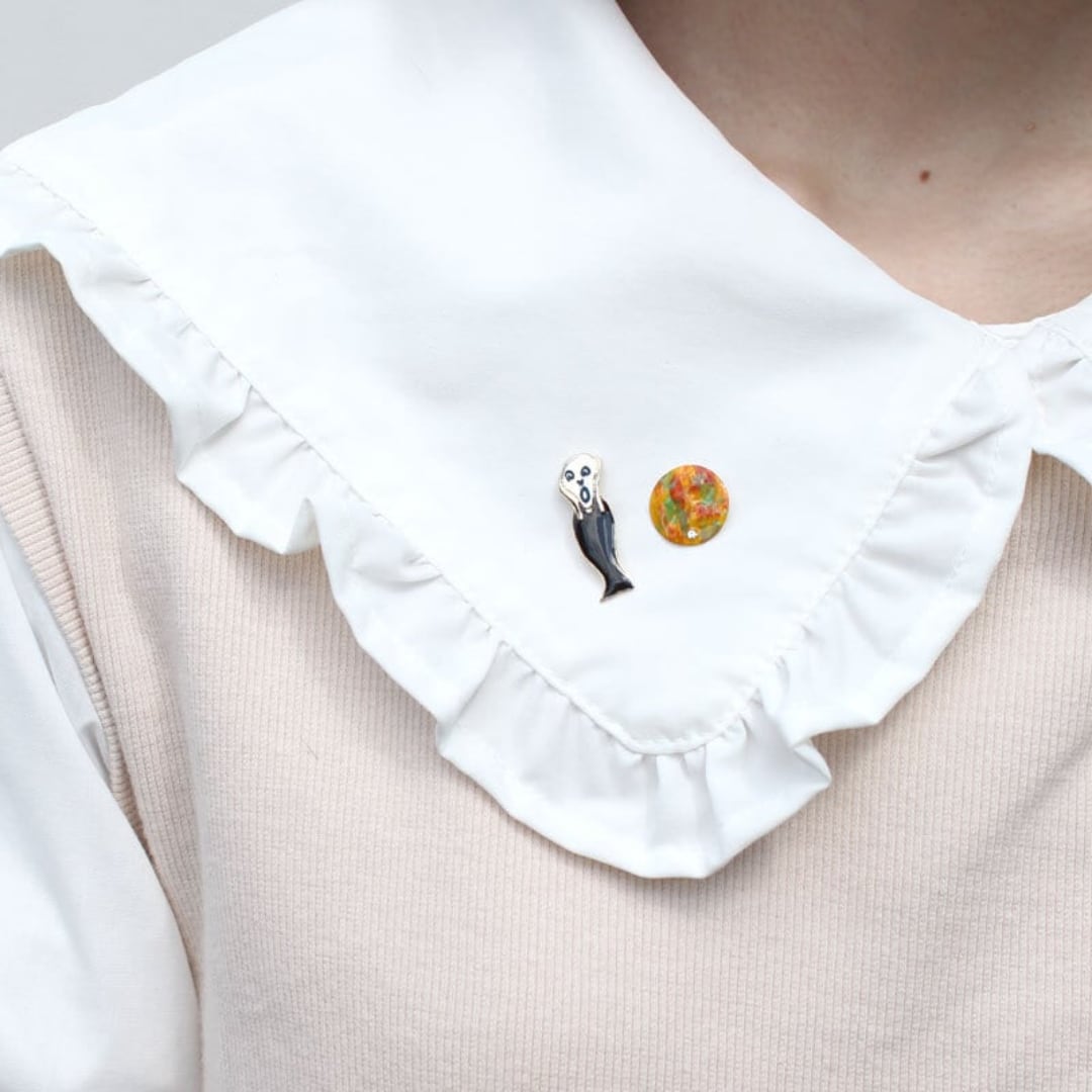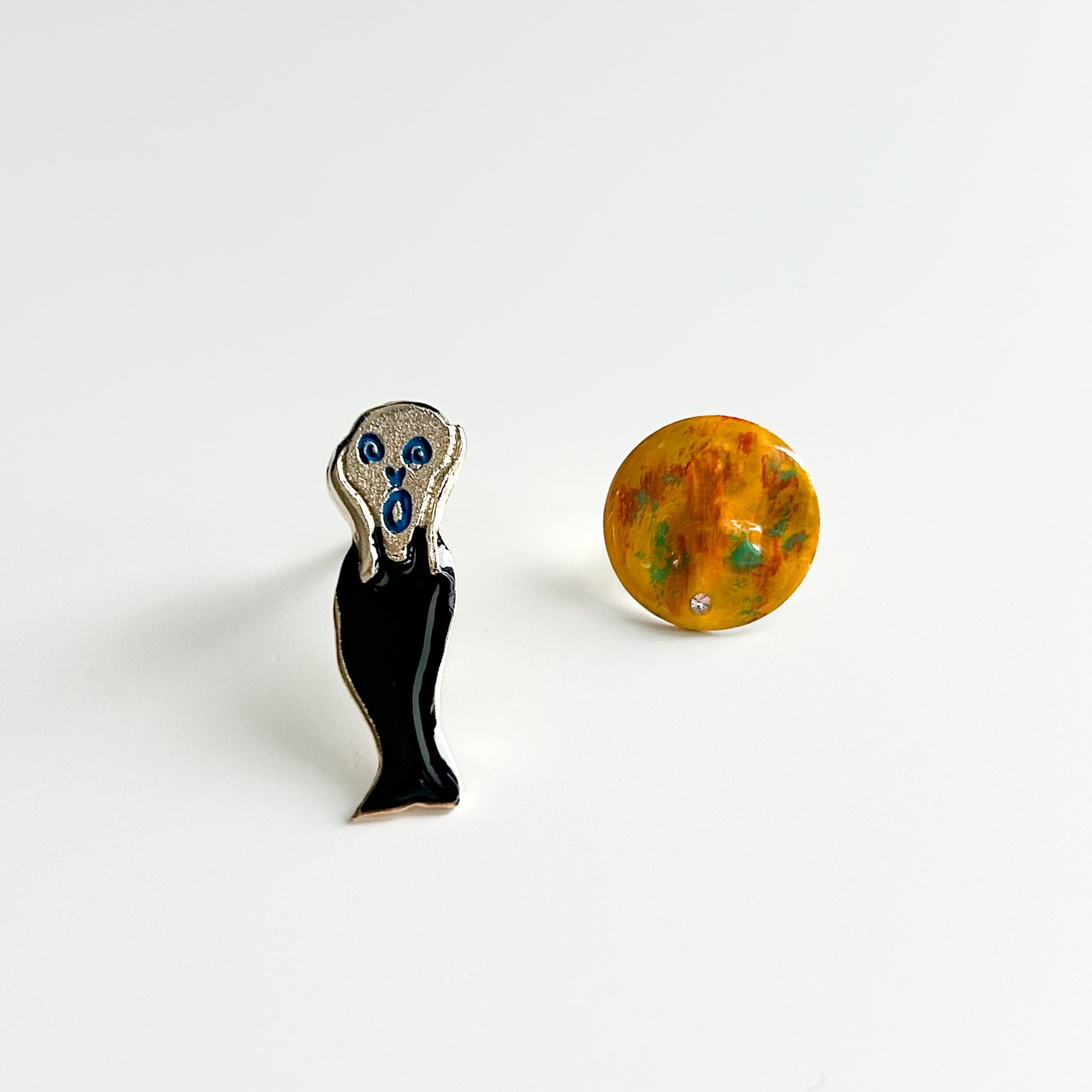 ムンクが描いた世界的名画「叫び」が可愛らしいブローチになりました。頬に手を当てた人物と、背景のうねりをイメージした丸いパーツがセパレートになっていて、立体感が魅力です。