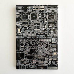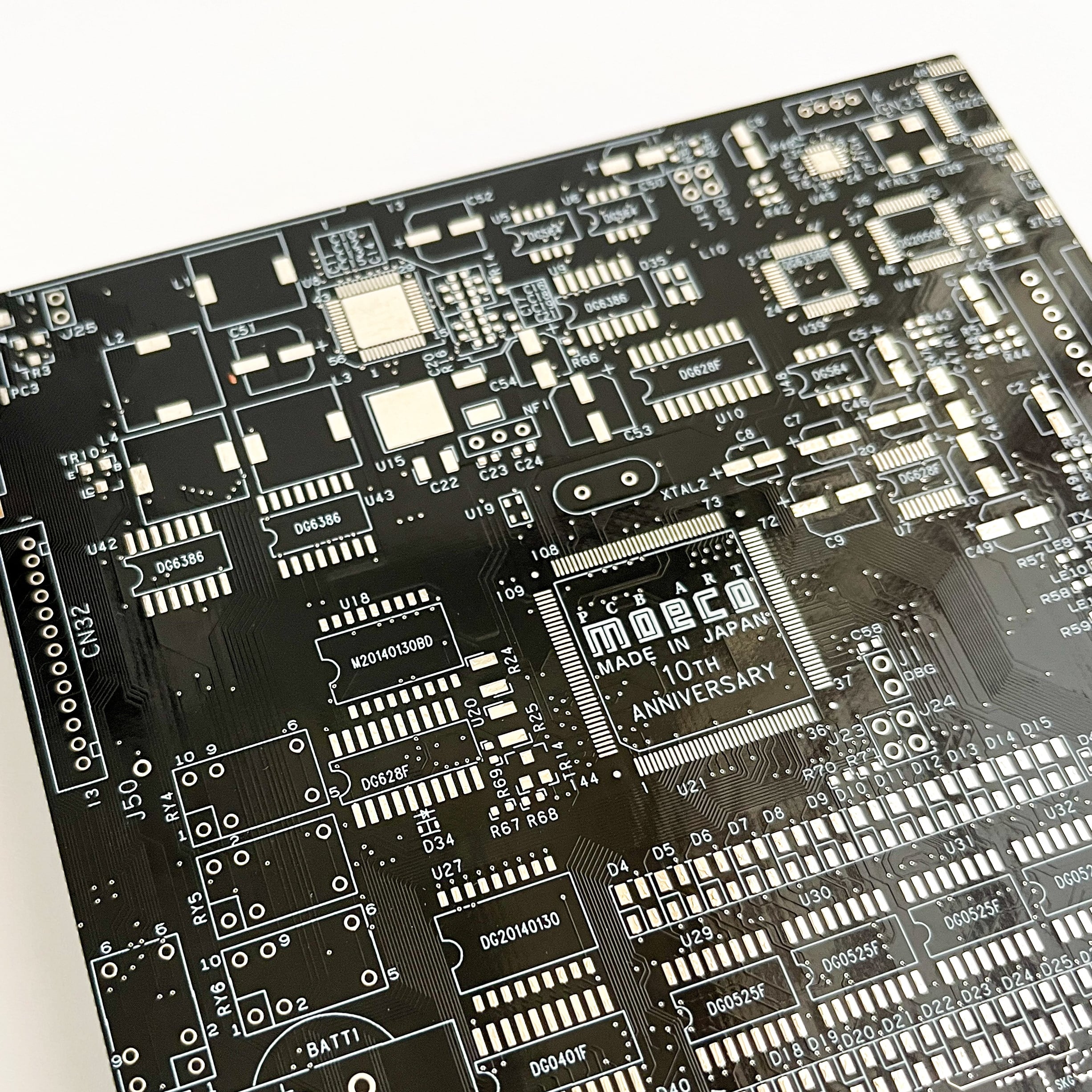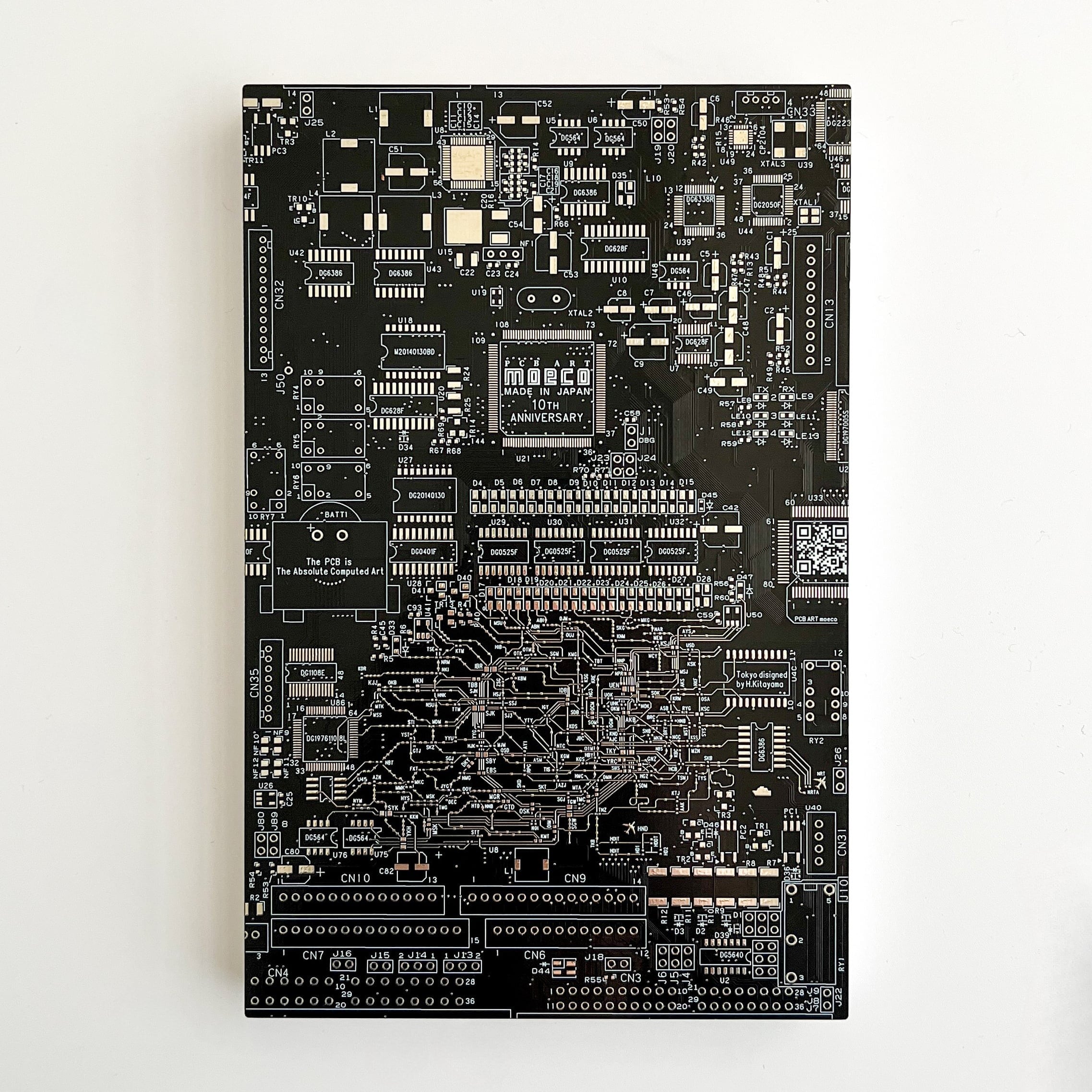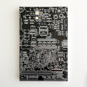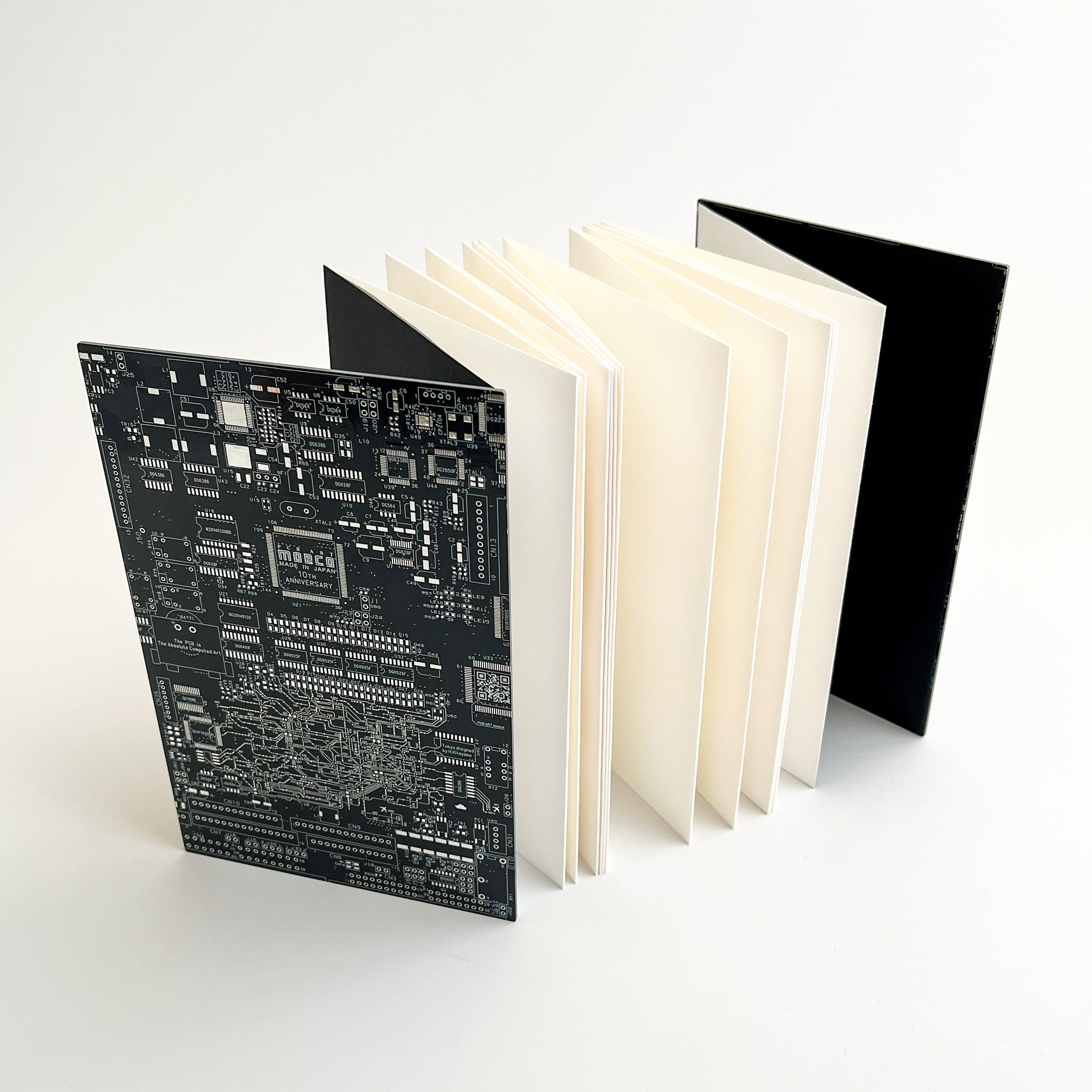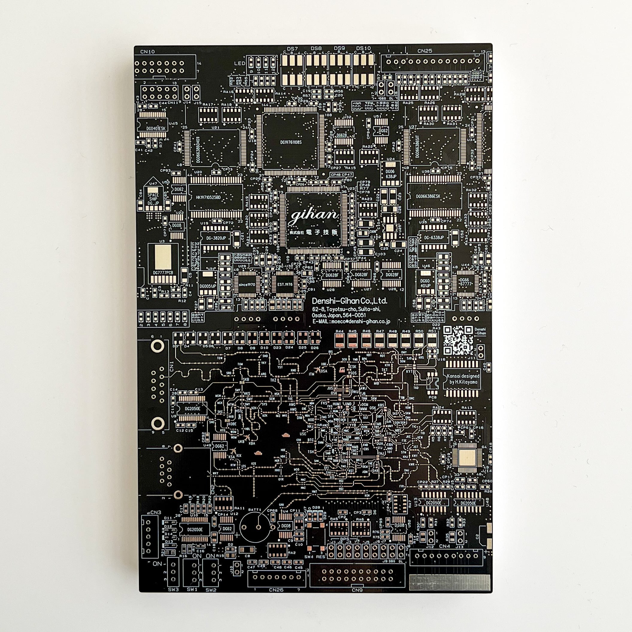 表表紙と裏表紙に本物の基板(188×122×1.6mm)を2枚使った重厚な基板アートの御朱印帳です。基板アートノートブックと御朱印帳のためにイチからデザインしました(ノートブックと御朱印帳は同じデザインです)。表表紙には「東京回路線図」、裏表紙には「関西回路線図」をさりげなくデザインしています。