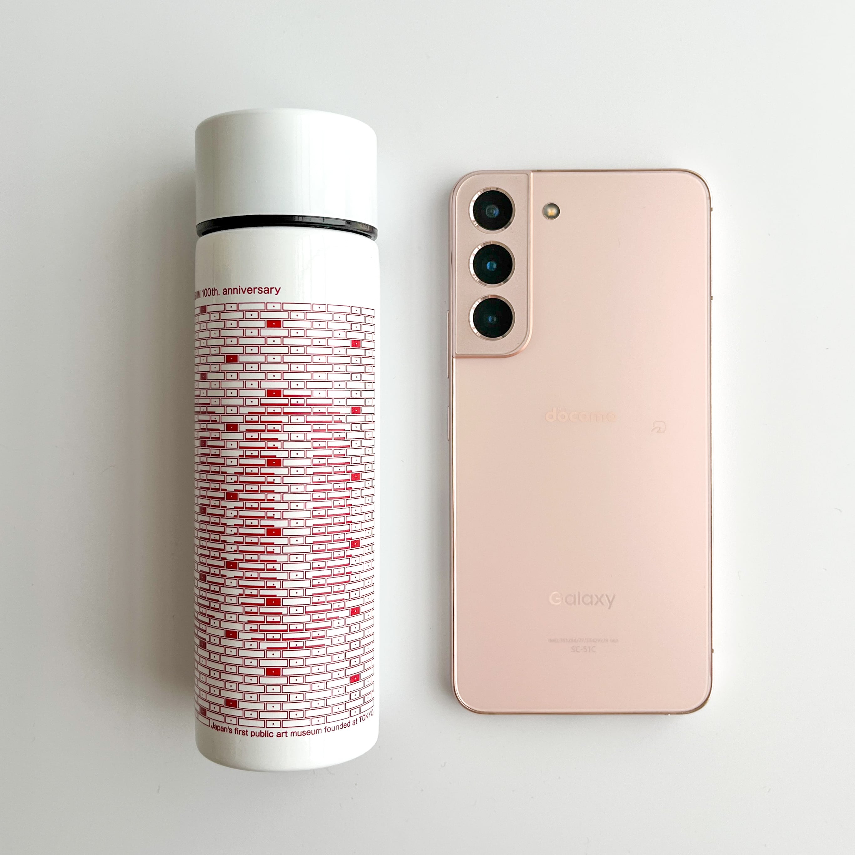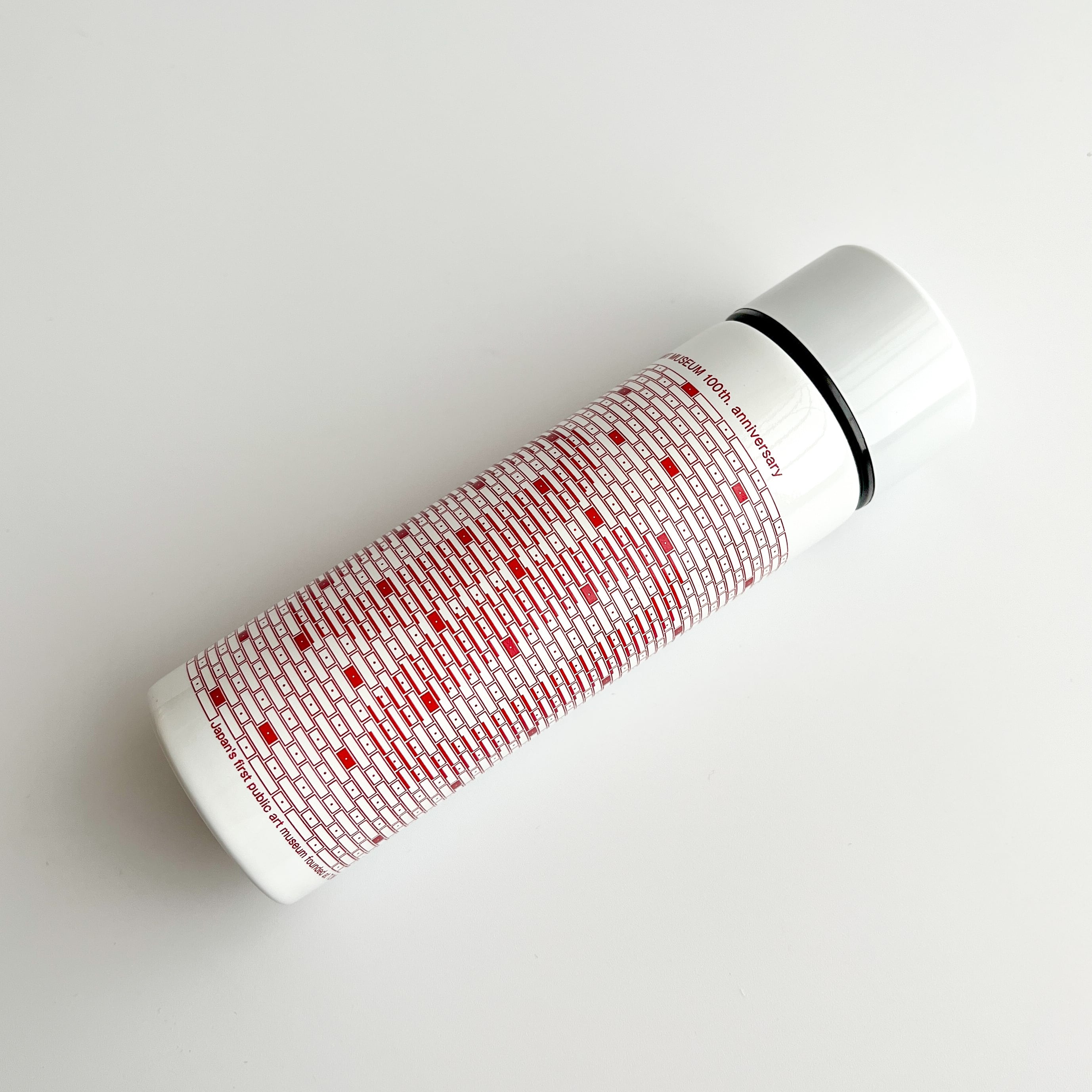 東京都美術館開館100周年を記念した、メモリアルなオリジナルグッズ。建物を彩る印象的な赤いタイルを背景に、100周年の特別デザインをあしらった、携帯に便利なポケットサイズのステンレスボトルです。