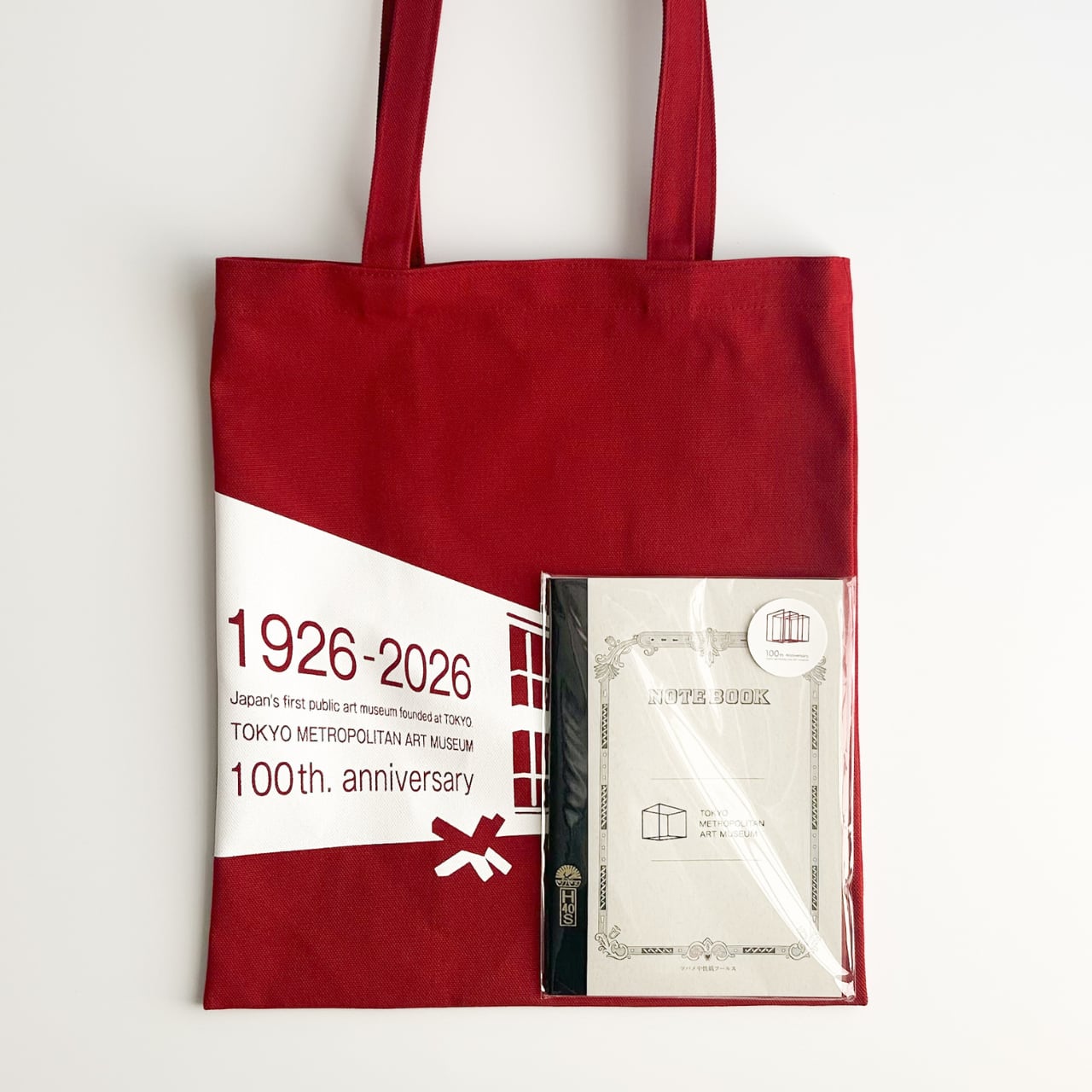 東京都美術館開館100周年を記念した、メモリアルなオリジナルグッズ。表面には、100年の歴史を感じる、赤タイルが特徴的な建物と、象徴的なモニュメント。裏面には、100周年の記念ロゴがデザインされたトートバッグです。