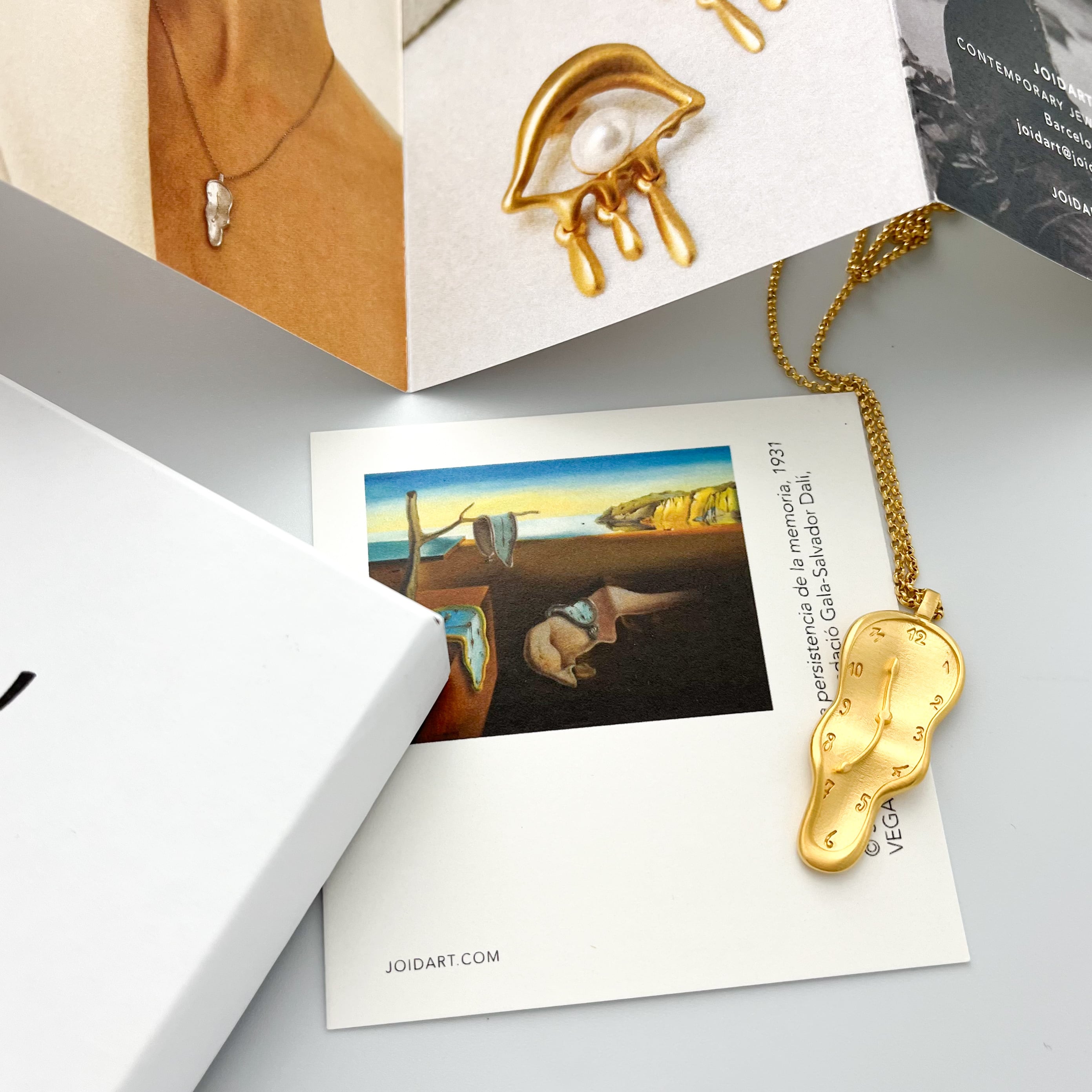 ダリの作品「記憶の固執」のモチーフがネックレスに。個性的ながら落ち着いたデザインと、24Kゴールドコーティングの上質な素材で、大人のおしゃれを楽しめます。シュルレアリスムの独創的なフォルムが表現されたジュエリーです。